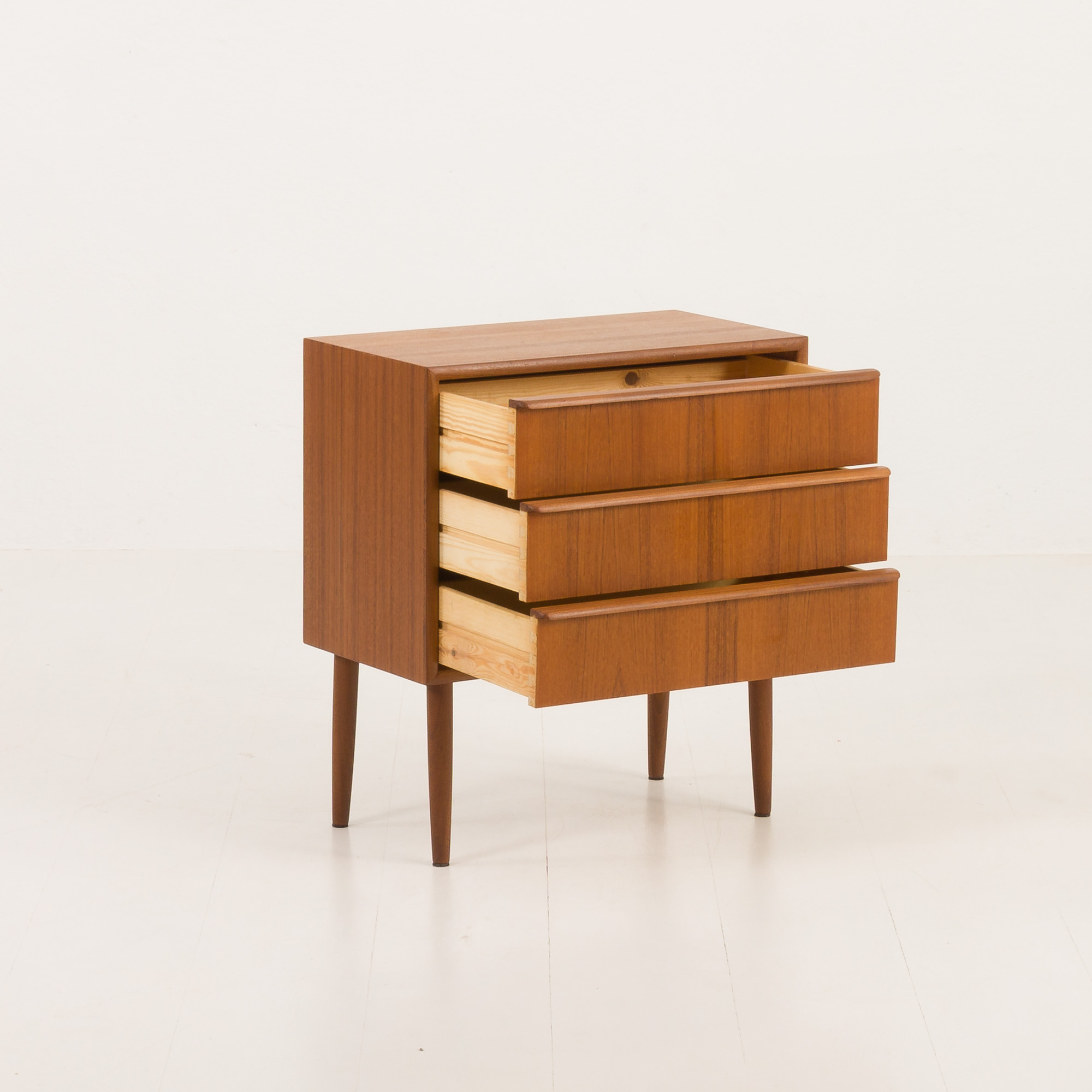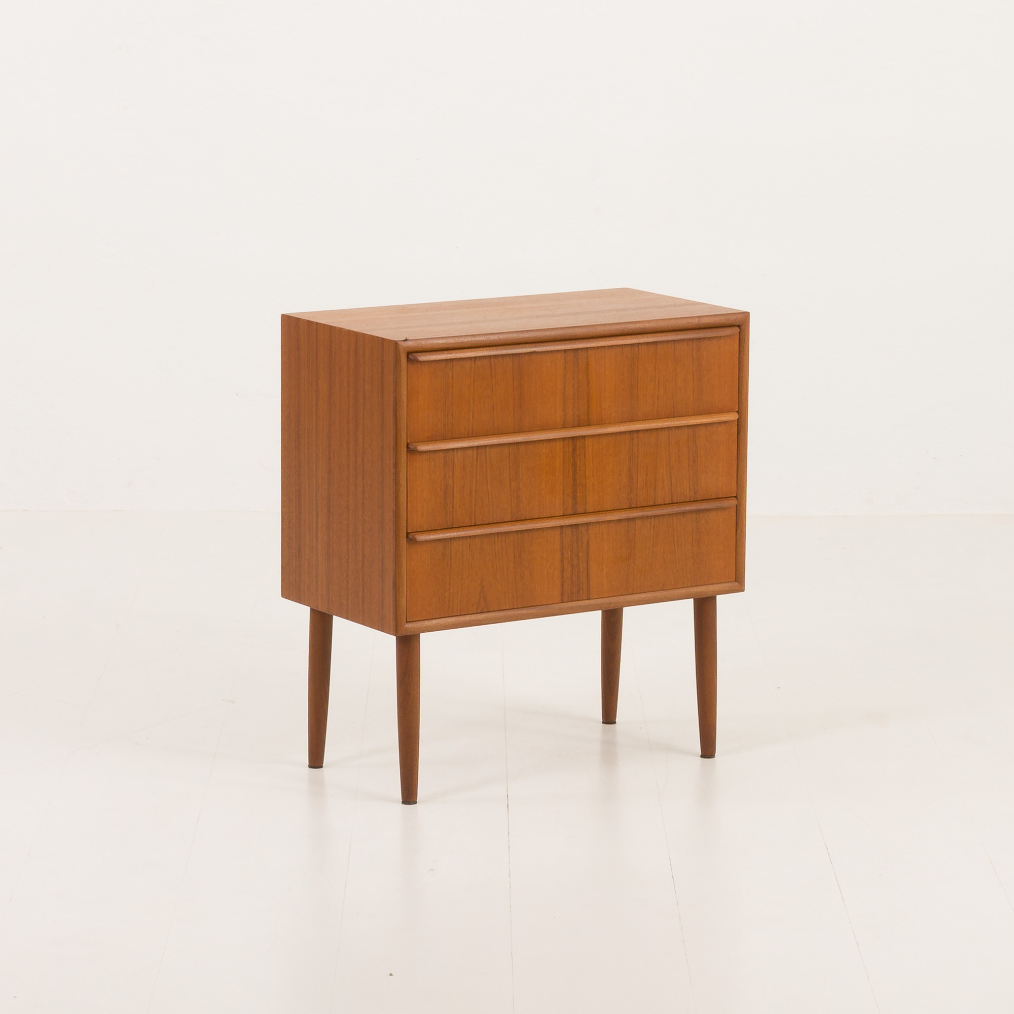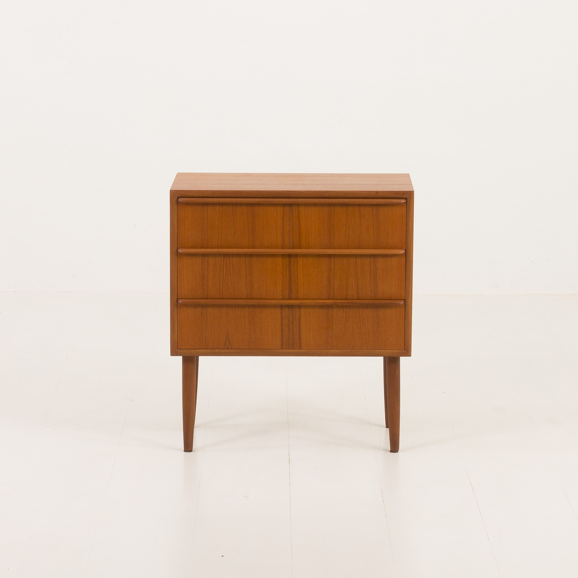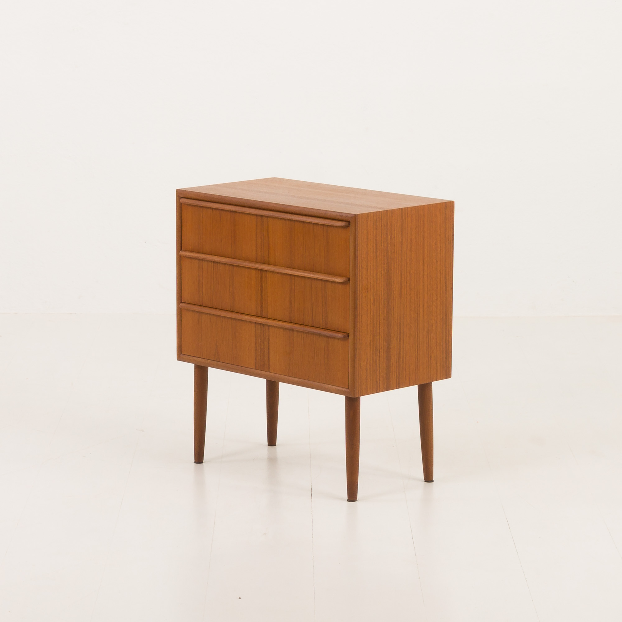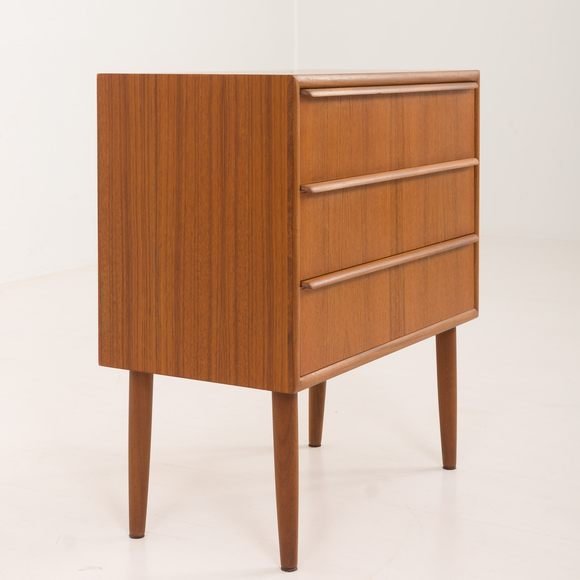 Small teak dresser with three drawers and solid teak handles made by a Danish manufacturer in the 1960s. Most likely designed as an entryway chest but could also be used as a side table or a nightstand. Veneered in teak with solid teak details. It has 3 clean scentless drawers, 9 cm high each. Tapered solid teak legs are detachable, providing more convenient transport. The drawers are clean and work smoothly. It is a typical example of Danish mid-century modern design. This piece is in fantastic vintage condition, refreshed with Danish Oil.