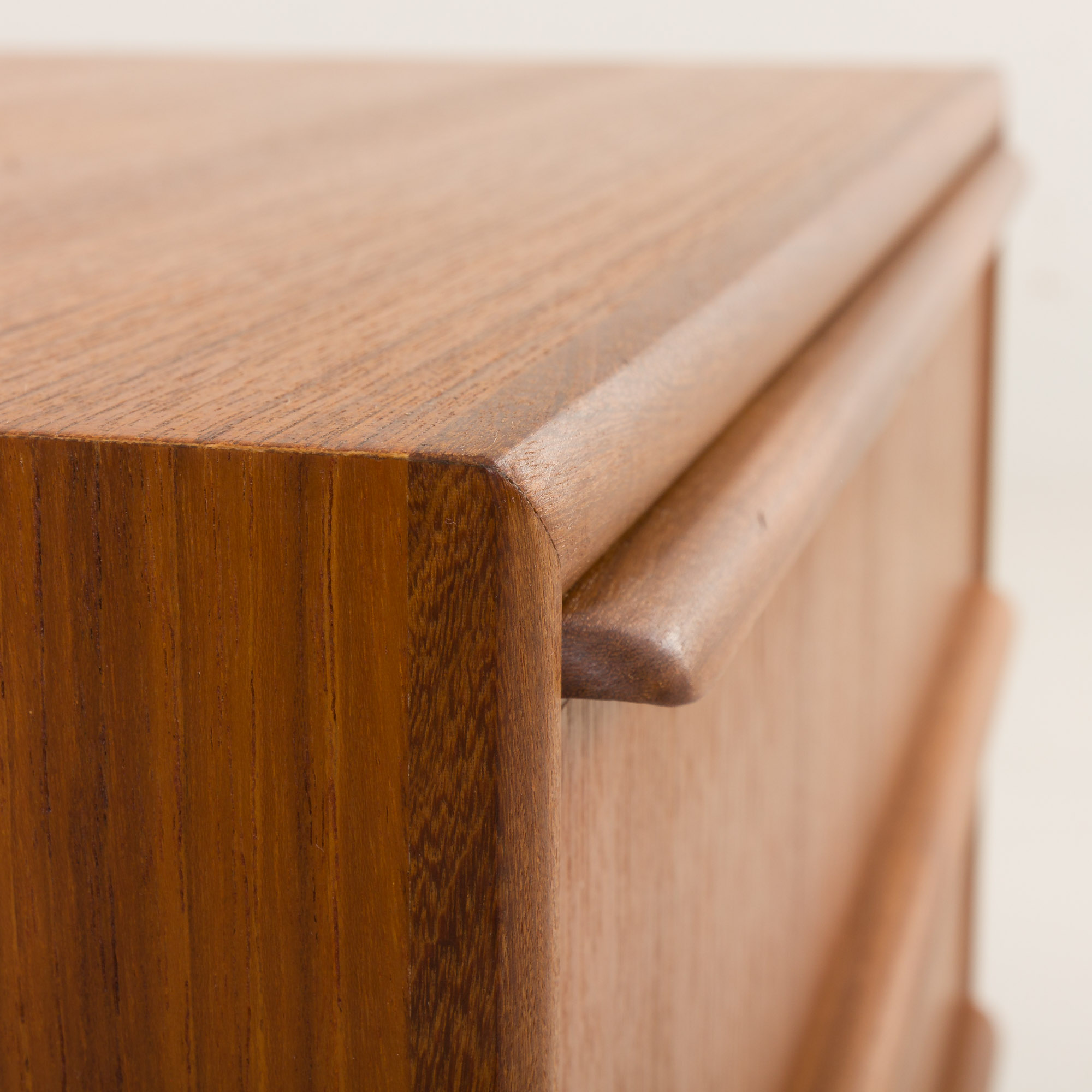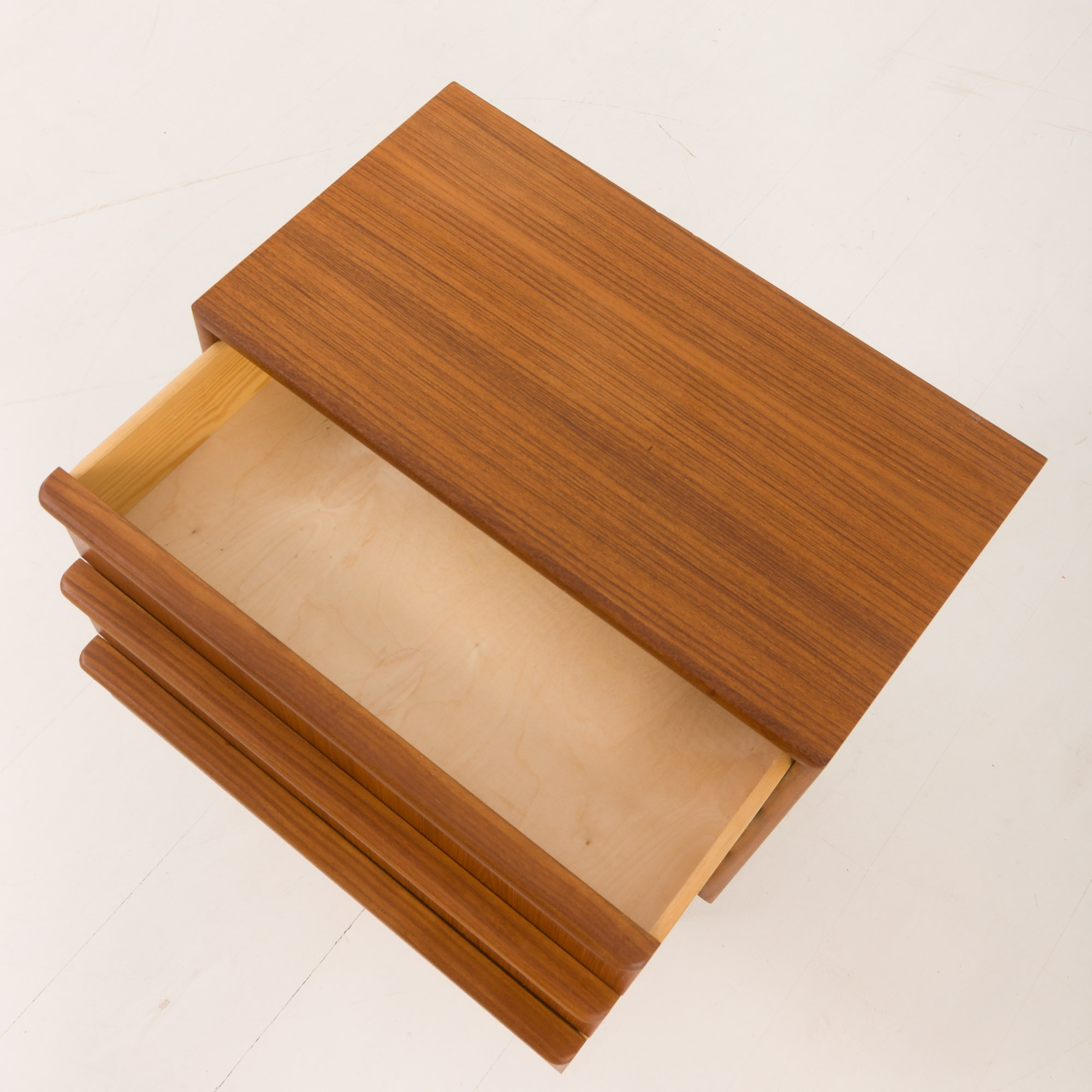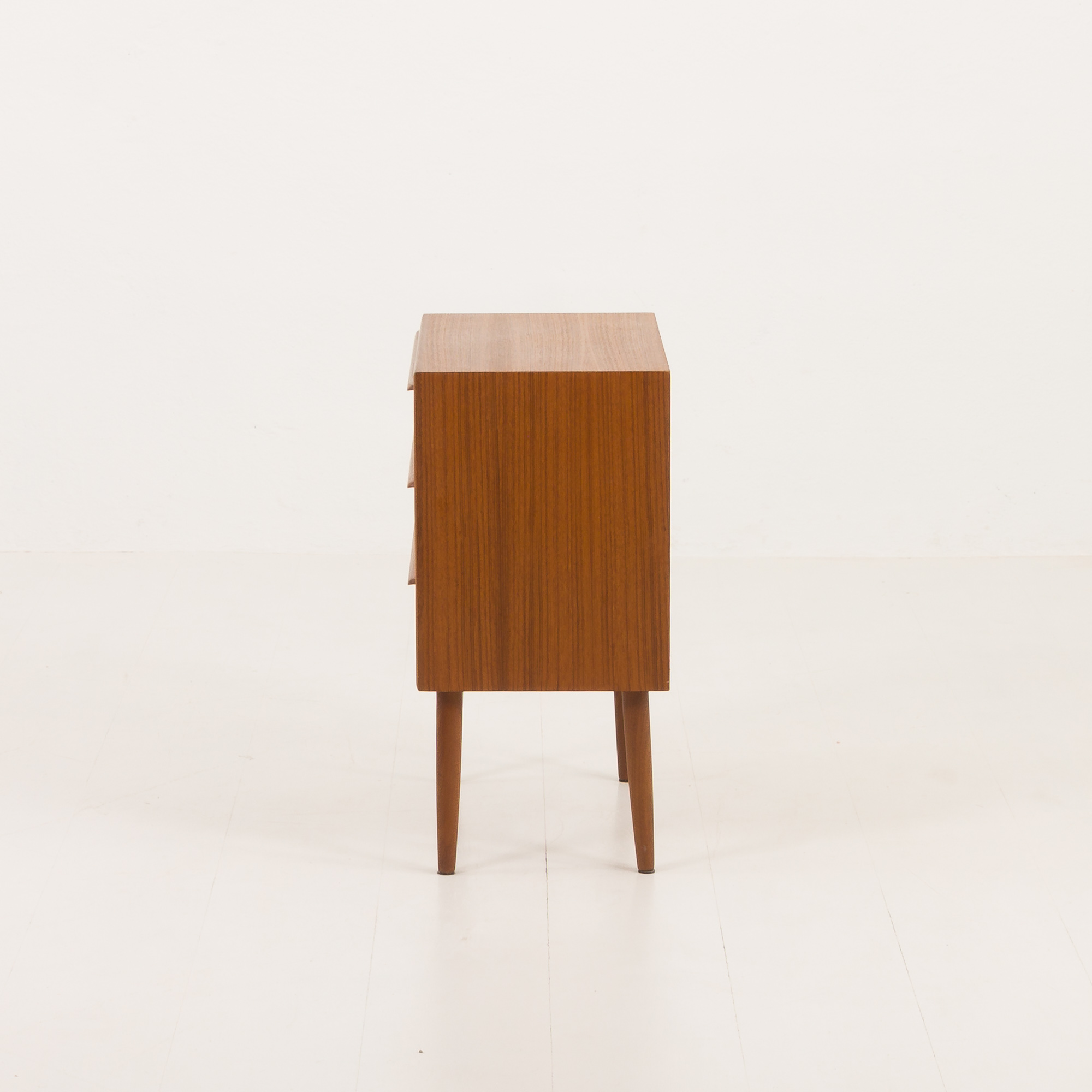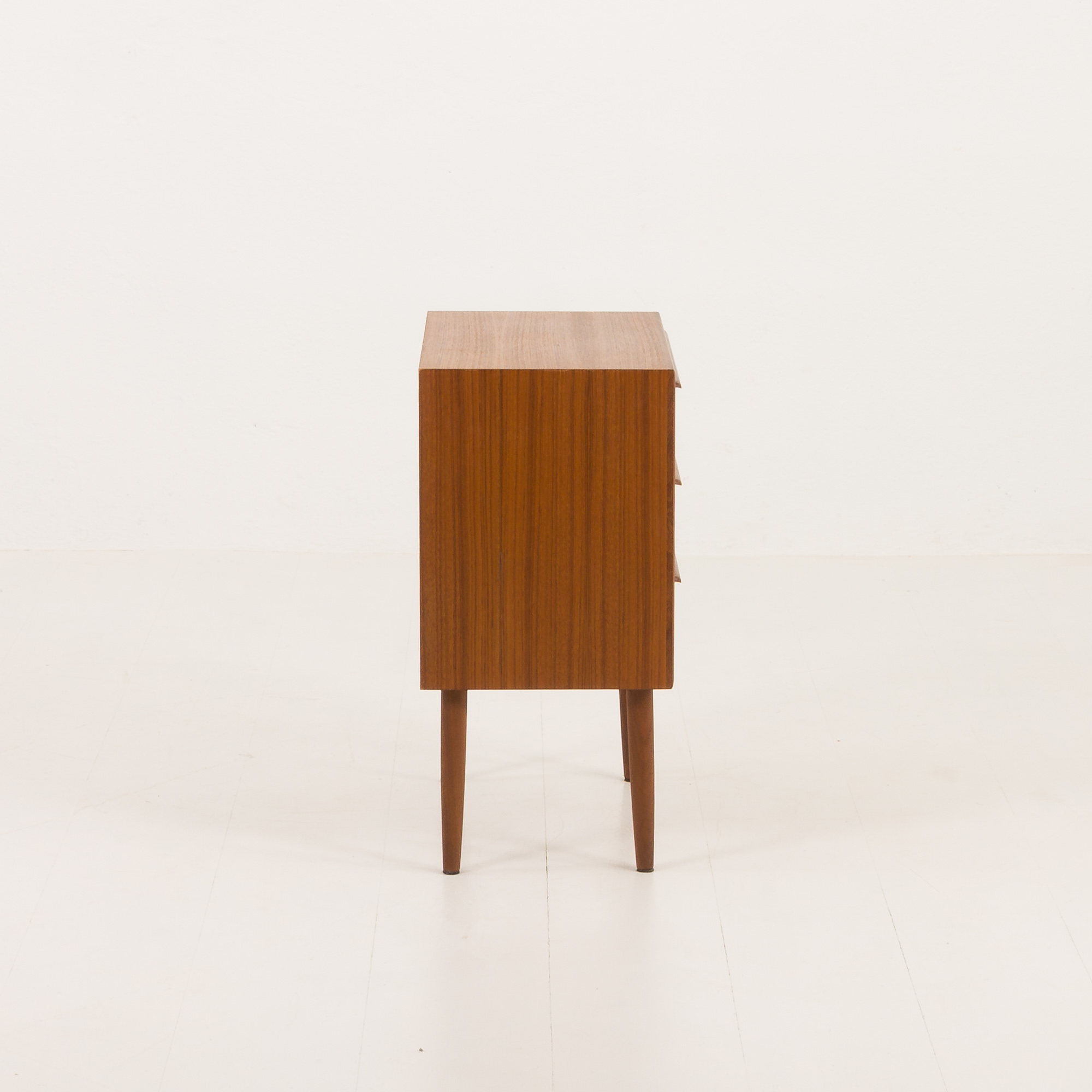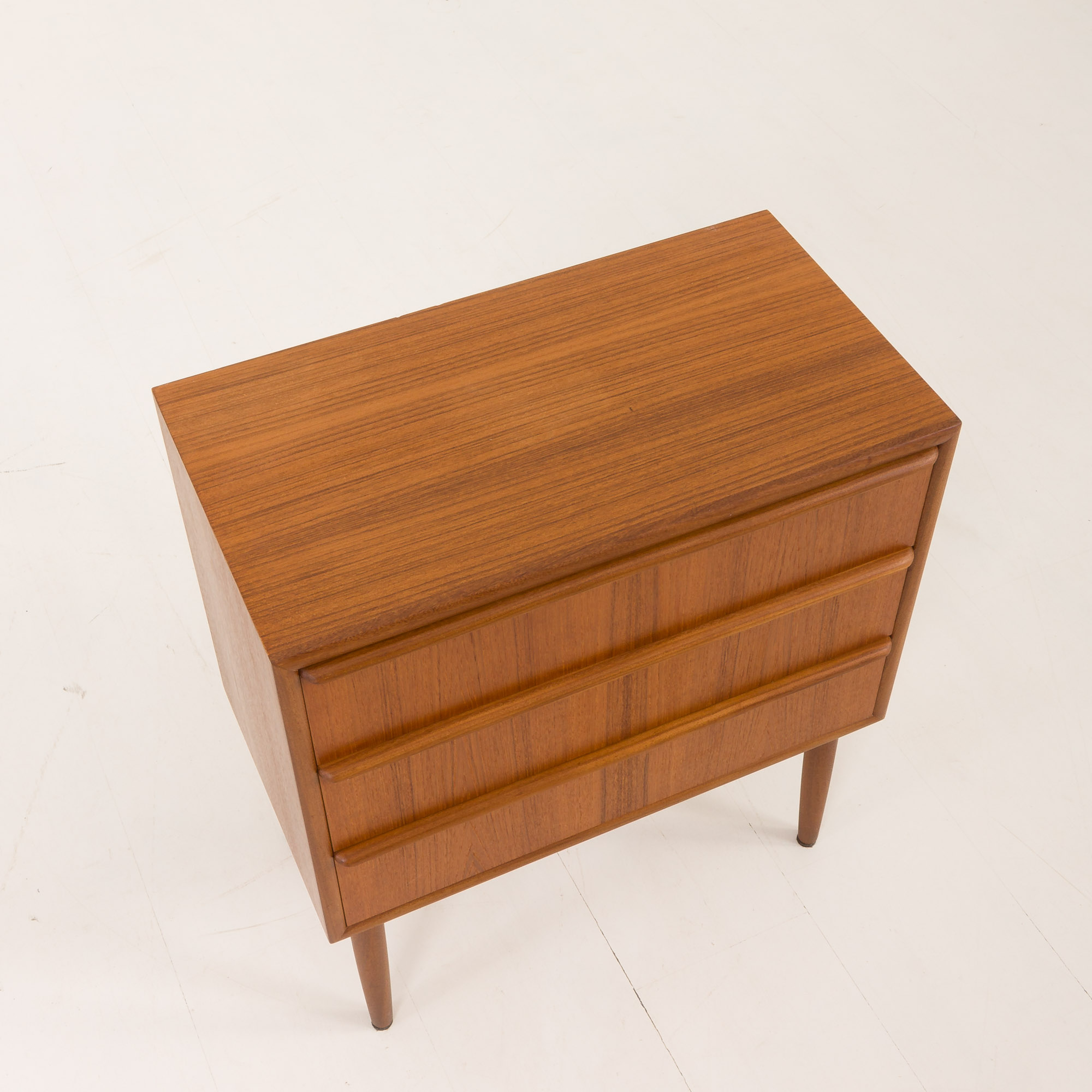 Small teak dresser with three drawers and solid teak handles made by a Danish manufacturer in the 1960s. Most likely designed as an entryway chest but could also be used as a side table or a nightstand. Veneered in teak with solid teak details. It has 3 clean scentless drawers, 9 cm high each. Tapered solid teak legs are detachable, providing more convenient transport. The drawers are clean and work smoothly. It is a typical example of Danish mid-century modern design. This piece is in fantastic vintage condition, refreshed with Danish Oil.