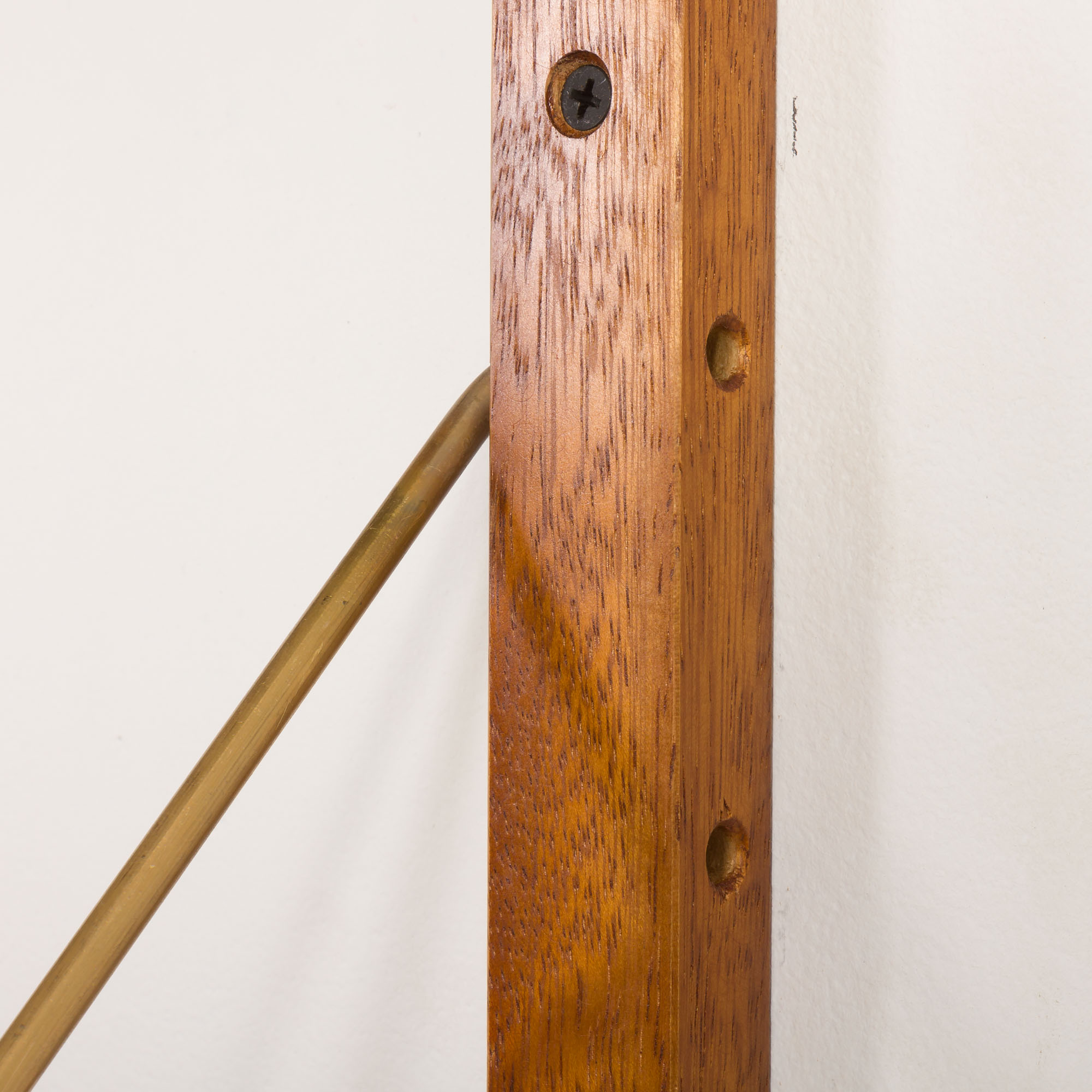 This shelving system is entirely modular; all parts can be interchanged and set up as desired, lower, higher, using an easy system with brass hangers inserted into solid wood rails. The shown setup is just an example.