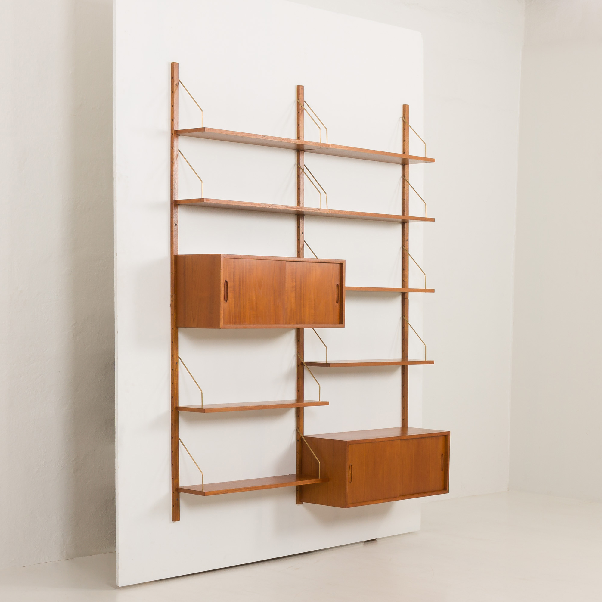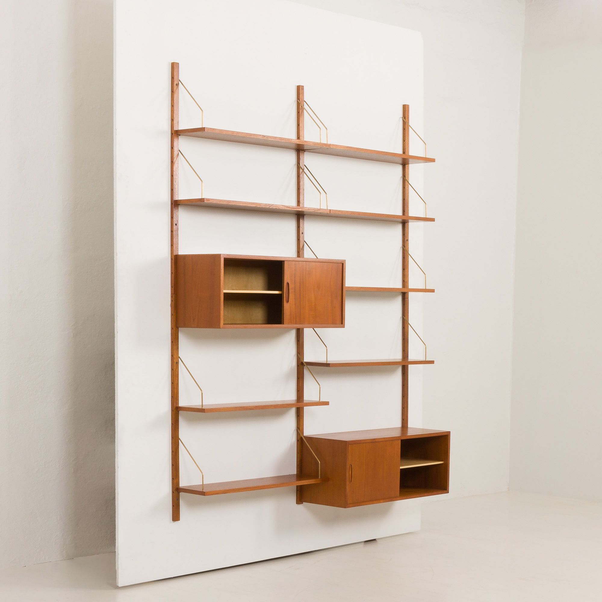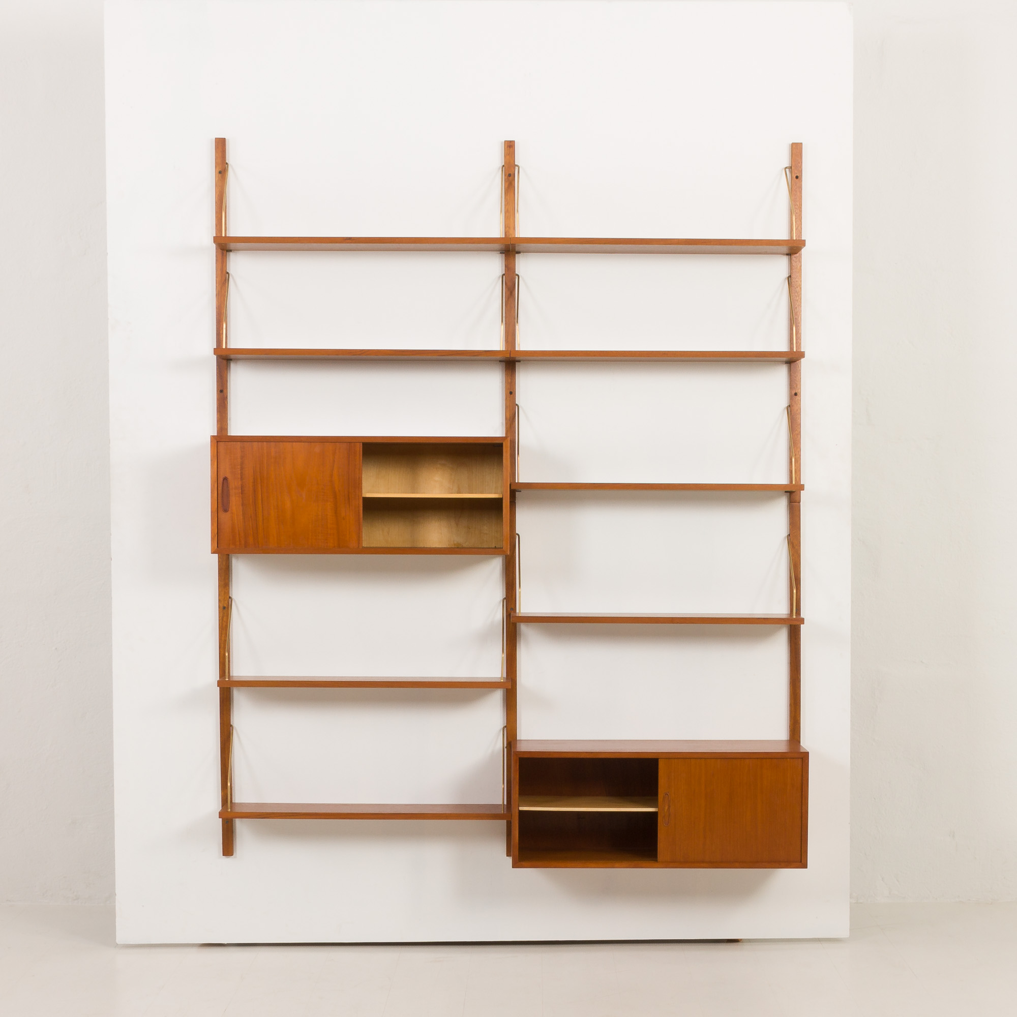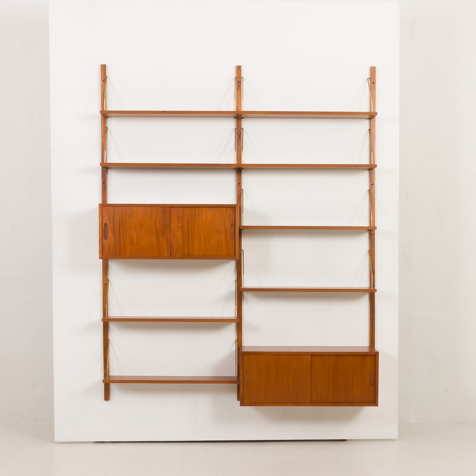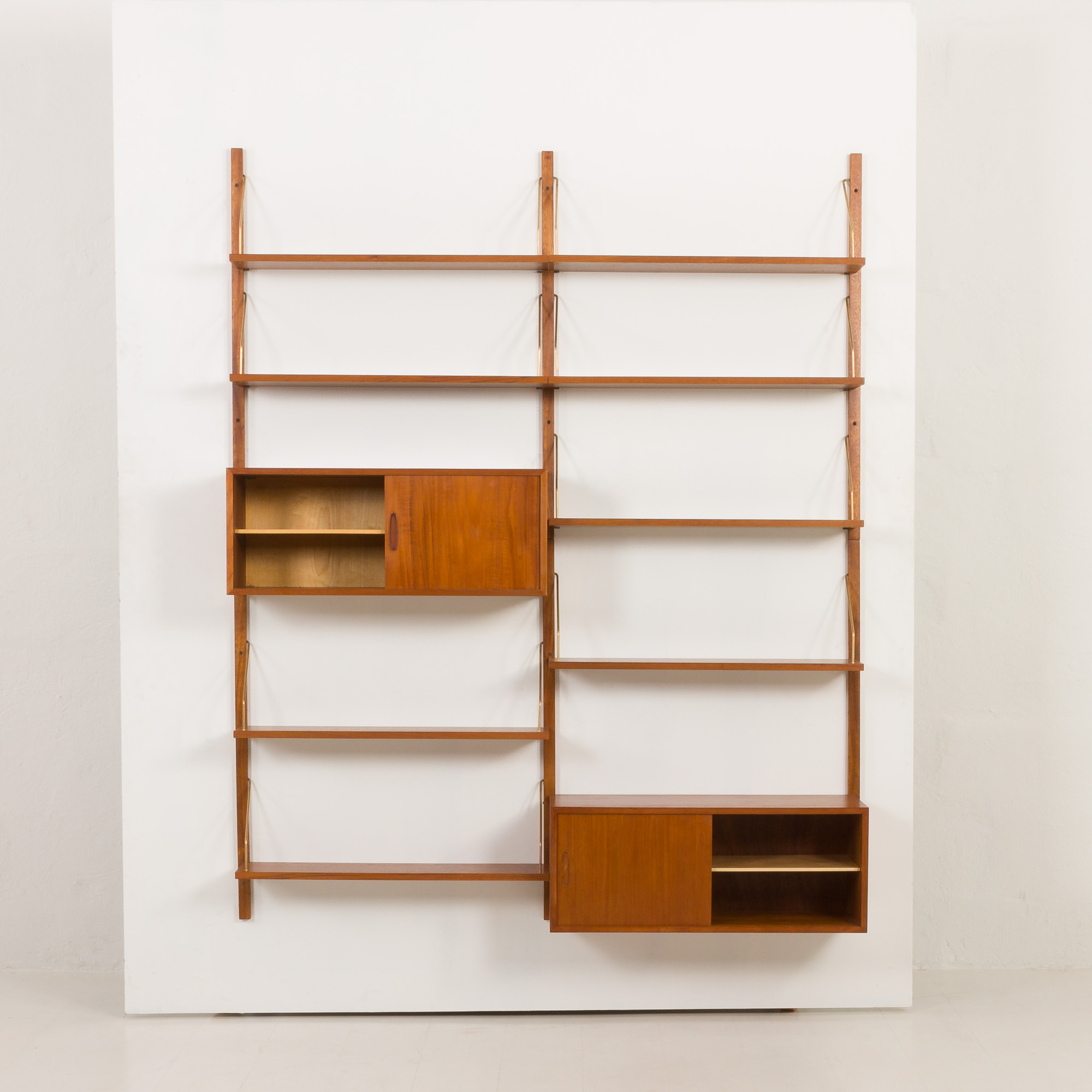 Visually appealing and extremely functional, this shelving system in teak was designed in the style of 1970s projects by Poul Cadovius for Cado.