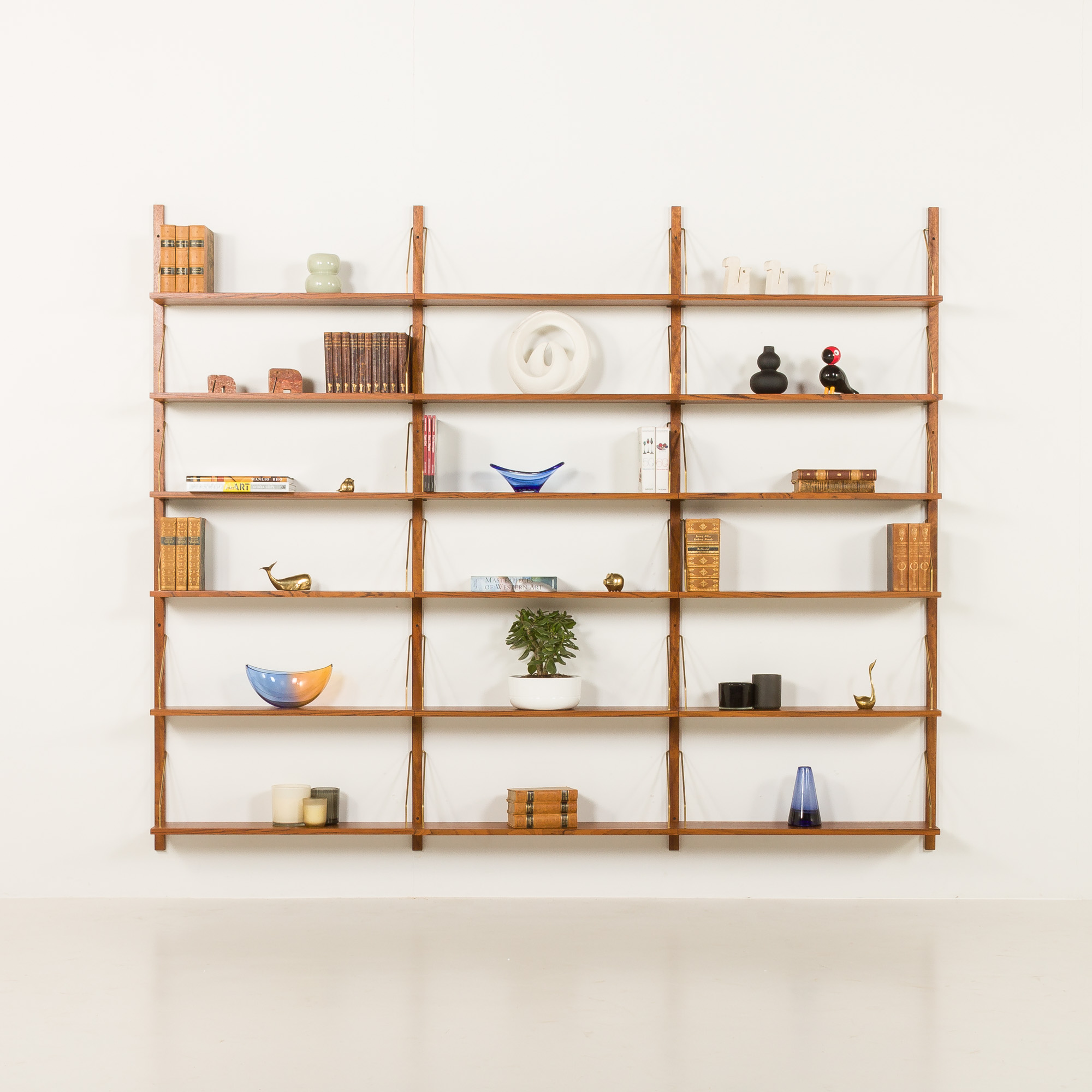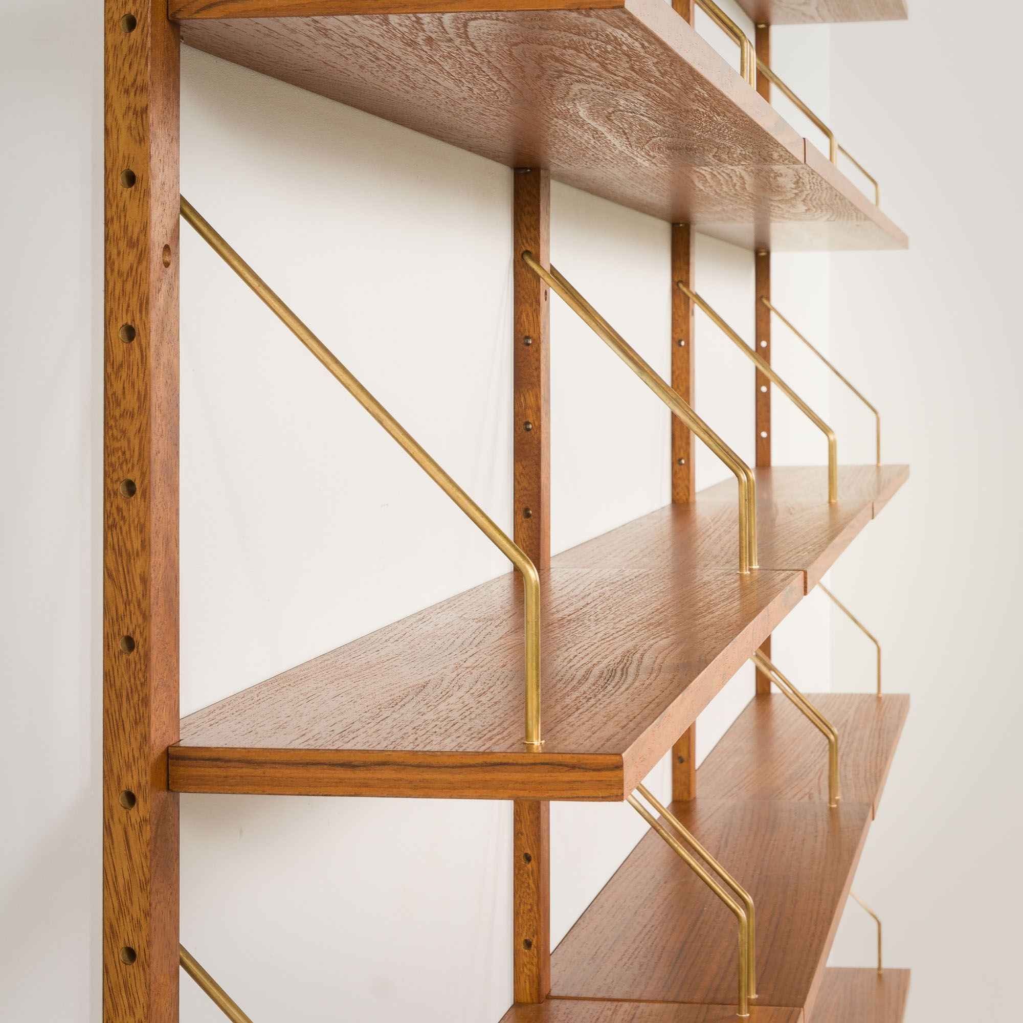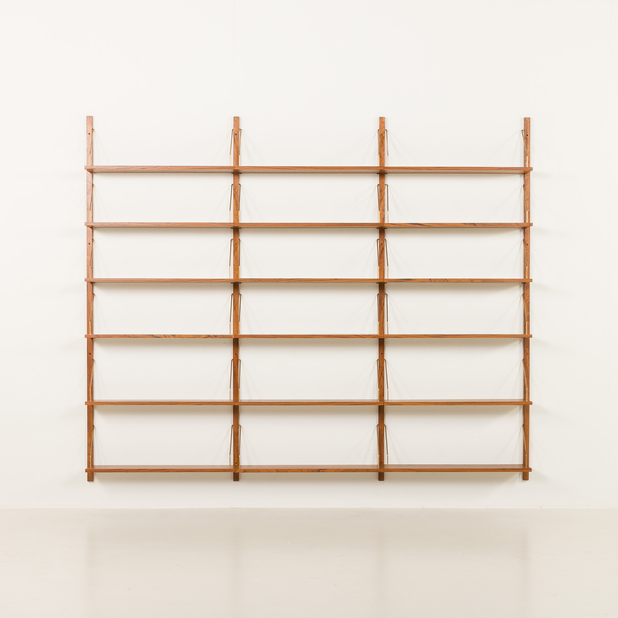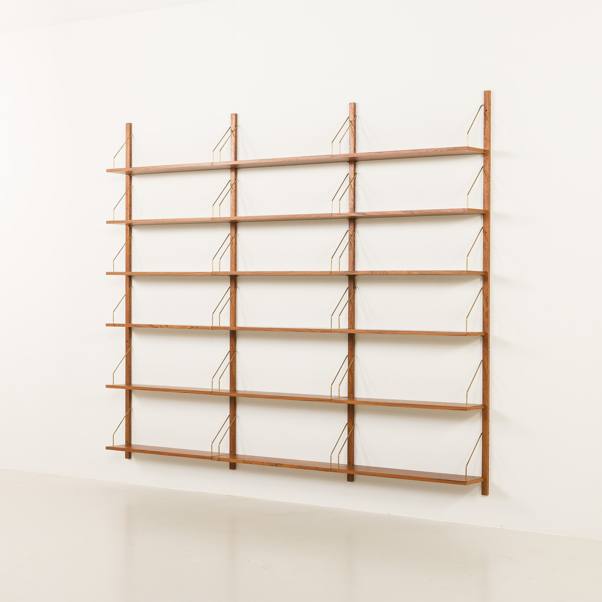 Impressive modular teak shelving unit, made some time in the 1970s in the style of Poul Cadovius. It has been fully renovated. This set is an entirely modular shelving system with eighteen shelves veneered in teak, hanging on solid wood rails with solid brass hangers. The wall unit can be arranged upon one’s will. The shelves can be placed higher or lower, using an easy mounting system of regular slots all along the rail.