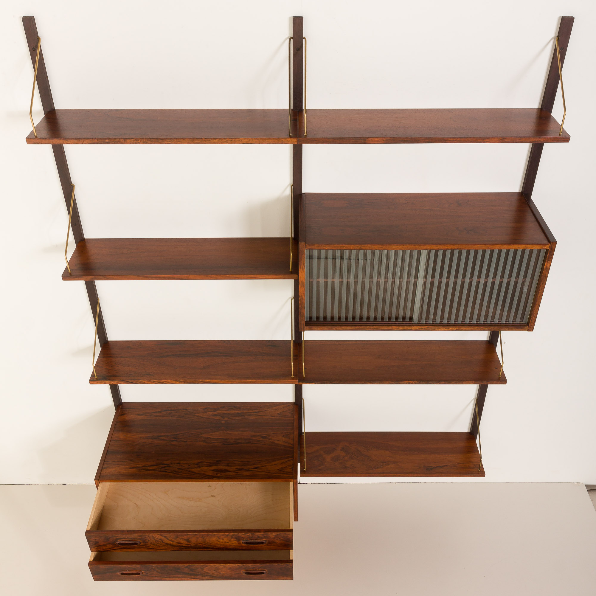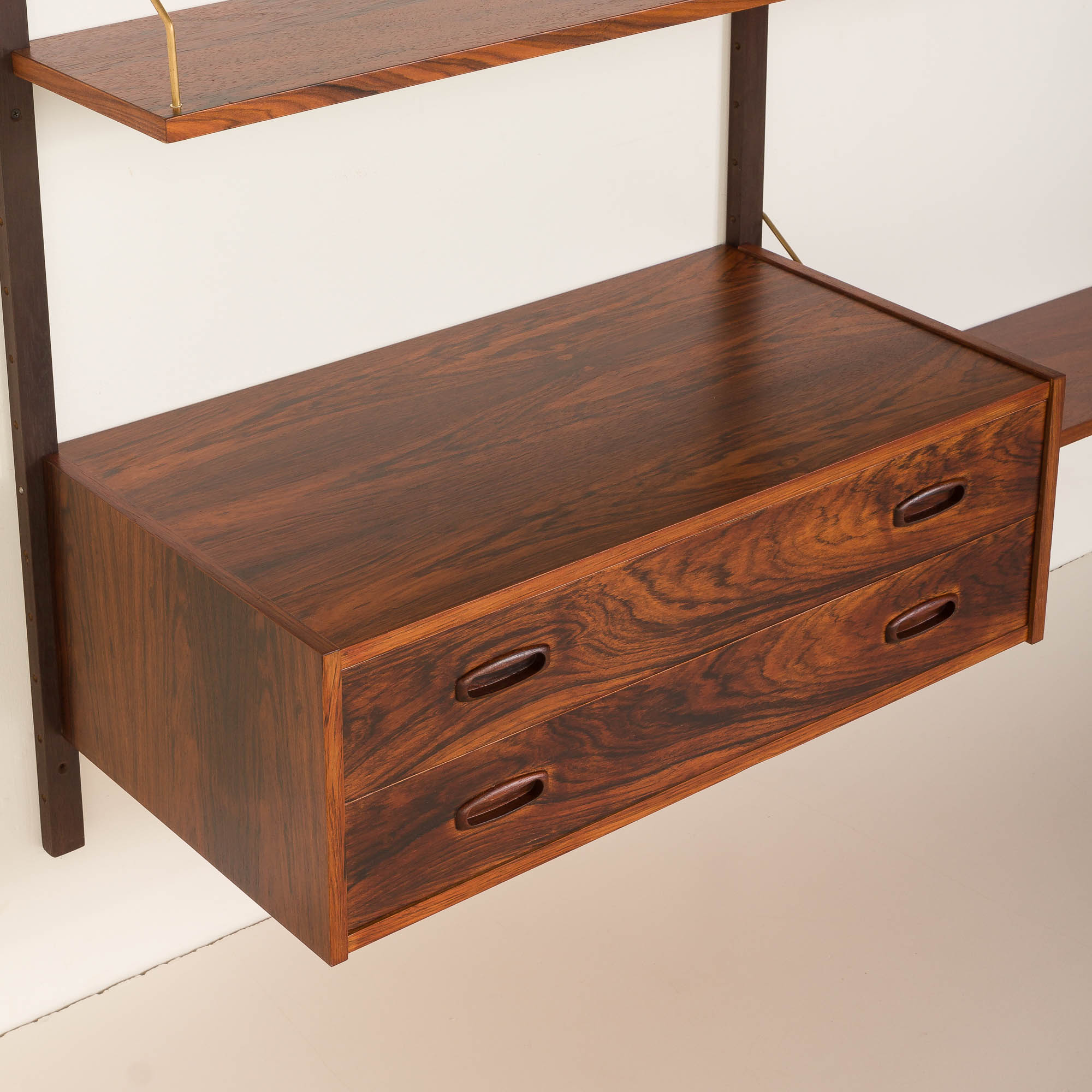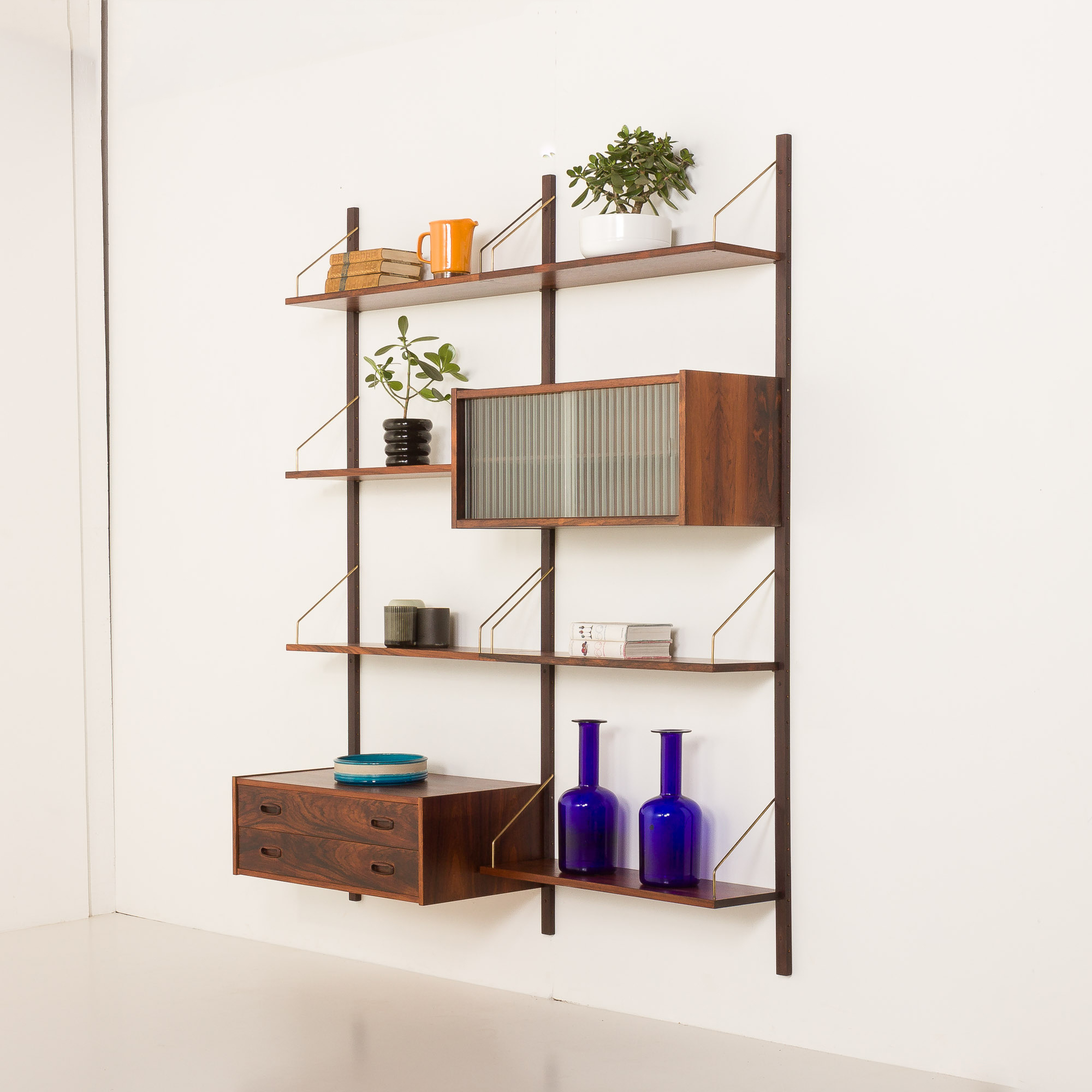 Danish mid century rosewood wall unit designed by Preben Sørensen and manufactured by PS System in Randers Møbelfabrik in the 1960s. It is very resemble to the style of Poul Cadovius shleving units from the same period, aslo considering the quality. Made in rosewood material known for their durability and longevity—it is built to last for many more decades.