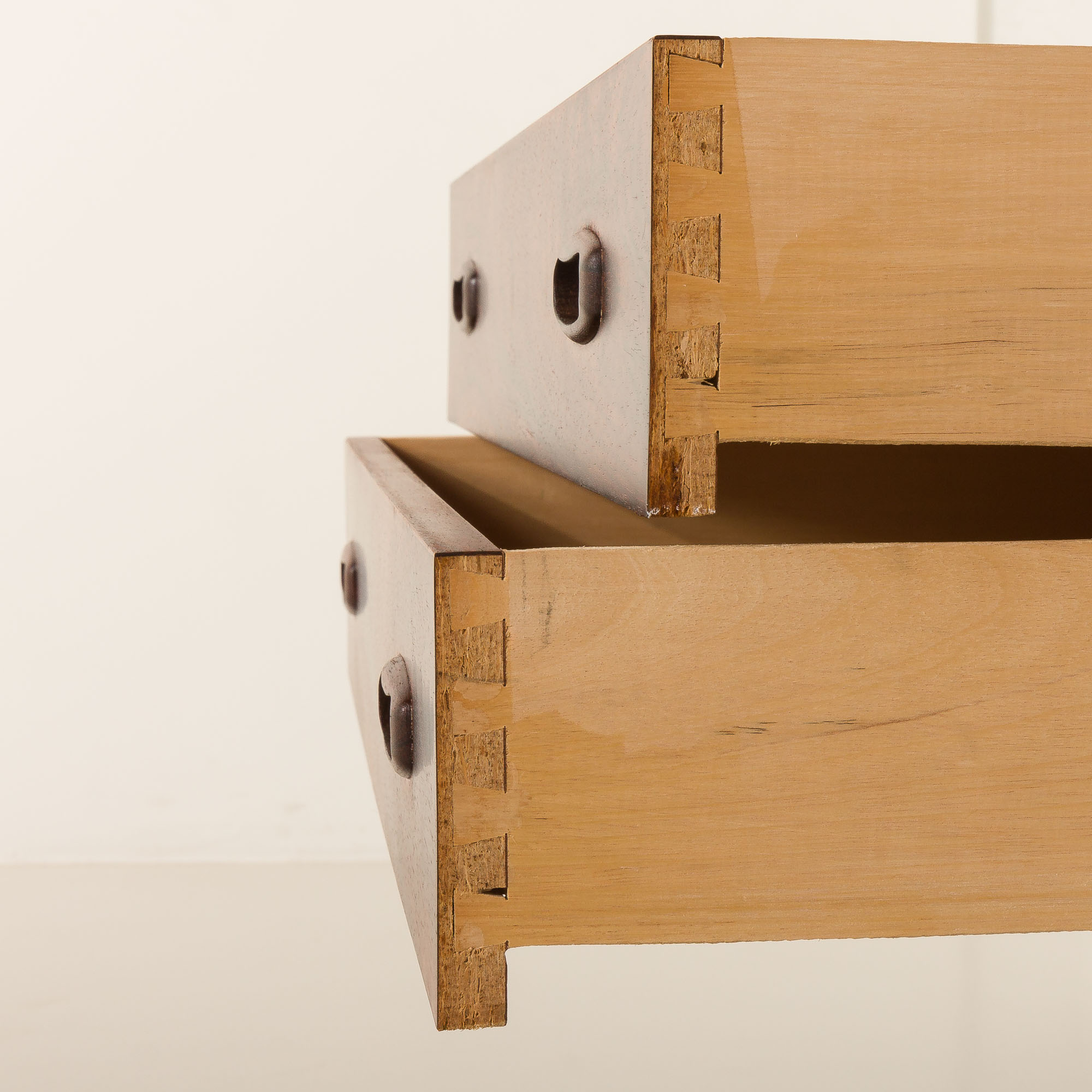 The unit has been fully renovated. The wood has been cleaned and treated with professional compounds to enhance its natural beauty. The drawers are clean and work properly. The producer’s stamp, located inside one of the cabinets, confirms the authenticity of the furniture’s origin.
