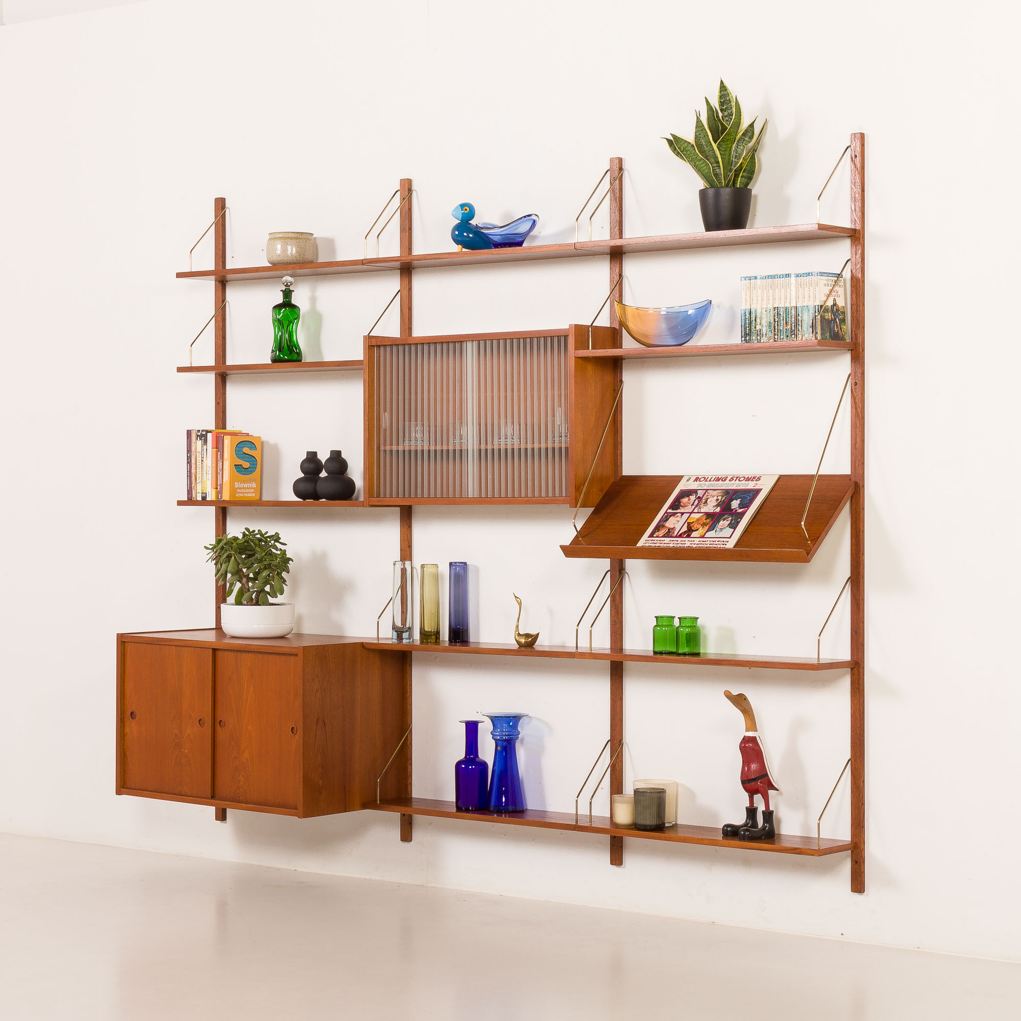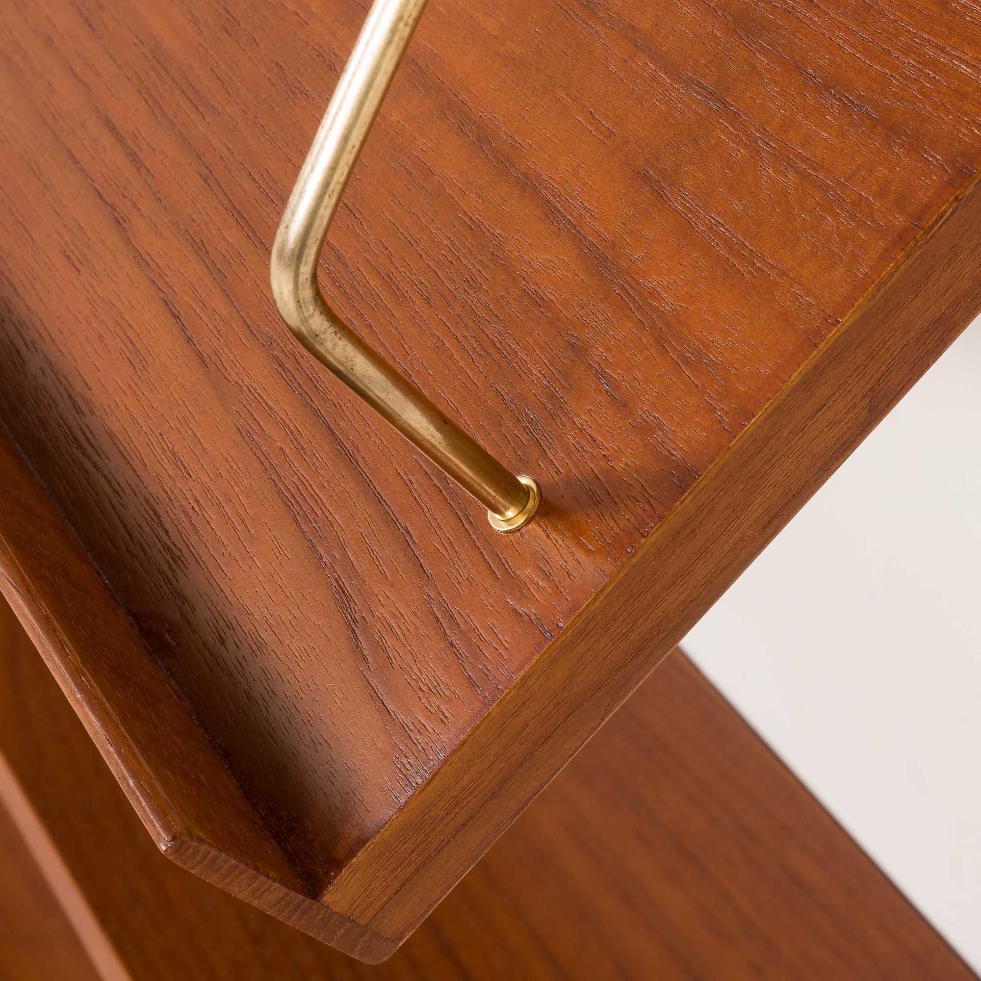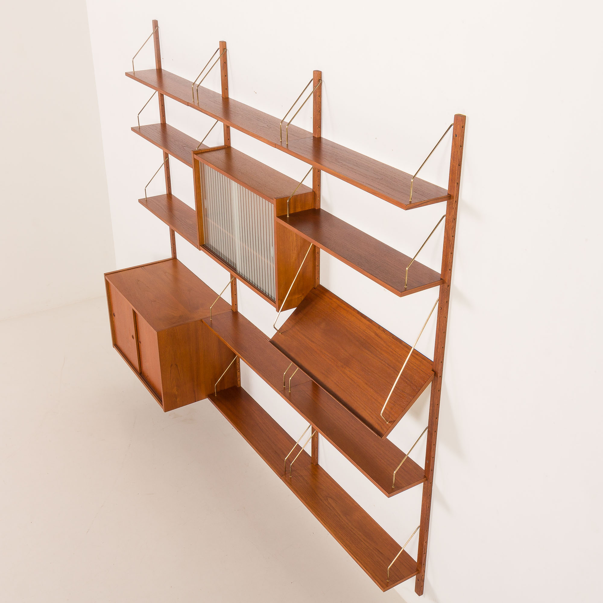 Mastery of Danish mid-century craftsmanship is shown in rich-grained teak veneer and solid wood details. All the shelves and cabinets are adjustable, allowing for the display of personal items or art, regardless of size. Its modularity allows for flexible configuration. The arrangement of the shelves and cabinets can be easily changed. The shown setup is just an example. The assembly system is simple and intuitive, with components mounted on solid wood rails using brass hangers and pins.