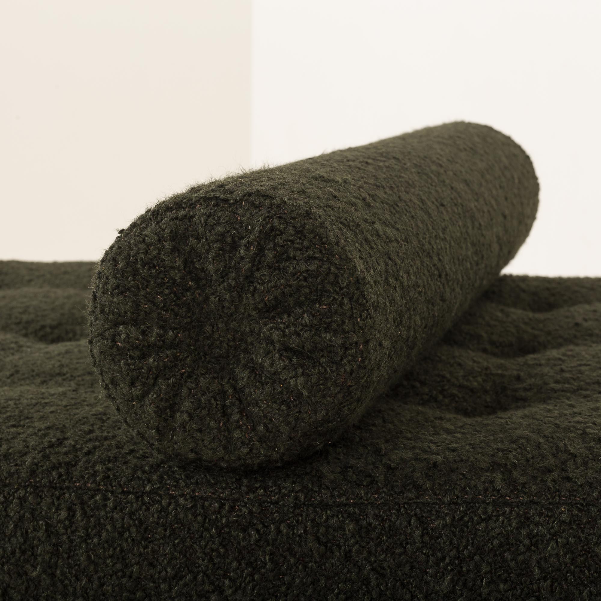 A decorative bolster enhances its elegance and complements the overall design beautifully. Traditionally crafted from natural wool, this thick, dark green bouclé fabric offers excellent anti-allergic properties and helps maintain electrostatic balance—ideal for contemporary interiors often filled with synthetic materials. A nicely profiled solid teak wood frame with gently rounded corners and beautiful grain not only keeps the mattress stable but also perfectly harmonizes with the upholstery, creating a timeless design.