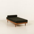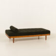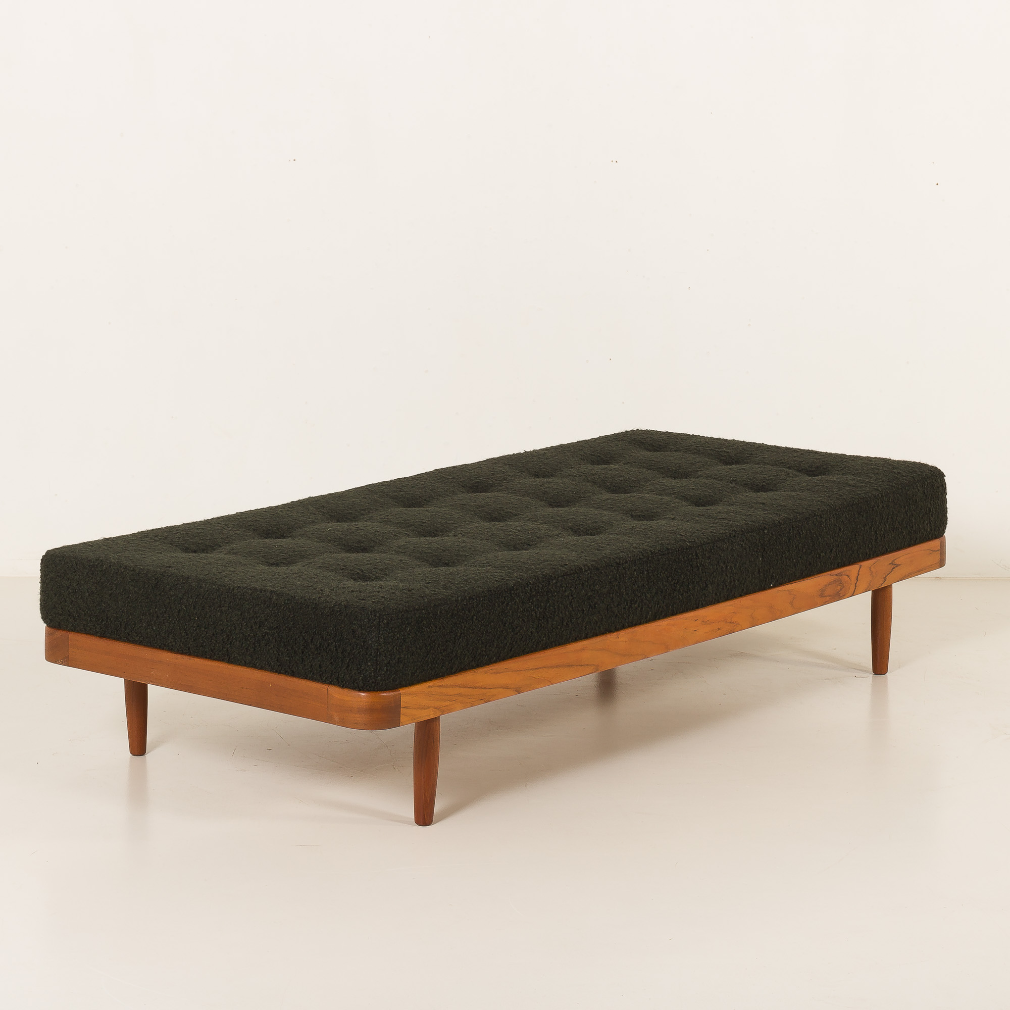 The daybed is in fantastic condition. The teak wood frame has been refinished with layers of satin lacquer to enhance the grain. The new upholstery and quality foams provide both comfort and durability. The legs are detachable for convenient storage or transport.