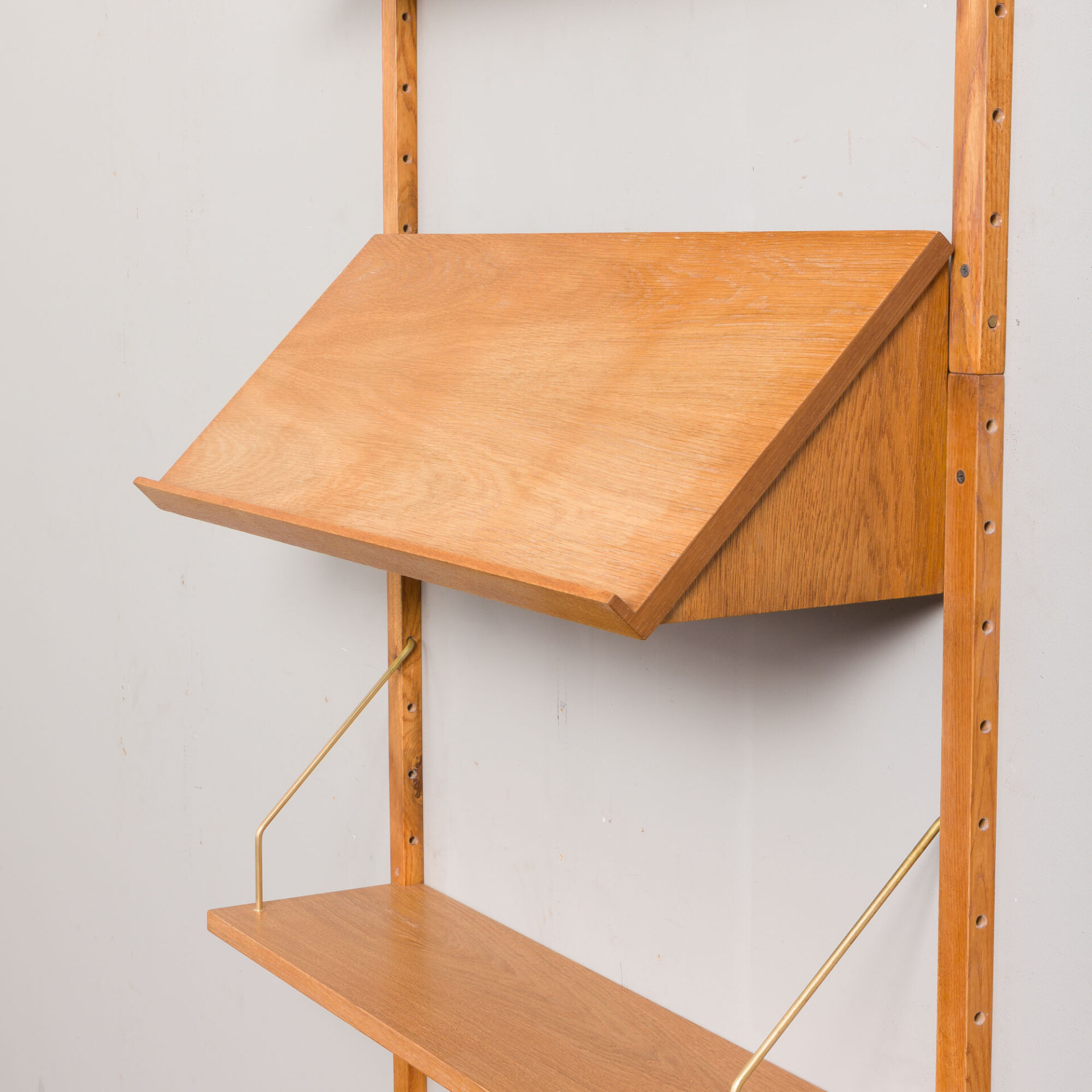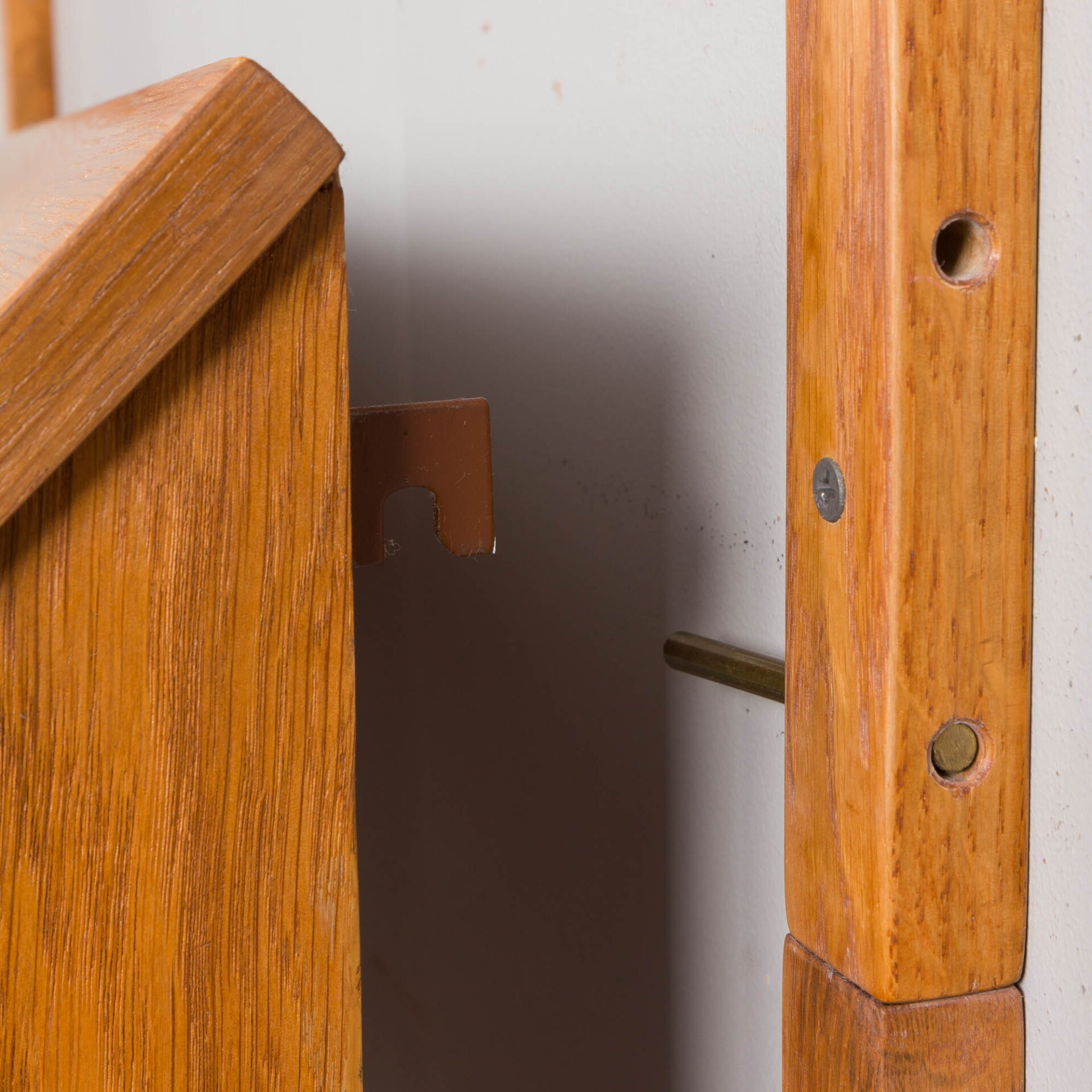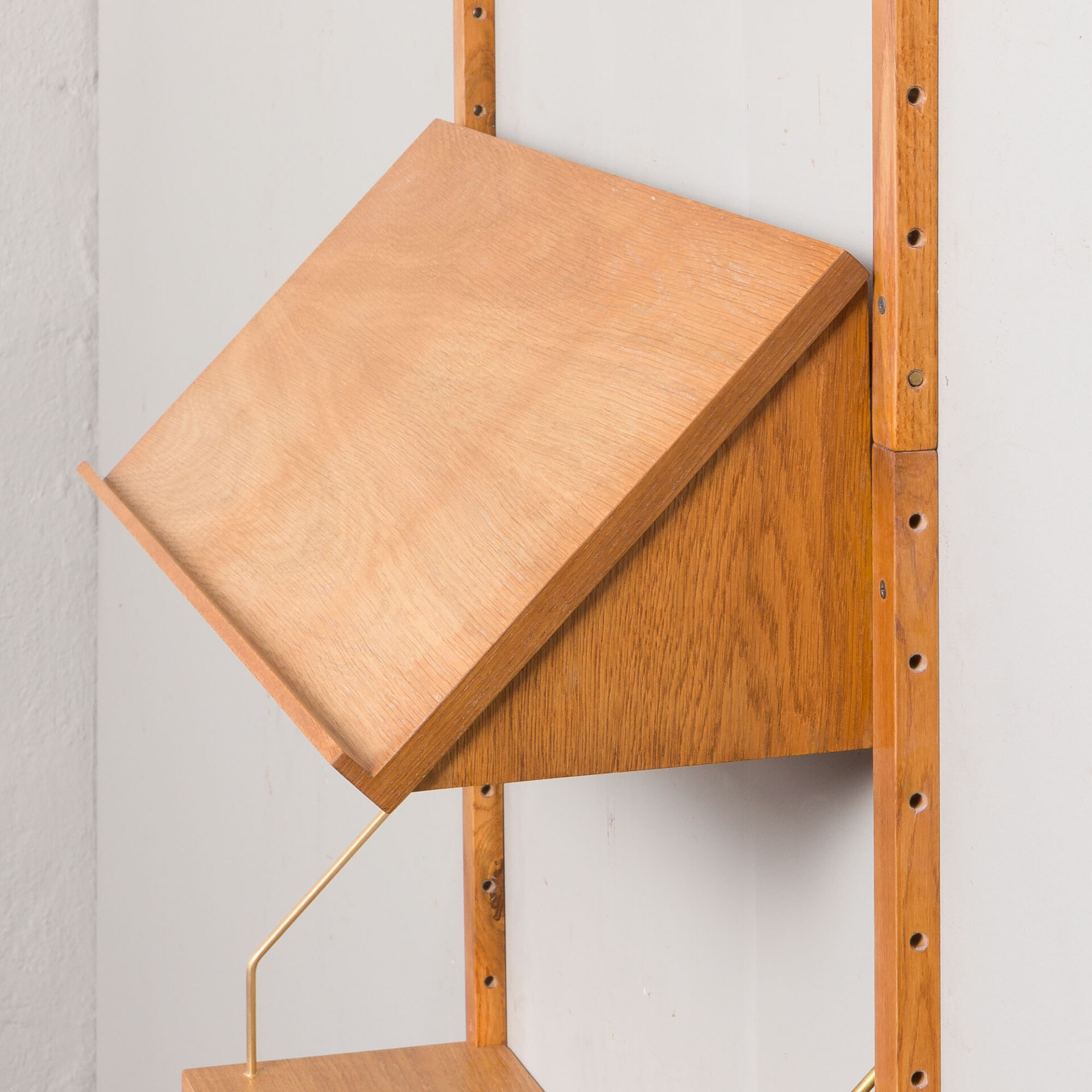 Ce système d'étagères ou d'unités murales vintage en chêne, entièrement modulable, originaire du Danemark, suspendu à des rails en bois massif par des crochets en laiton, est une jolie composition pour exposer des livres et des décorations - exactement comme il le faut. Cette bibliothèque vintage a été conçue dans le style de Poul Cadovius ou Preben Sorensen, très probablement dans les années 70. Il s'agit d'une unité murale entièrement modulaire qui peut être arrangée selon les besoins. Elle se compose de quatre rails de 1 m de long combinés en deux. Les rails offrent diverses possibilités d'agencement, comme l'élargissement de l'unité et sa suspension horizontale en 2 ou 3 travées, et lorsqu'ils sont montés verticalement, le point de connexion est à peine visible.