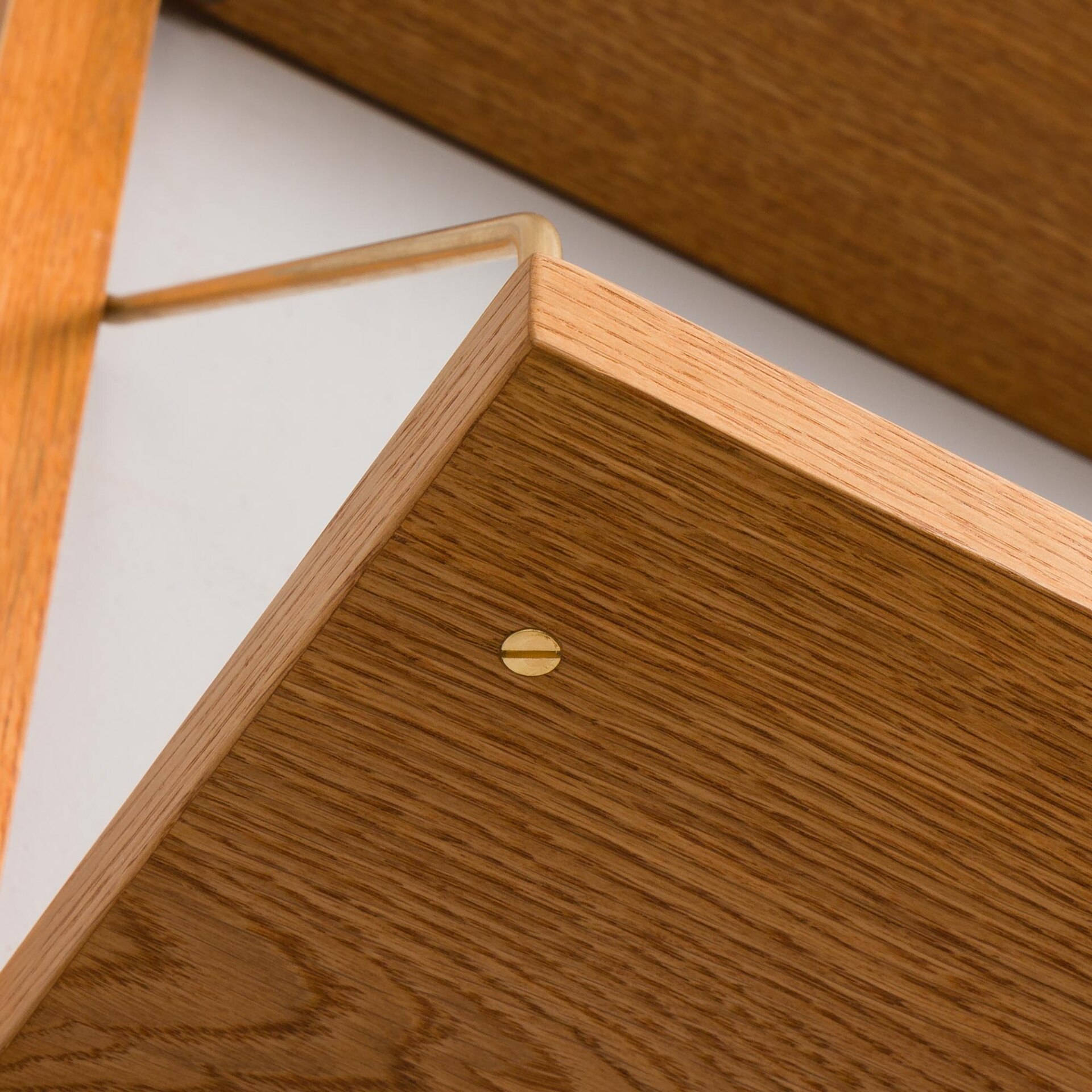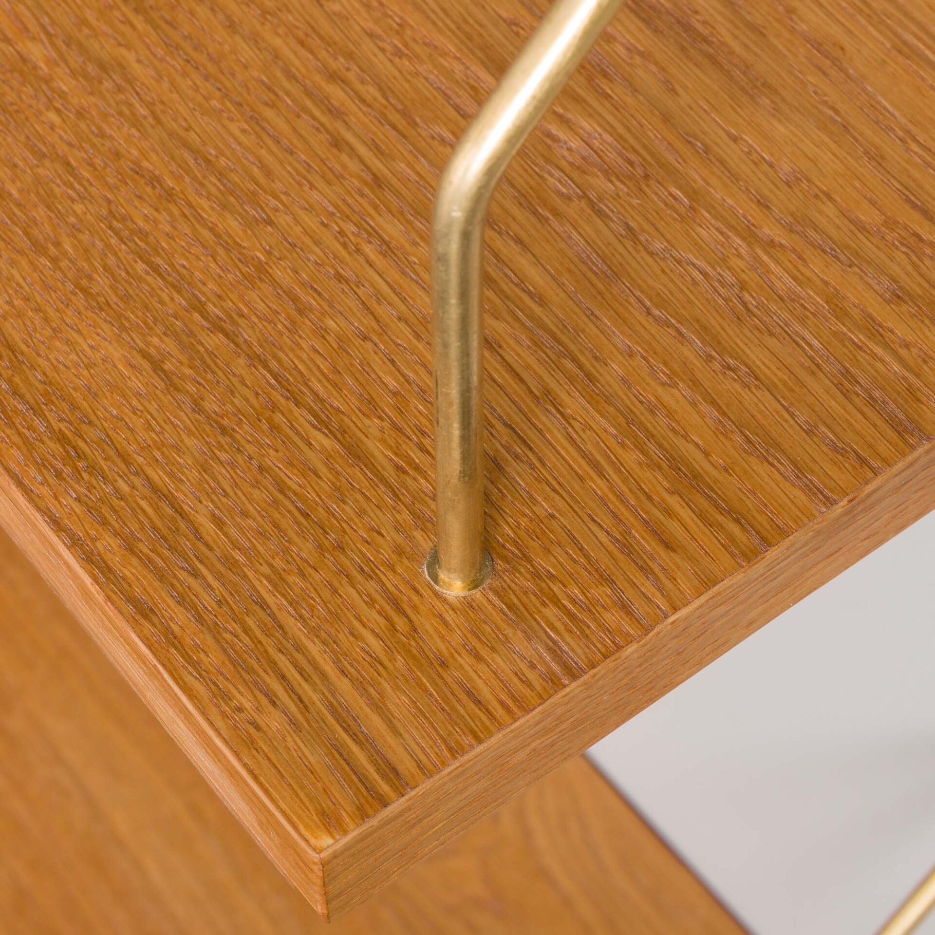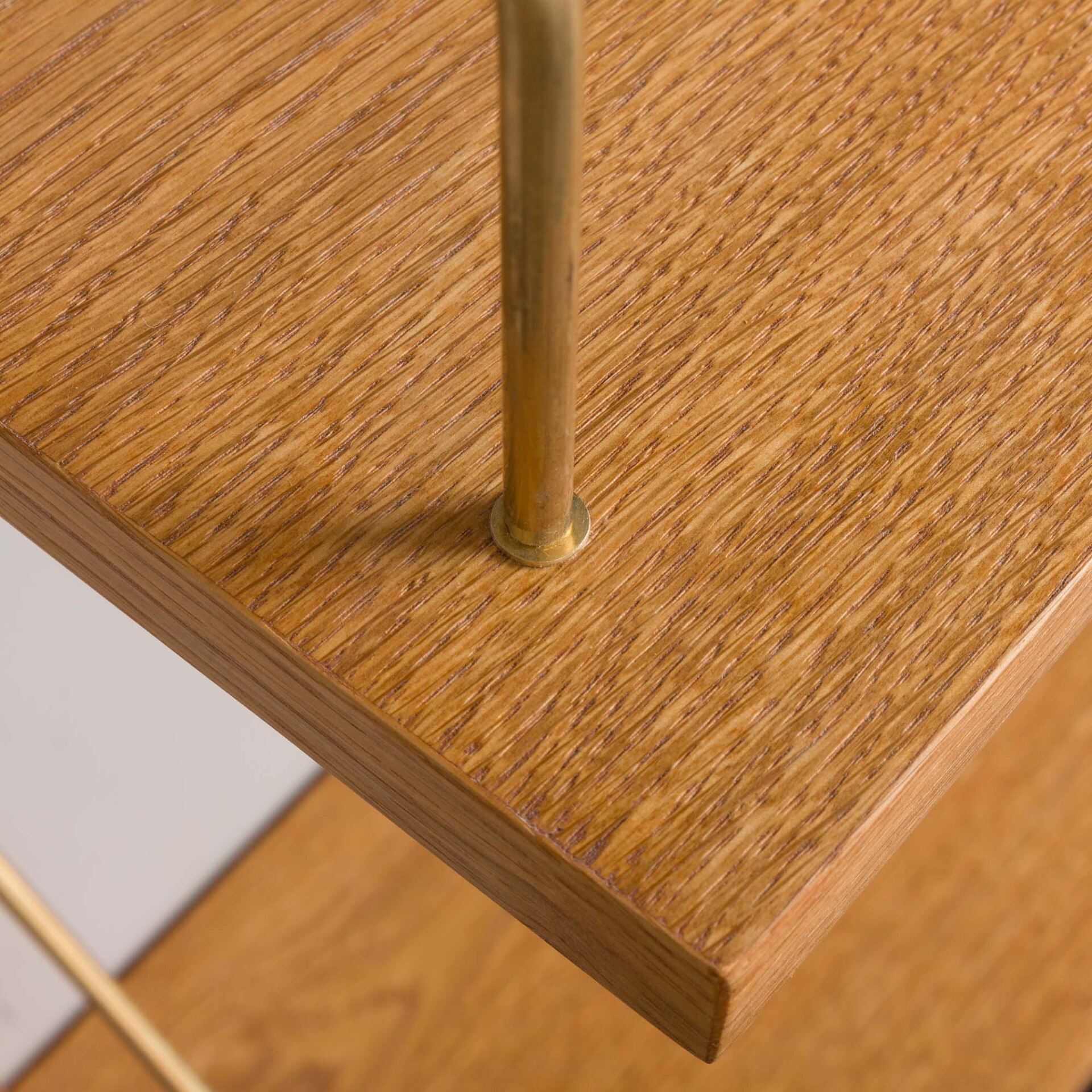 Ce système d'étagères ou d'unités murales vintage en chêne, entièrement modulable, originaire du Danemark, suspendu à des rails en bois massif par des crochets en laiton, est une jolie composition pour exposer des livres et des décorations - exactement comme il le faut. Cette bibliothèque vintage a été conçue dans le style de Poul Cadovius ou Preben Sorensen, très probablement dans les années 70. Il s'agit d'une unité murale entièrement modulaire qui peut être arrangée selon les besoins. Elle se compose de quatre rails de 1 m de long combinés en deux. Les rails offrent diverses possibilités d'agencement, comme l'élargissement de l'unité et sa suspension horizontale en 2 ou 3 travées, et lorsqu'ils sont montés verticalement, le point de connexion est à peine visible.