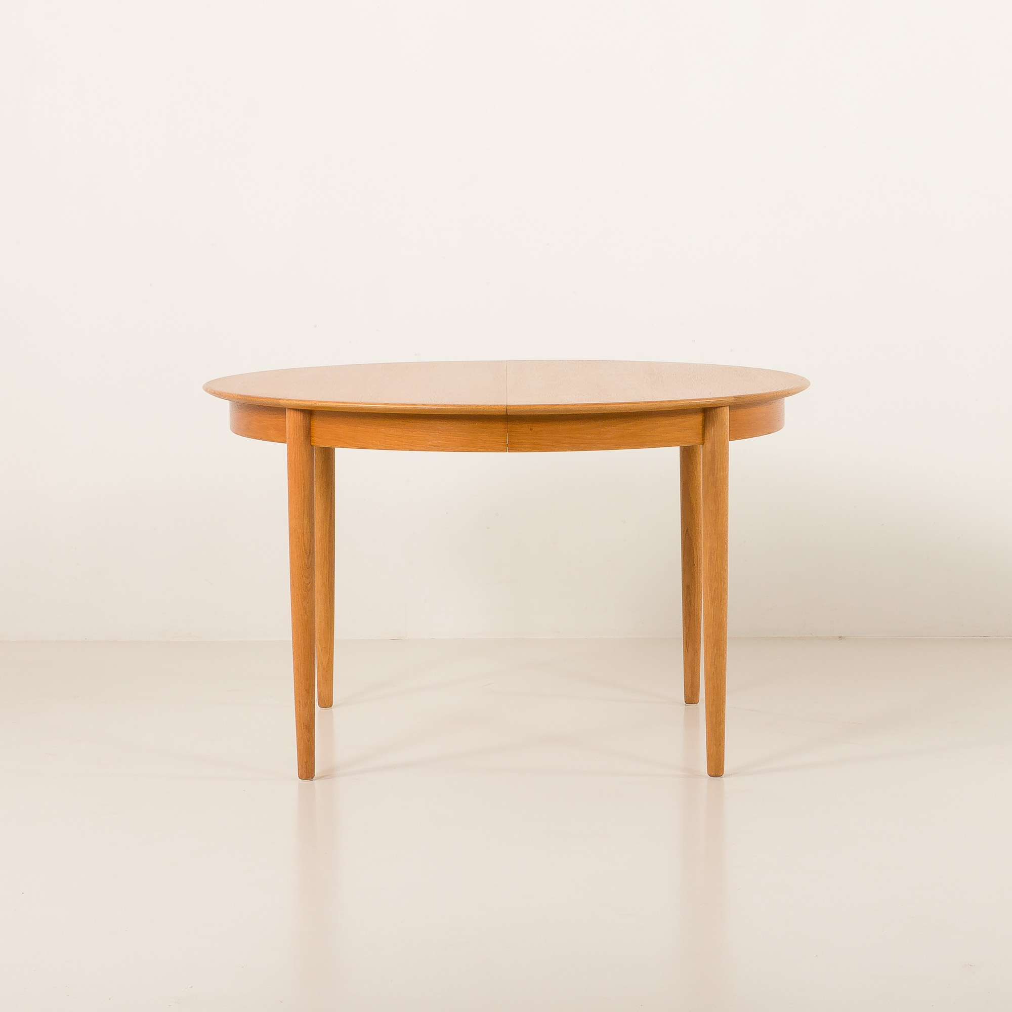Round vintage oak extension dining table from 70s, made in Danish renowned factory Skovby. It features two additional leaves, both are 50 cm wide. Beautiful rich oak wood grain and great mid-century carpentry. Excellent vintage condition. The tabletop has been fully cleaned with professional compounds. The lacquer is in fantastic condition. Legs are detachable for easier transport. There is an original label under the countertop.