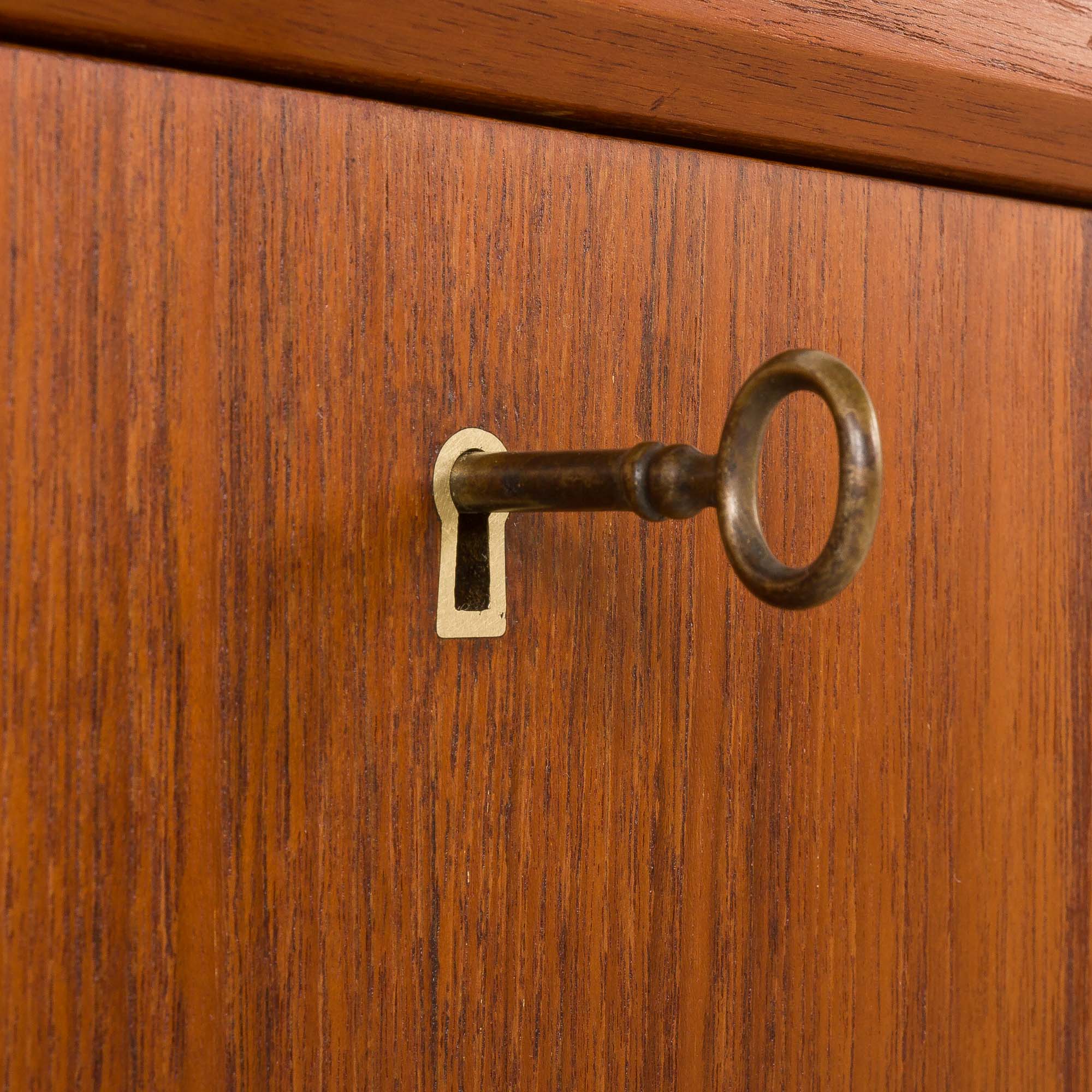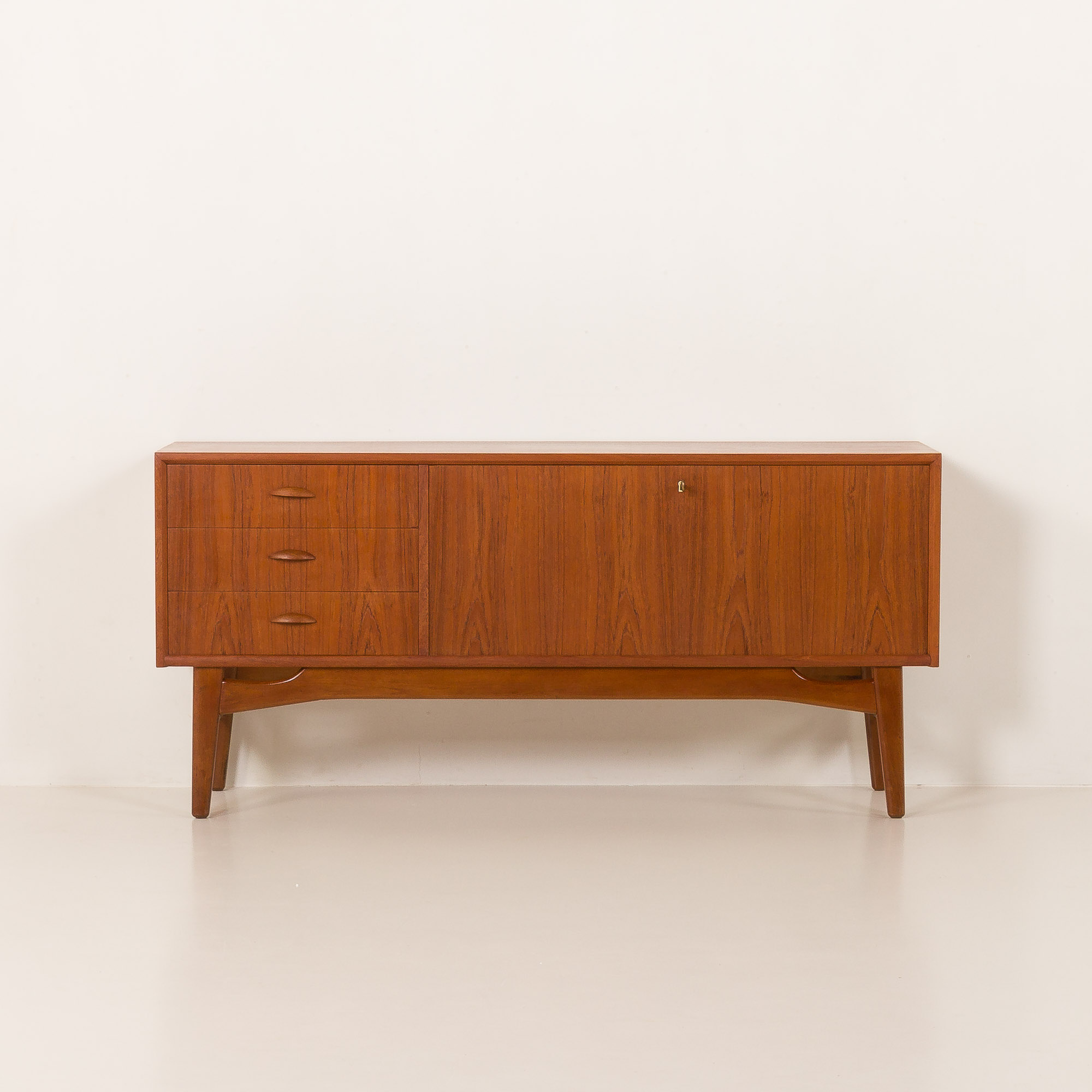 Classic Danish teak sideboard from the 1960s shows the quality of mid-century carpentry with solid teak details, especially in nicely sculptured half almond handles and solid oak wood curved base. There is also exceptionally well matched veneer on the front, consistent throughout the piece that looks like a painting (that is often seen on best Danish MCM furniture). It features three drawers and cabinet with drop down lockable doors, with two internal drawers and shelf, perfect to hide some documents in your home office, or just for small items in the leaving room. This part of the sideboard can serve also as a bar cabinet (the middle shelve is removable) Another special feature are the inner two drawers finished in walnut burlap and inlayed with gren felt extremely elegant and emphasising the class of the piece.