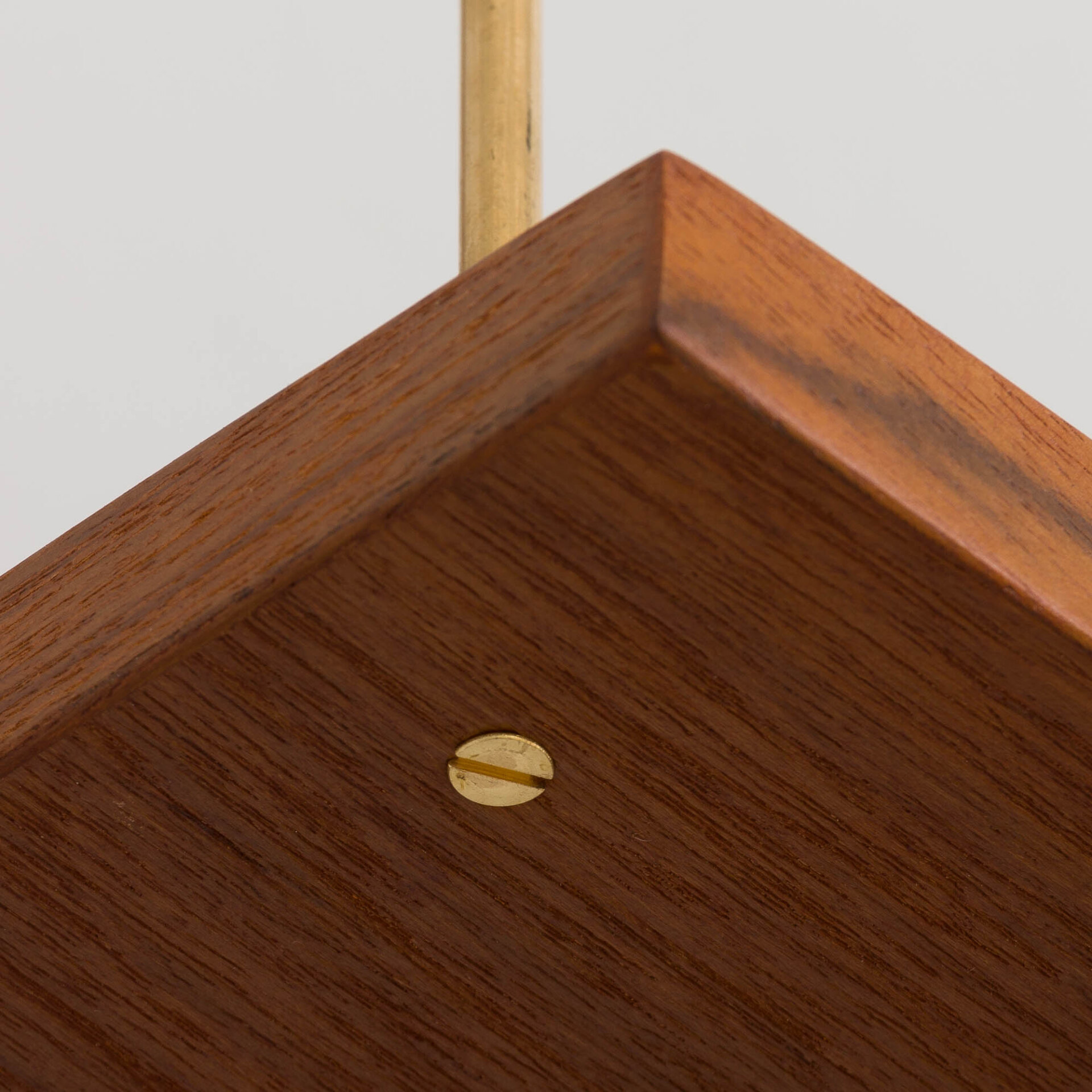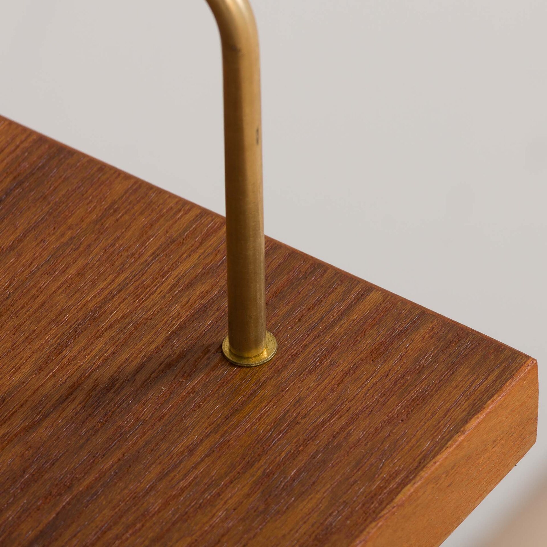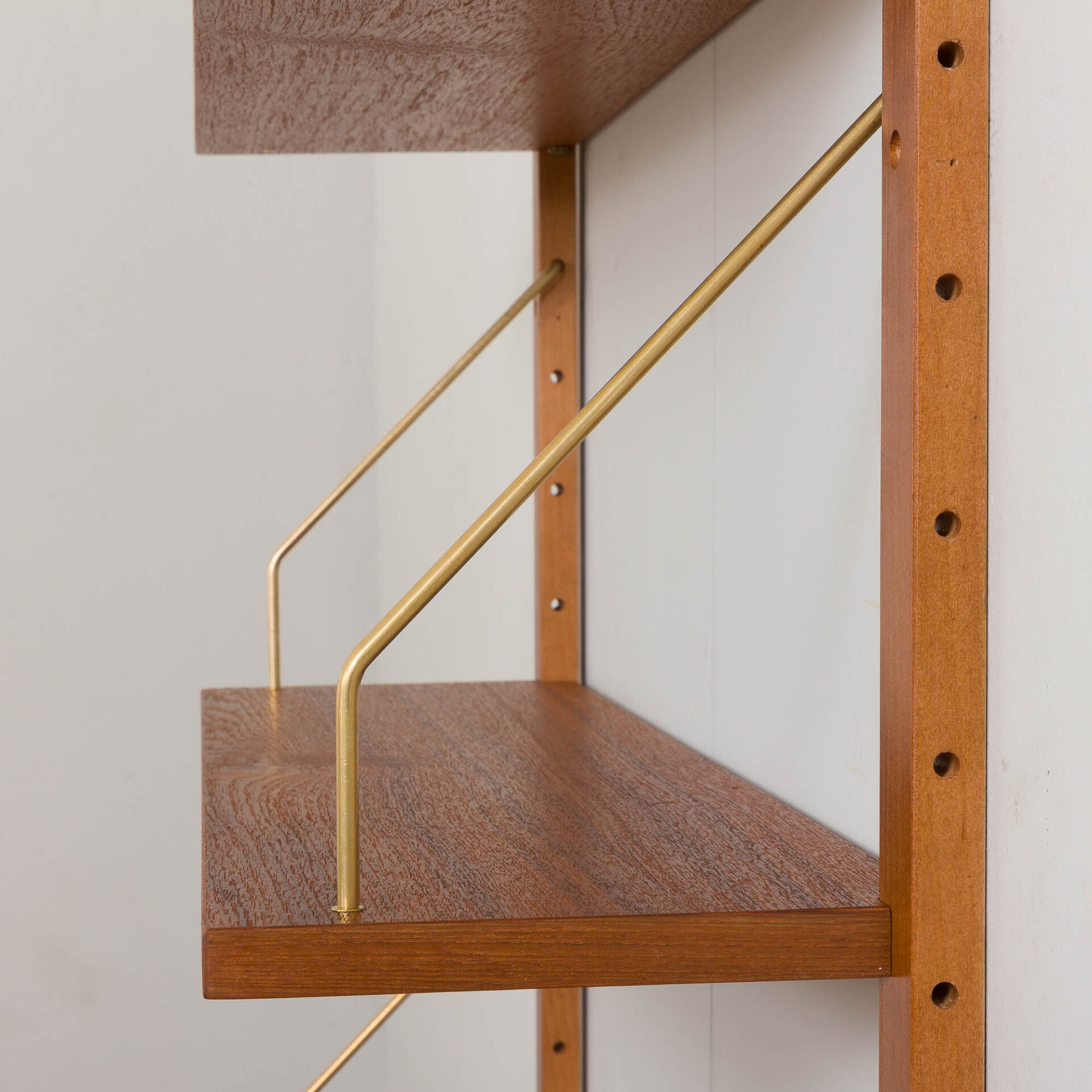 Simple mais élégante, cette étagère modulaire danoise d'époque est dans le style de Cadovius ou Sorensen (système de fixation et menuiserie similaires). Ce meuble mural est un système d'étagères entièrement modulable avec six étagères en placage de teck suspendues à des cintres en laiton et des rails en bois massif. Elle peut être agencée selon la volonté de chacun. Cet ensemble est composé de