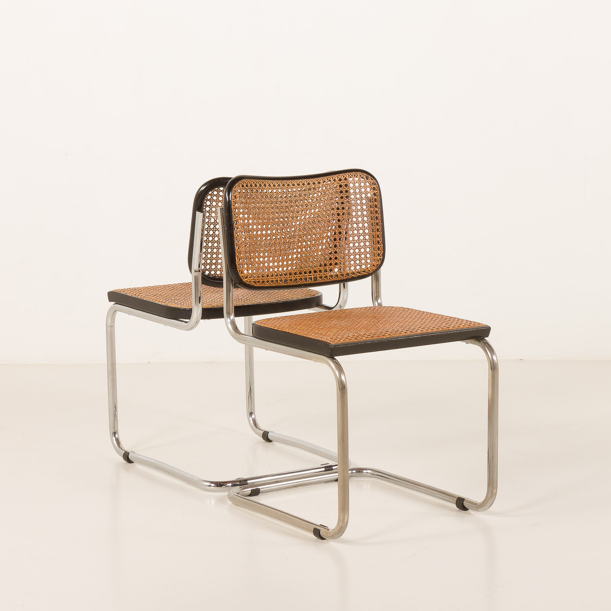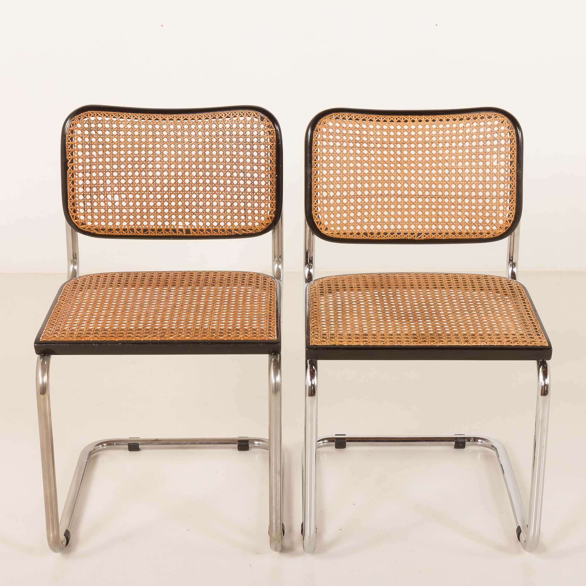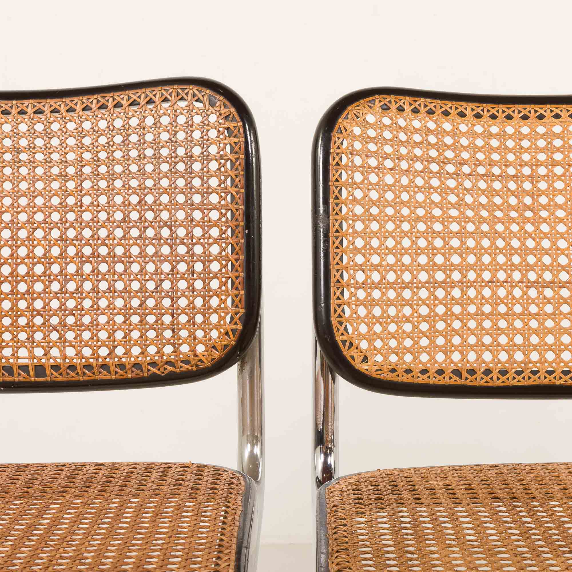This particular Cesca chairs features a classic black varnished beech frame. The seat and back are made from handwoven cane, a natural material that beautifully contrasts with the dark frame and adds a touch of warmth and texture to the design. Manual cross over weaving trough the holes distingushes Gavina chairs from other Italin versions form the period. It is a very labor consuming process that was originally introduced in the 1930 in early Breuers versions manufactured by Thonet. The honey-gold color of the cane weaving has aged beautifully over time, with a lovely patina that enhances the chair’s warm appearance. The frame is crafted from tubular steel. This construction provides comfort, support and durability but also gives the chair its timeless silhouette.
