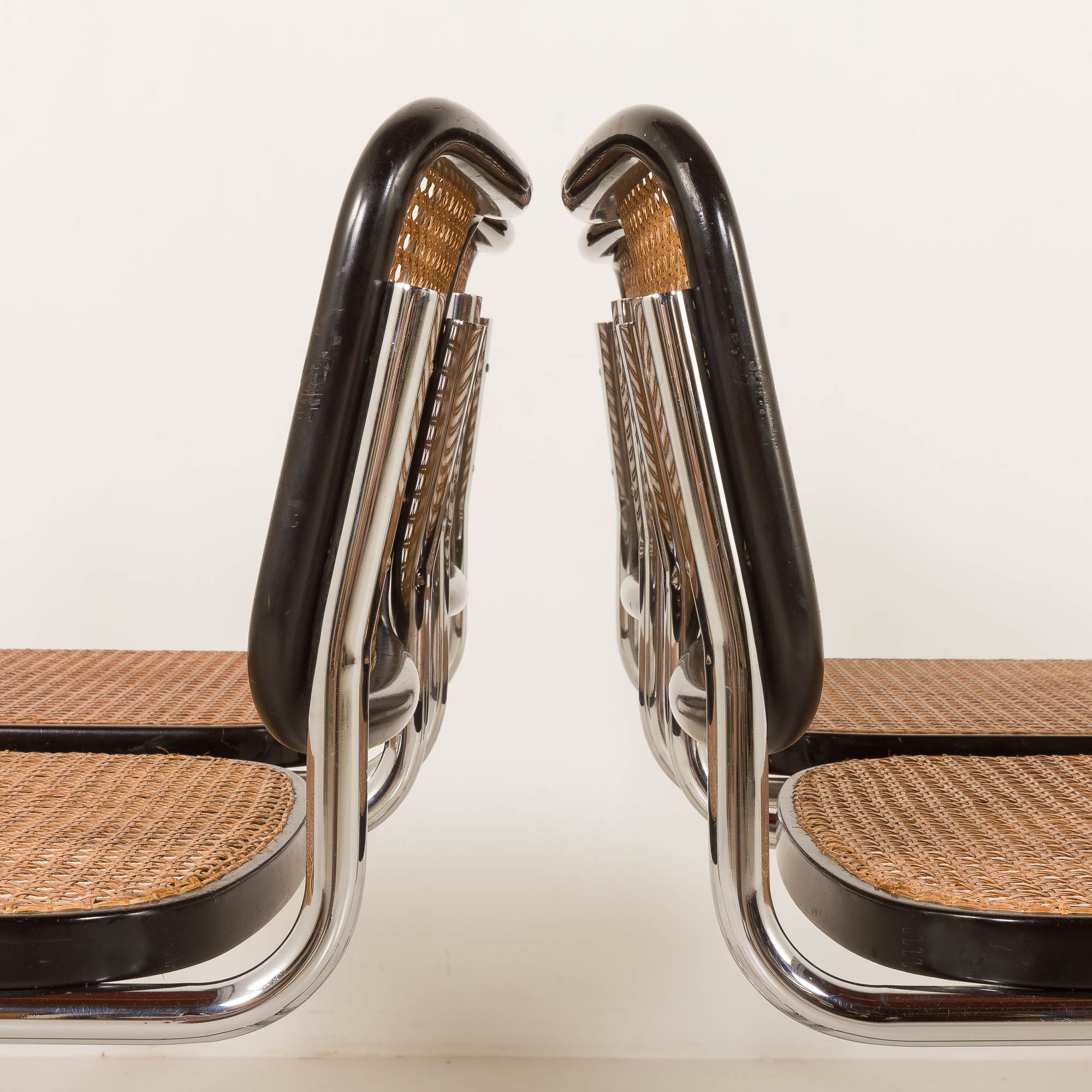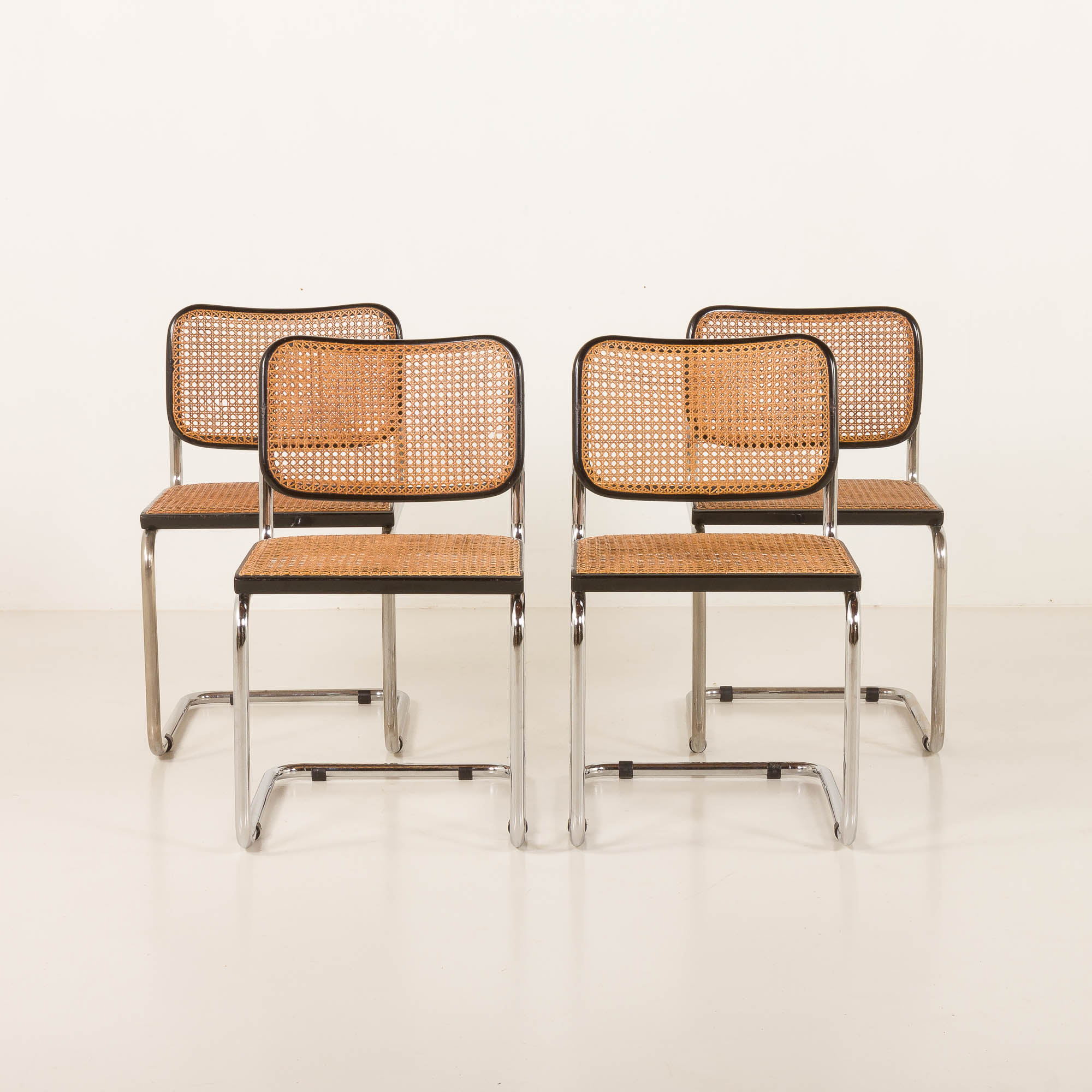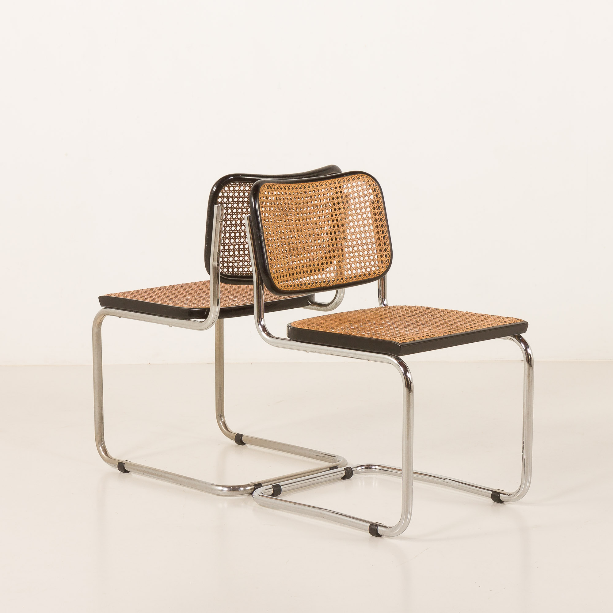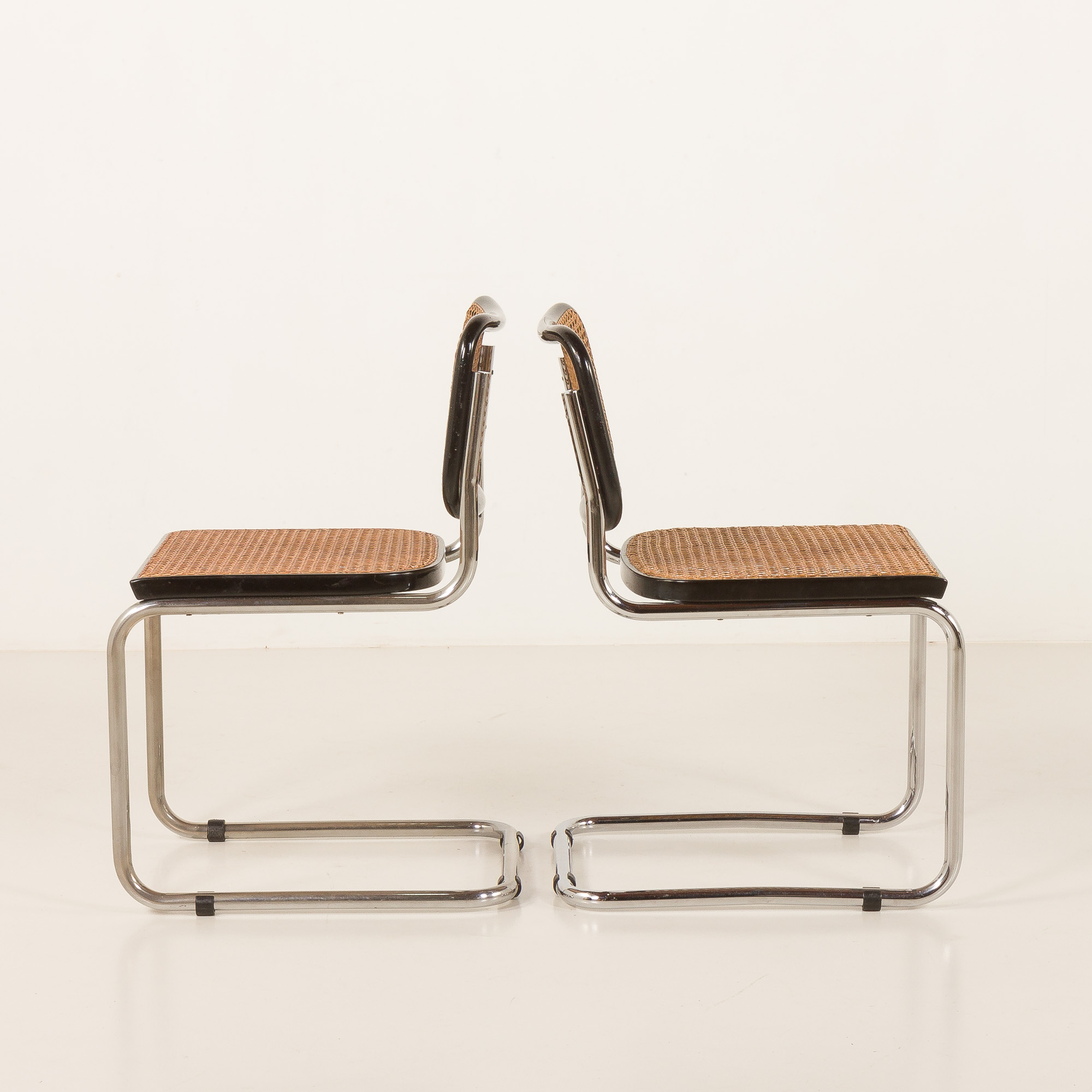 This particular Cesca chairs features a classic black varnished beech frame. The seat and back are made from handwoven cane, a natural material that beautifully contrasts with the dark frame and adds a touch of warmth and texture to the design. Manual cross over weaving trough the holes distingushes Gavina chairs from other Italin versions form the period. It is a very labor consuming process that was originally introduced in the 1930 in early Breuers versions manufactured by Thonet. The honey-gold color of the cane weaving has aged beautifully over time, with a lovely patina that enhances the chair’s warm appearance. The frame is crafted from tubular steel. This construction provides comfort, support and durability but also gives the chair its timeless silhouette.