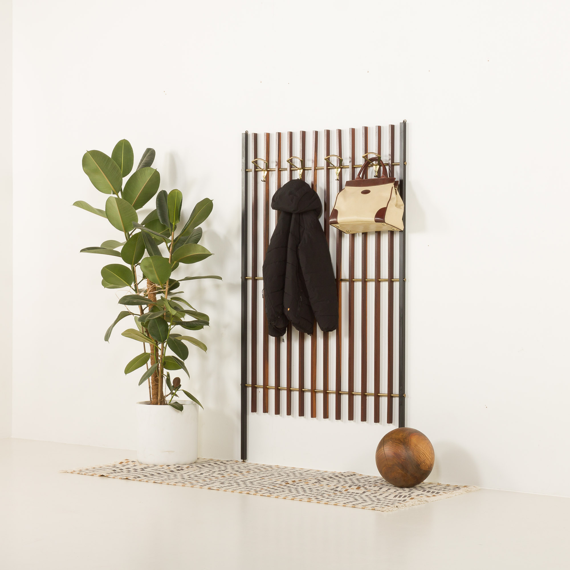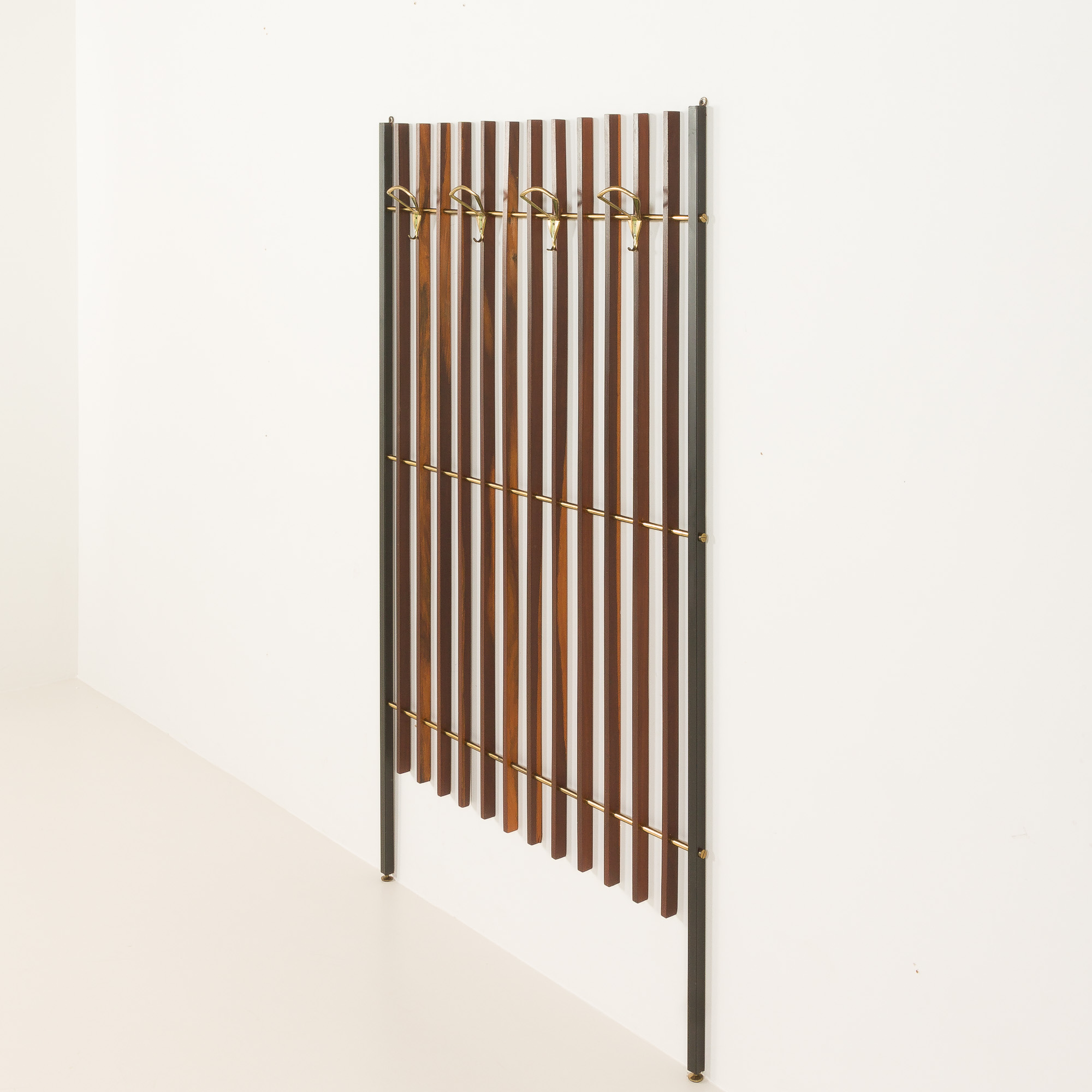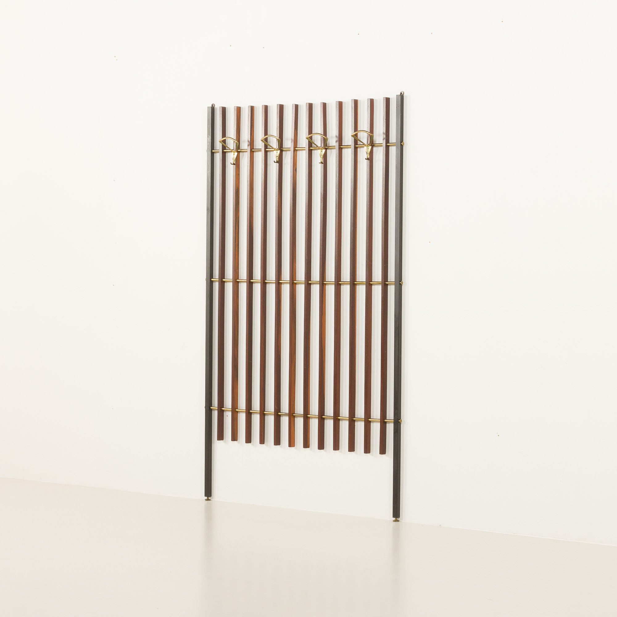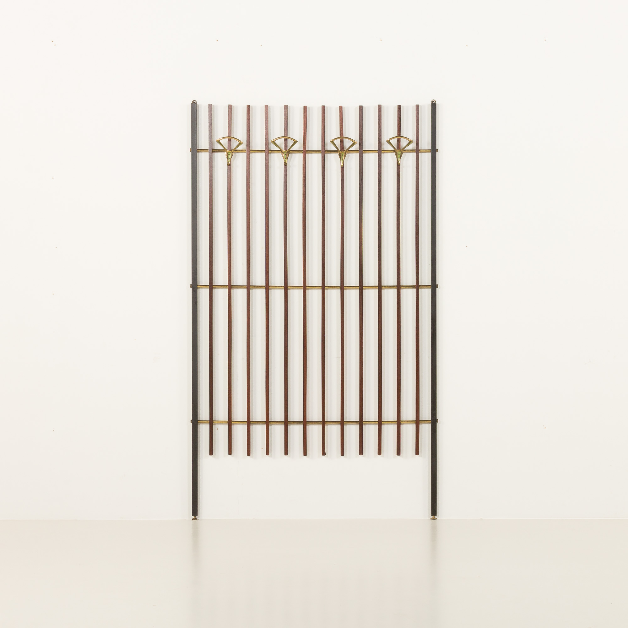 Italian mid century coat hanger from the 1950s is a nicely crafted piece combining teak wood and brass accents. The design consists of a vertical structure made of evenly spaced teak slats framed by black varnished metal supports. Brass rods horizontally connect the slats, adding both structural stability and a decorative element.