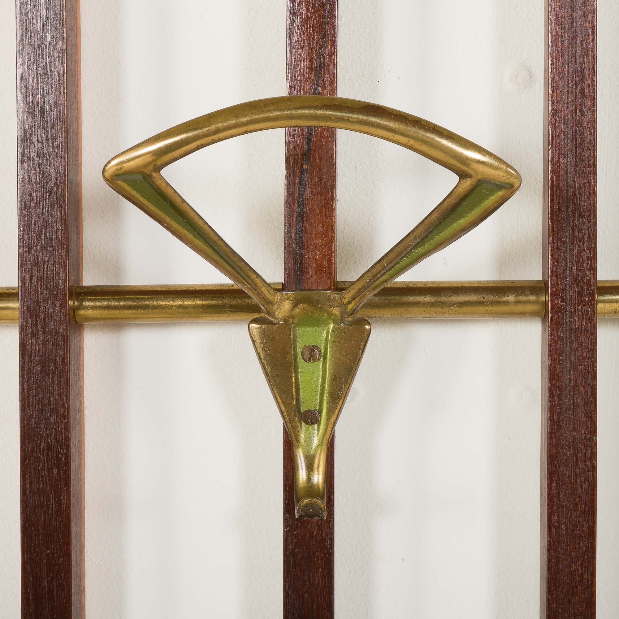 Italian mid century coat hanger in solid teak and brass, 1950s