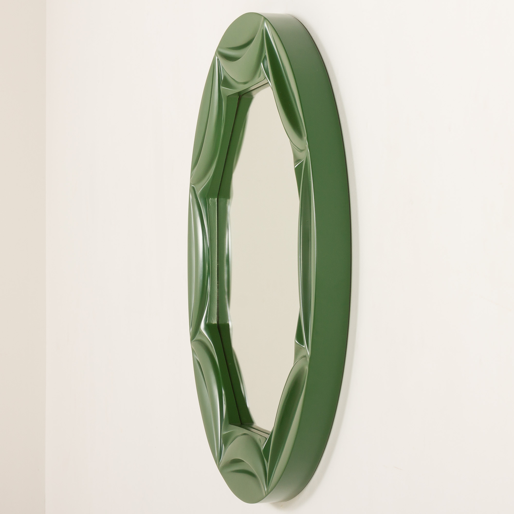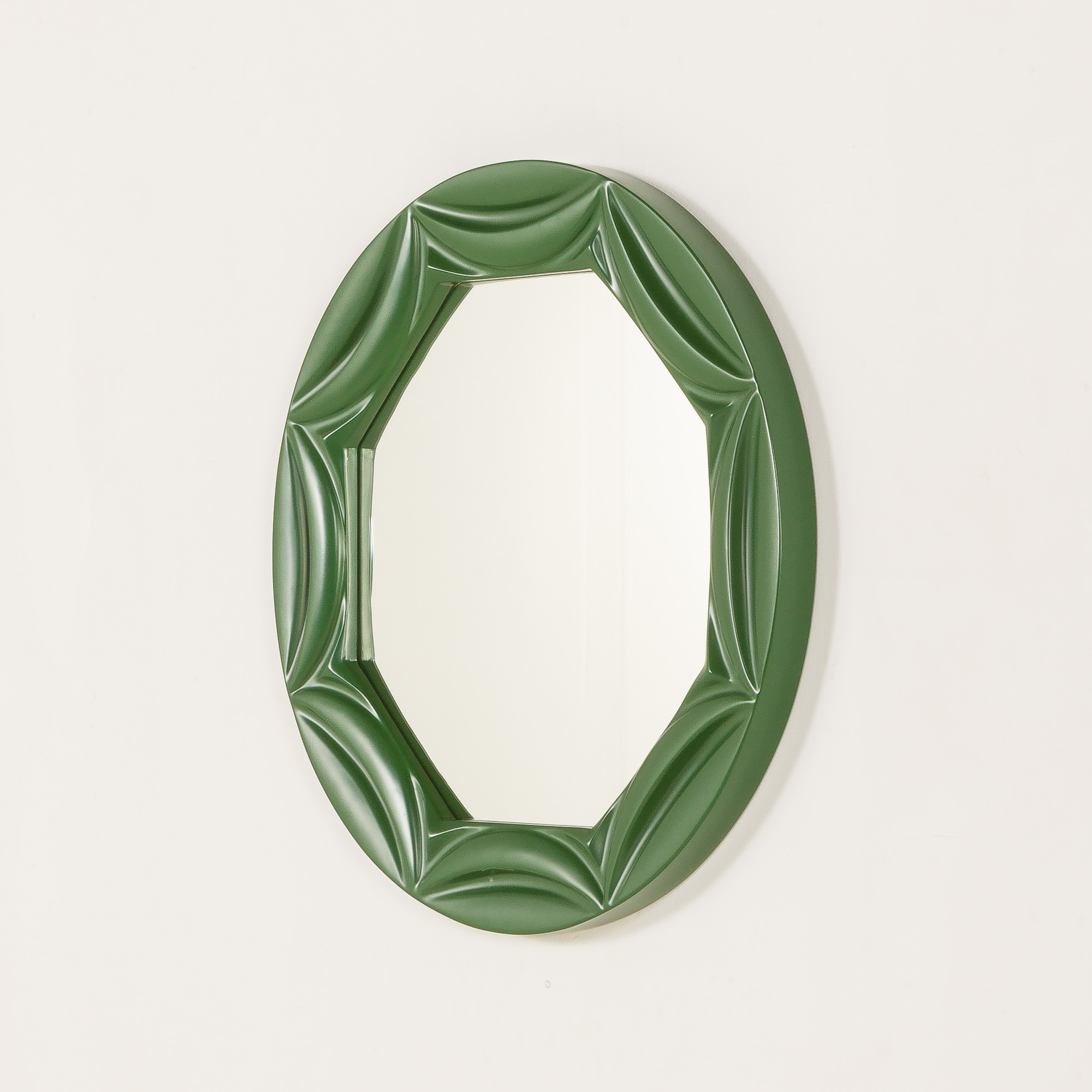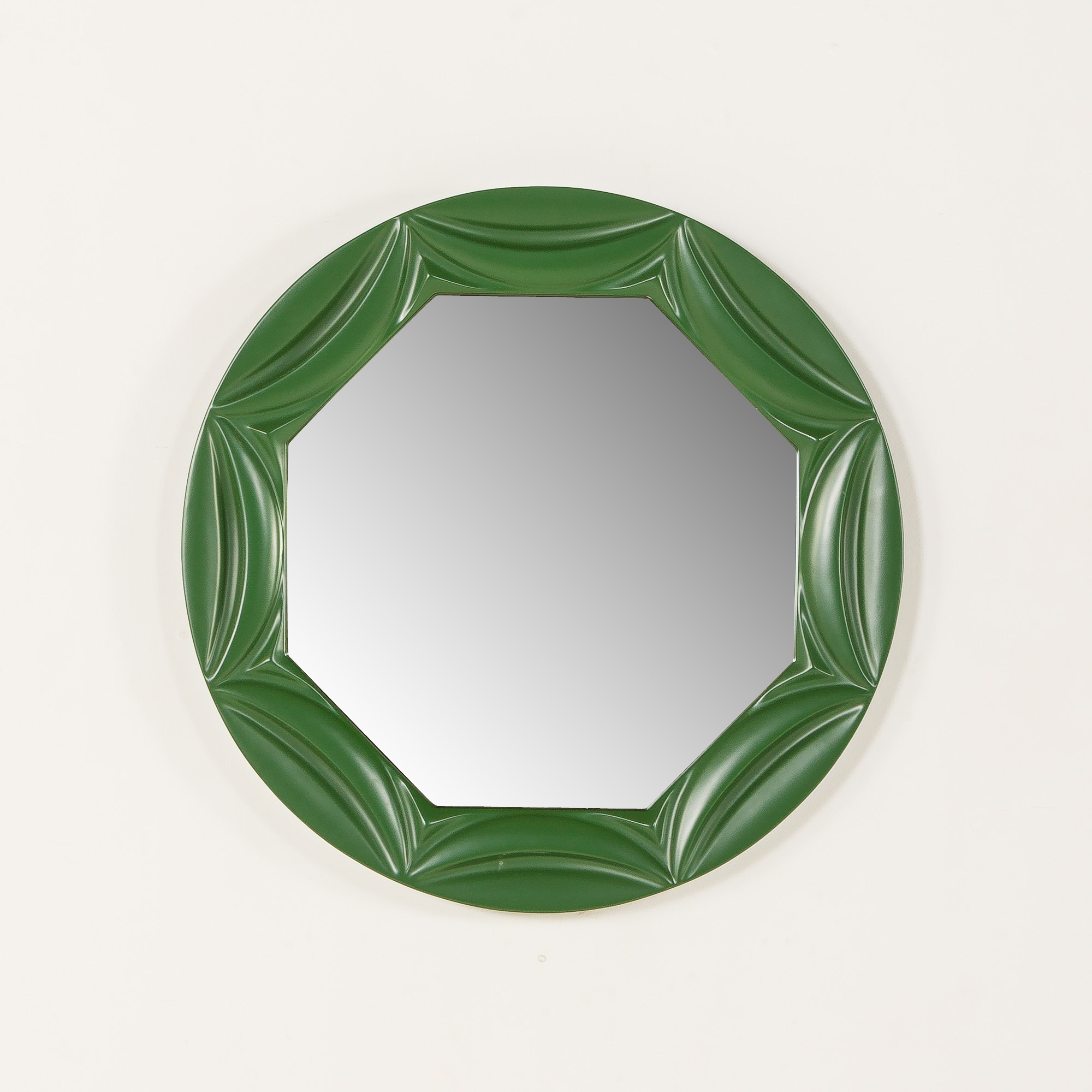 A bold and elegant Italian mid-century mirror from the 1970s, featuring a sculptural round frame in lacquered green. The frame’s geometric relief pattern creates depth and visual interest, catching the light and adding dimension to the piece. Its octagonal inner outline contrasts beautifully with the circular outer form, giving it a refined architectural quality.