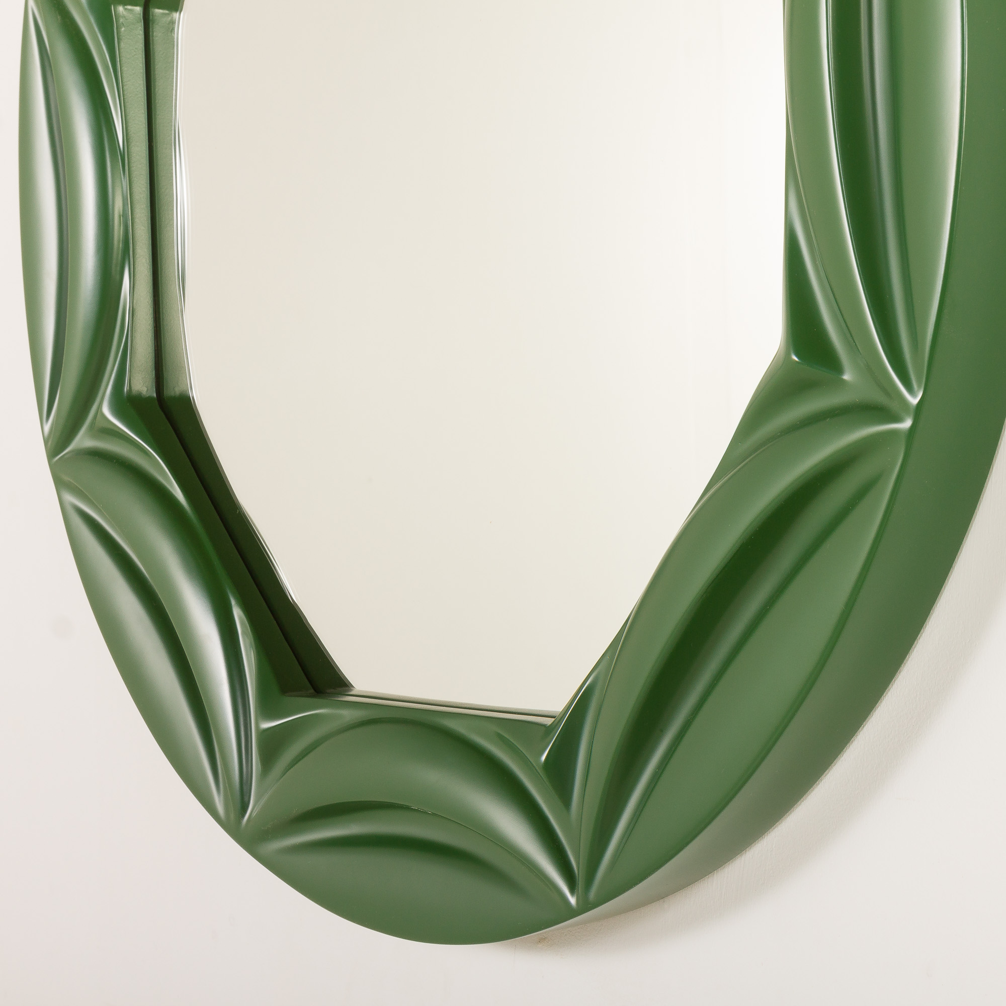 This vintage mirror embodies the playful yet sophisticated spirit of Italian design from the era, where everyday objects became sculptural works of art. The matte green lacquer highlights its modernist curves, making it both decorative and functional.