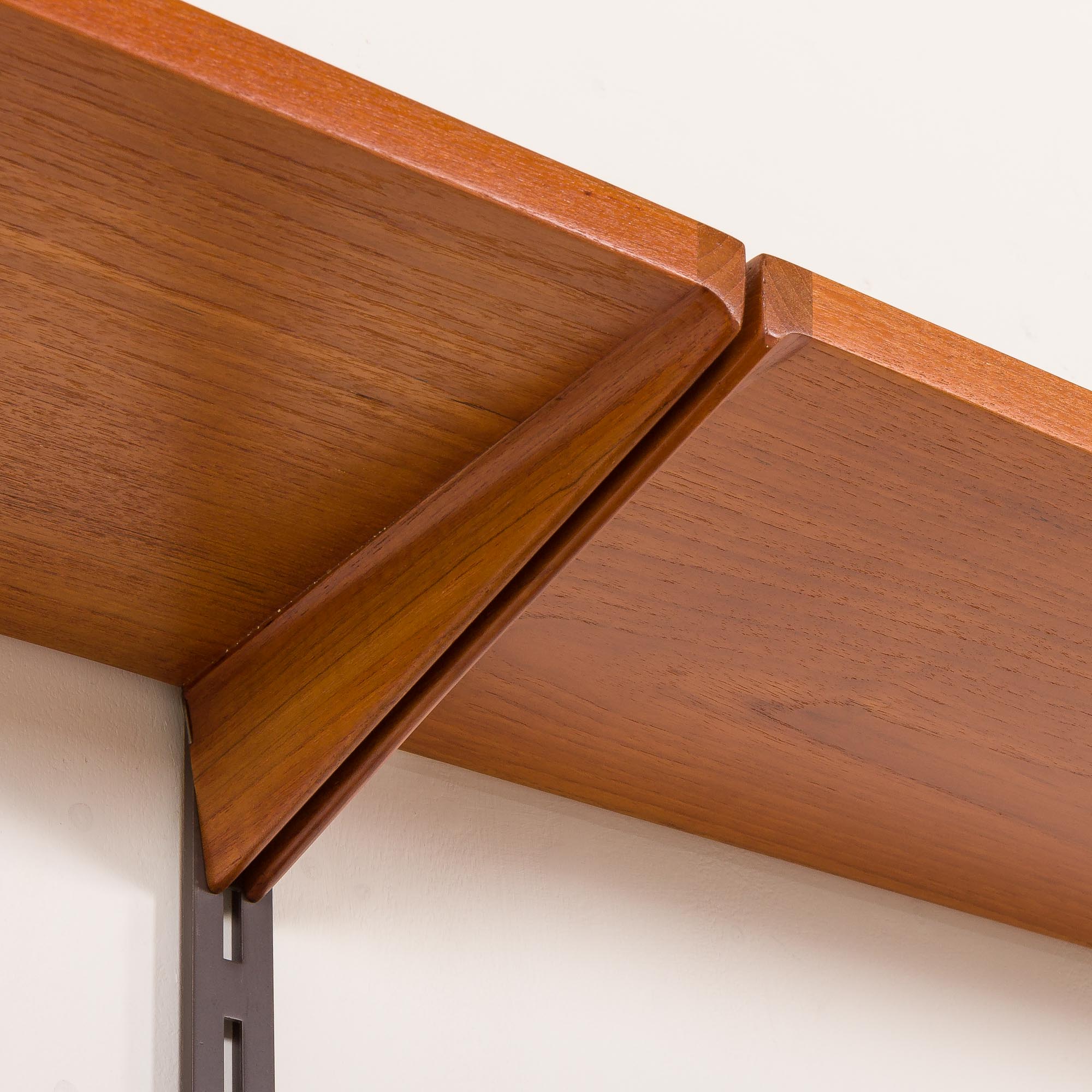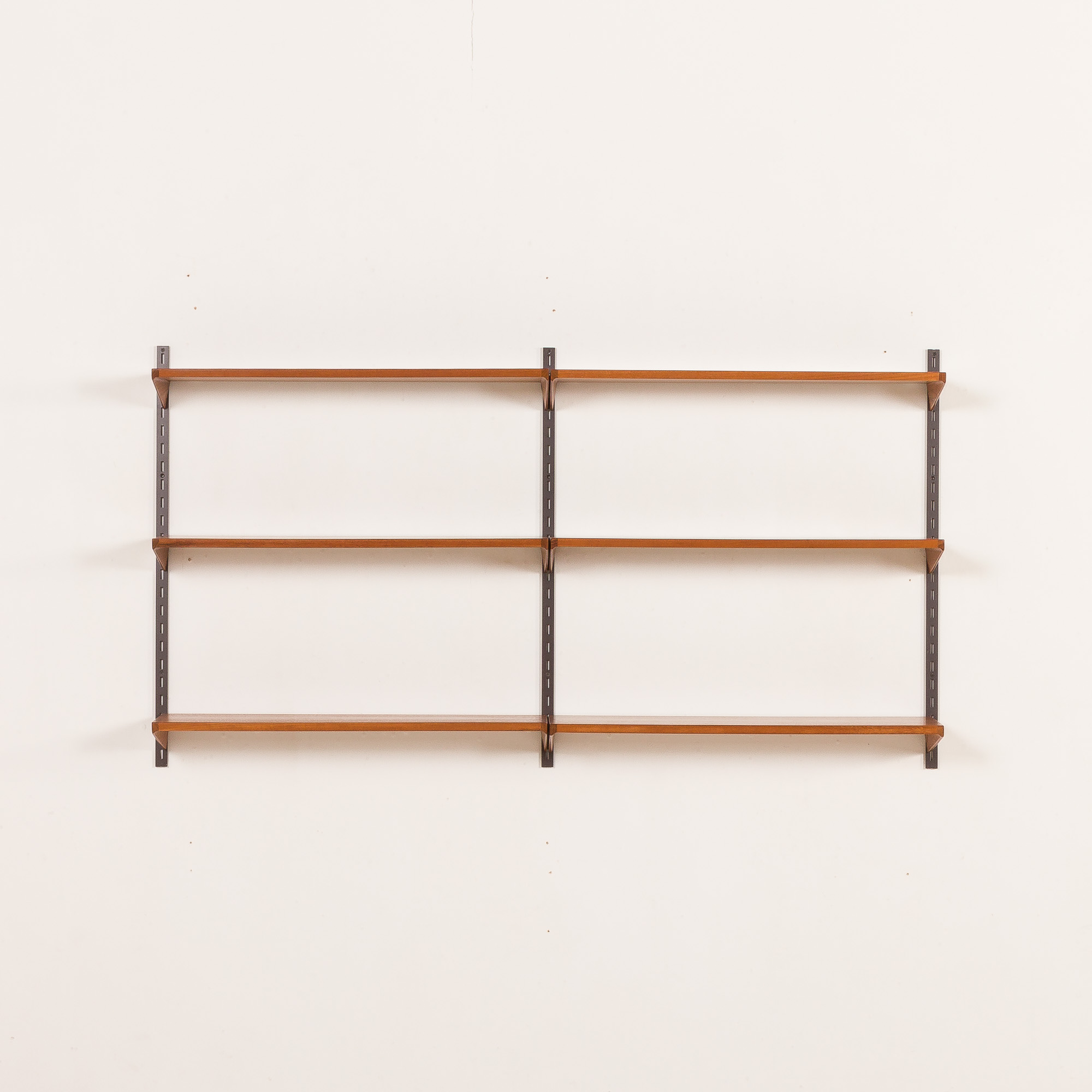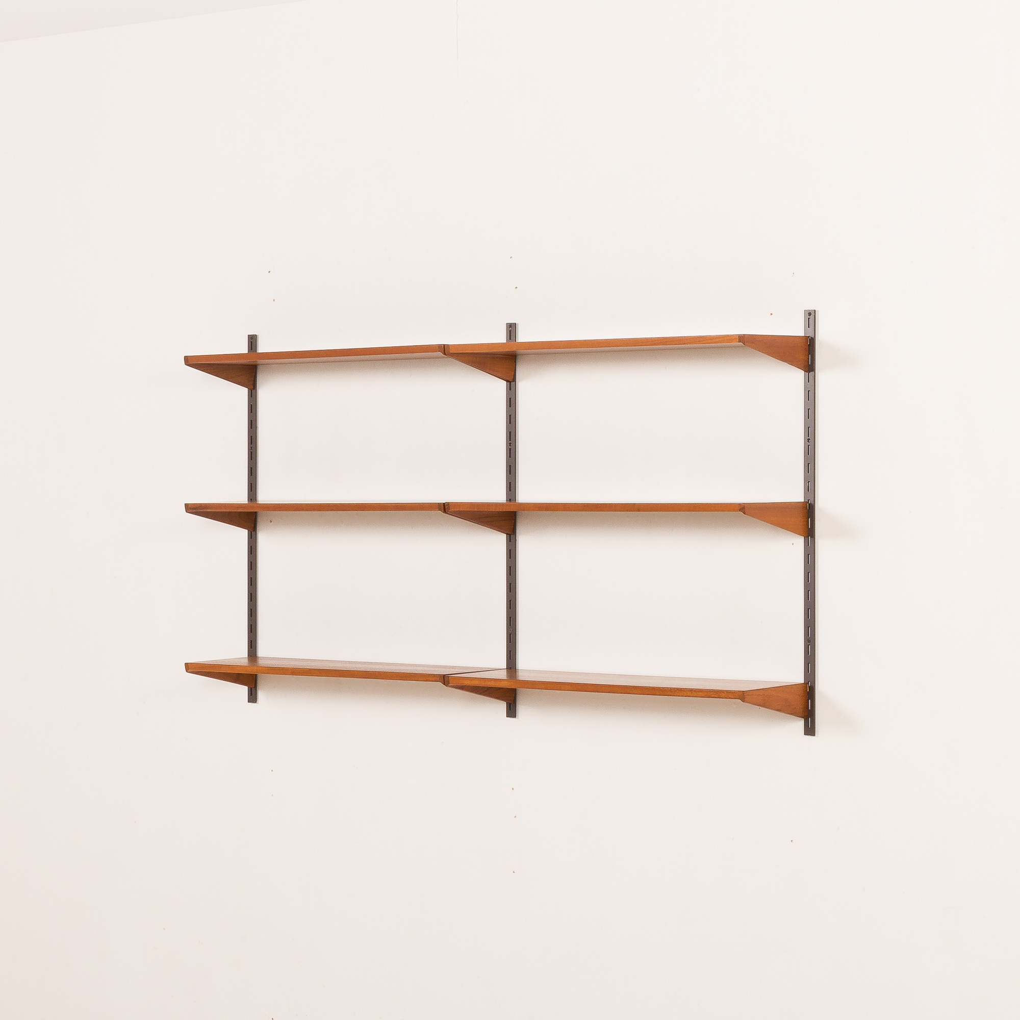The shelving system has been renovated. The wood has been cleaned with professional compounds and treated with Danish oil to enhance the beauty of the grain. The original manufacturer’s sticker on the back of the shelf confirms its authenticity.