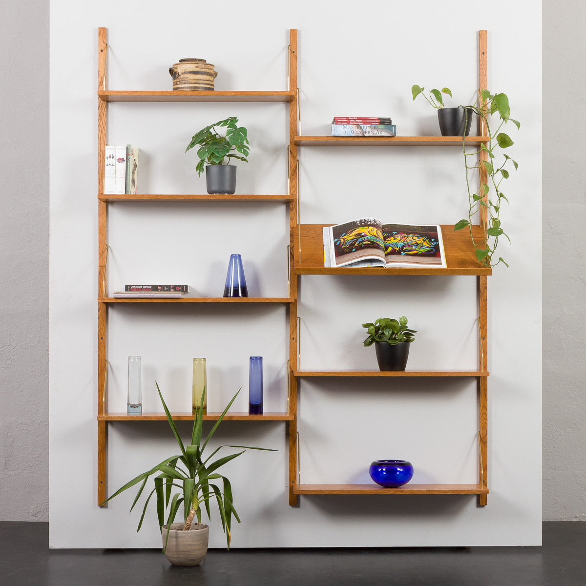 A mid-century upcycled teak wall unit with an expository shelf, designed in the style of Poul Cadovius. It is a functional piece of furniture that can hold books, magazines, and small decorative items. It can be a great addition to any bedroom, entry hall, or small living room. The shelves are 20 cm deep and can be moved lower, higher, and interchanged. The rails are divided into six parts that allow for different settings, including parallel and semi-parallel configurations. The setup depends on your preferences and needs.
