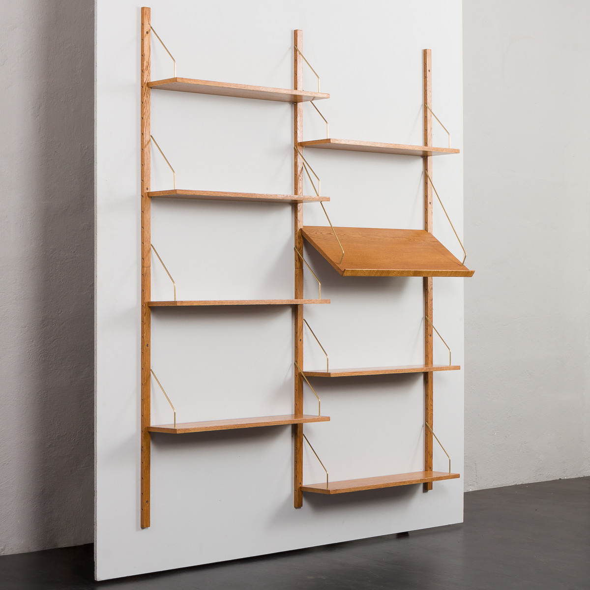 We have upcycled most of the parts of this unit, which come from the 60s. We use old and new parts to create a uniform mid-century look. The shelves have new veneer and were refinished, to a uniform look. The brass hardware shows some patina. The rails are in solid oak. All the wood has been treated with a Danish oil finish.
