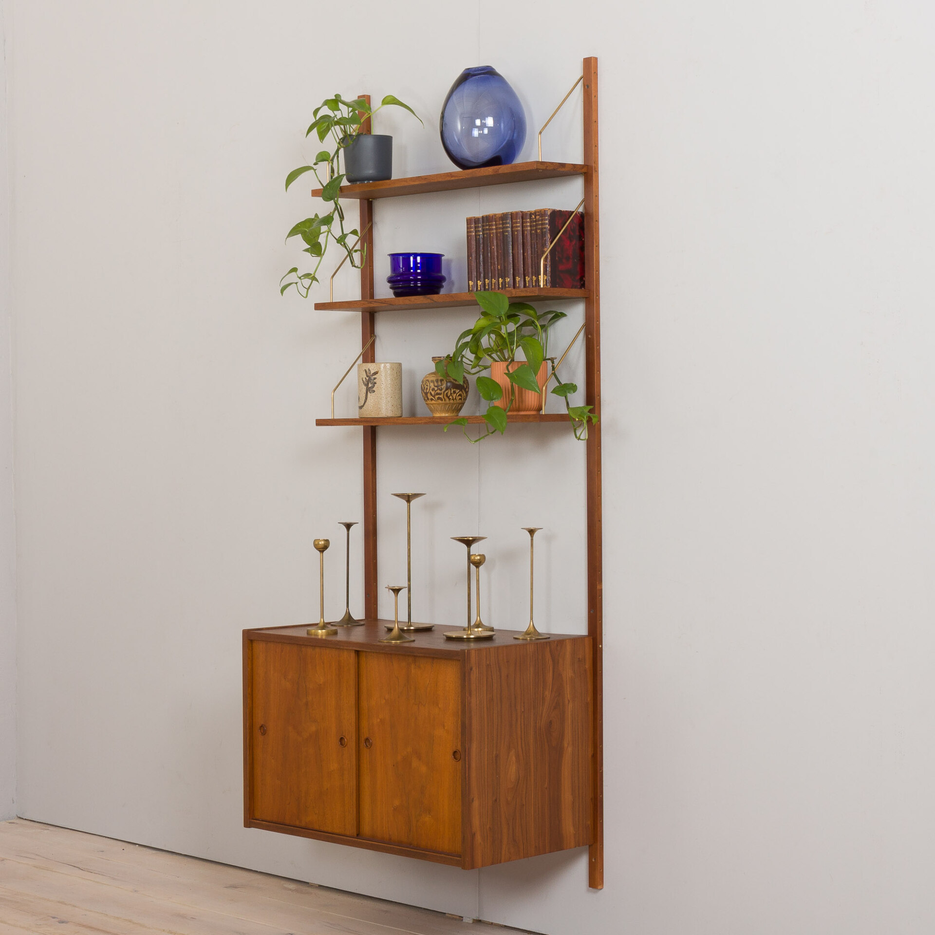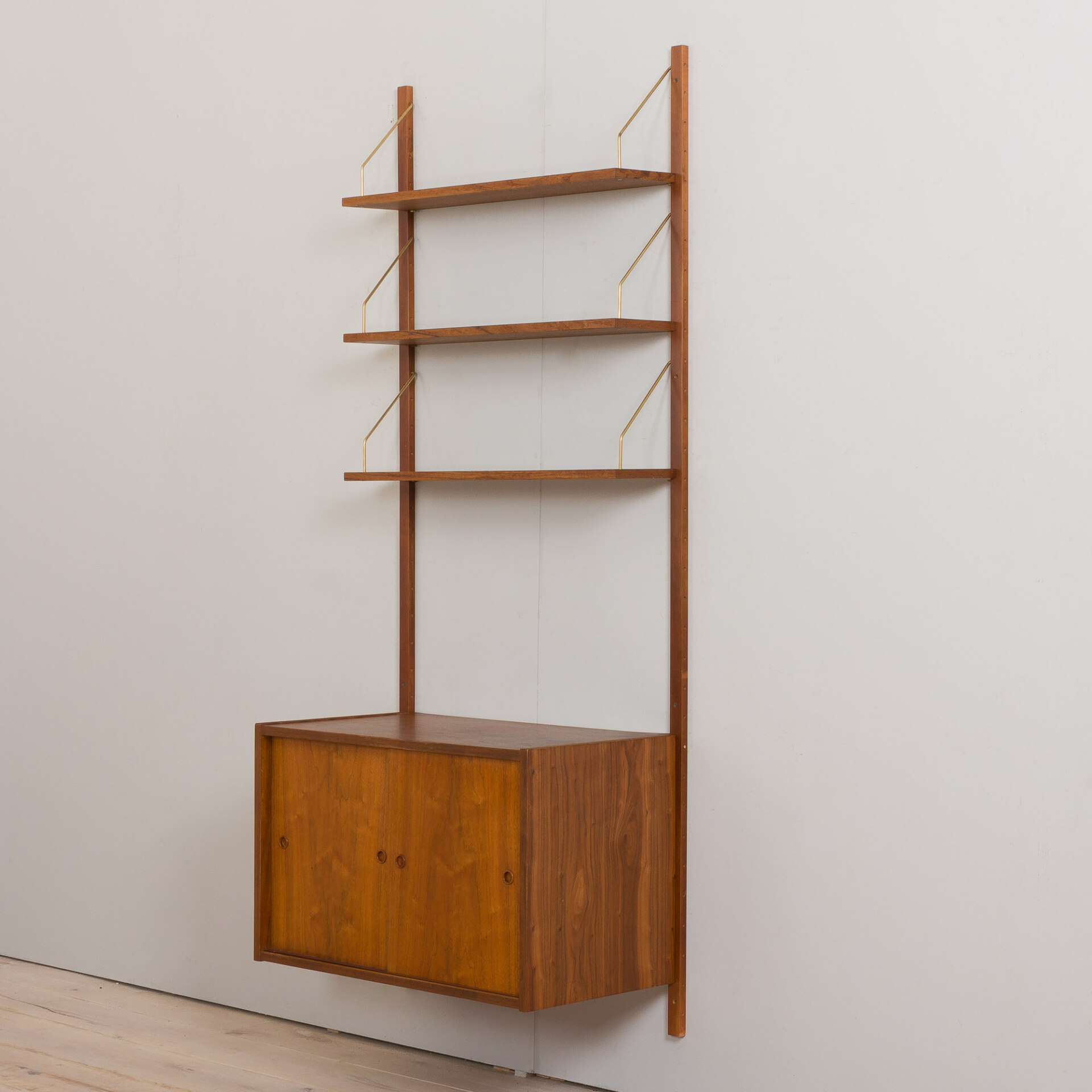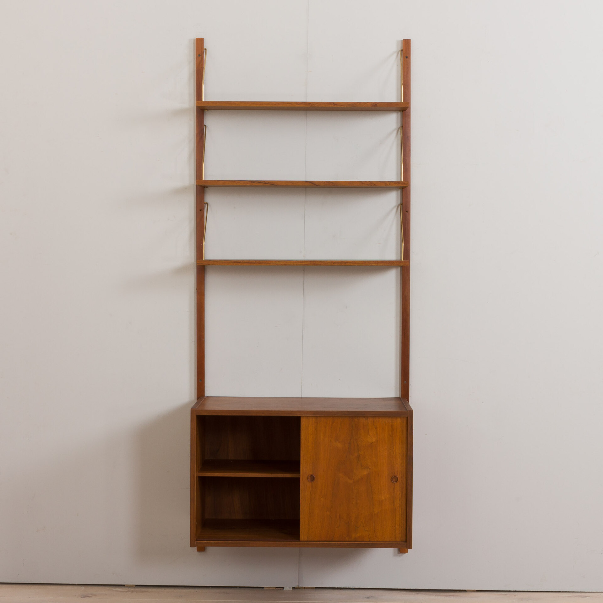Unité murale danoise en teck avec une armoire et trois étagères fabriquée par PS System. Elle est étroitement liée aux célèbres projets de Poul Cadovius des années 60. Ce système d'étagères est modulaire. Tous les éléments ont une largeur de 80 cm et peuvent être disposés à volonté.