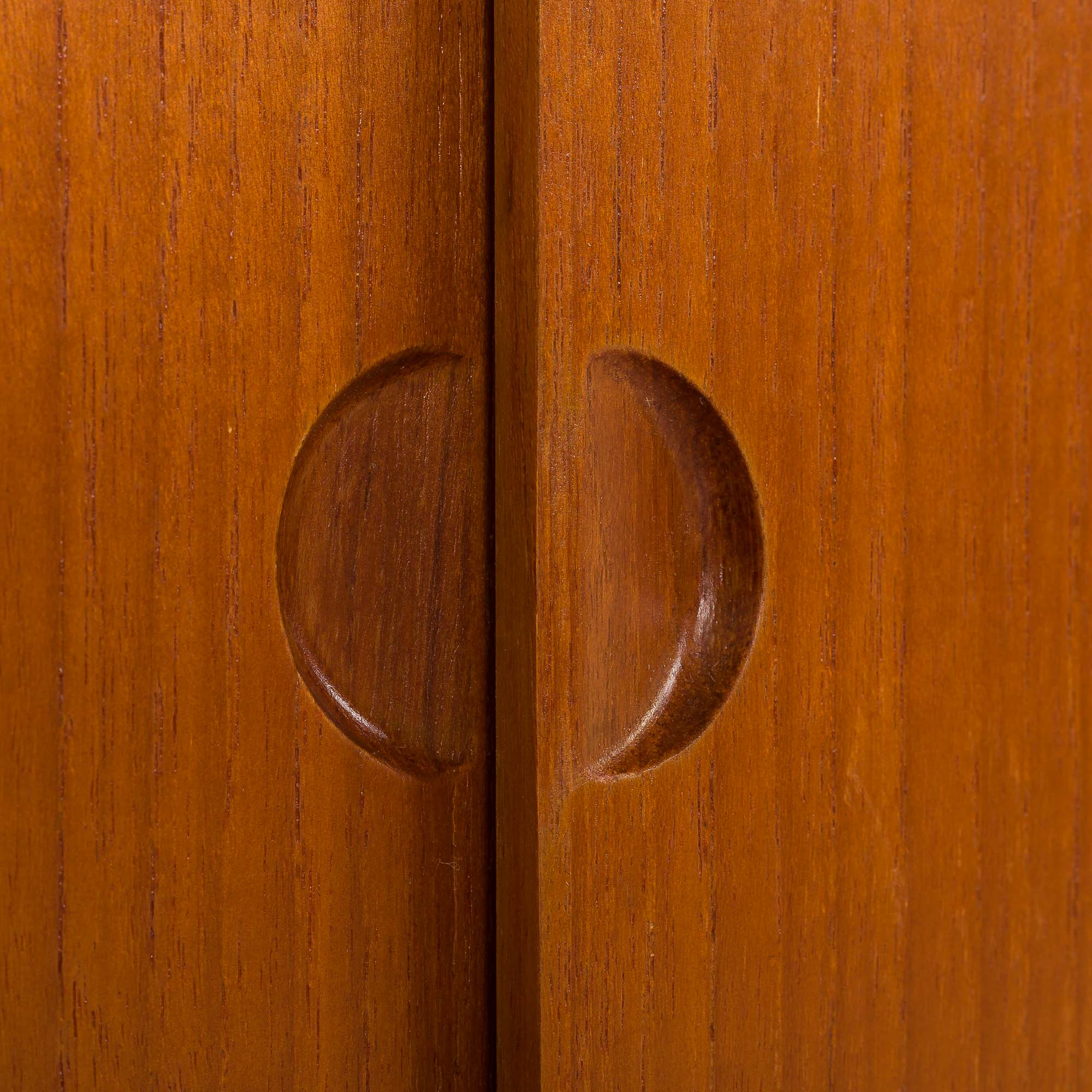 L'étagère expositive suspendue à des rails décoratifs en teck massif peut vous offrir un espace pour mettre en valeur votre disque vinyle préféré, vos posters ou d'autres œuvres d'art. Les armoires à portes coulissantes disposent d'étagères supplémentaires pour vous aider à organiser l'espace intérieur. La gravure “Made in Denmark” sur les étagères valide son origine scandinave.