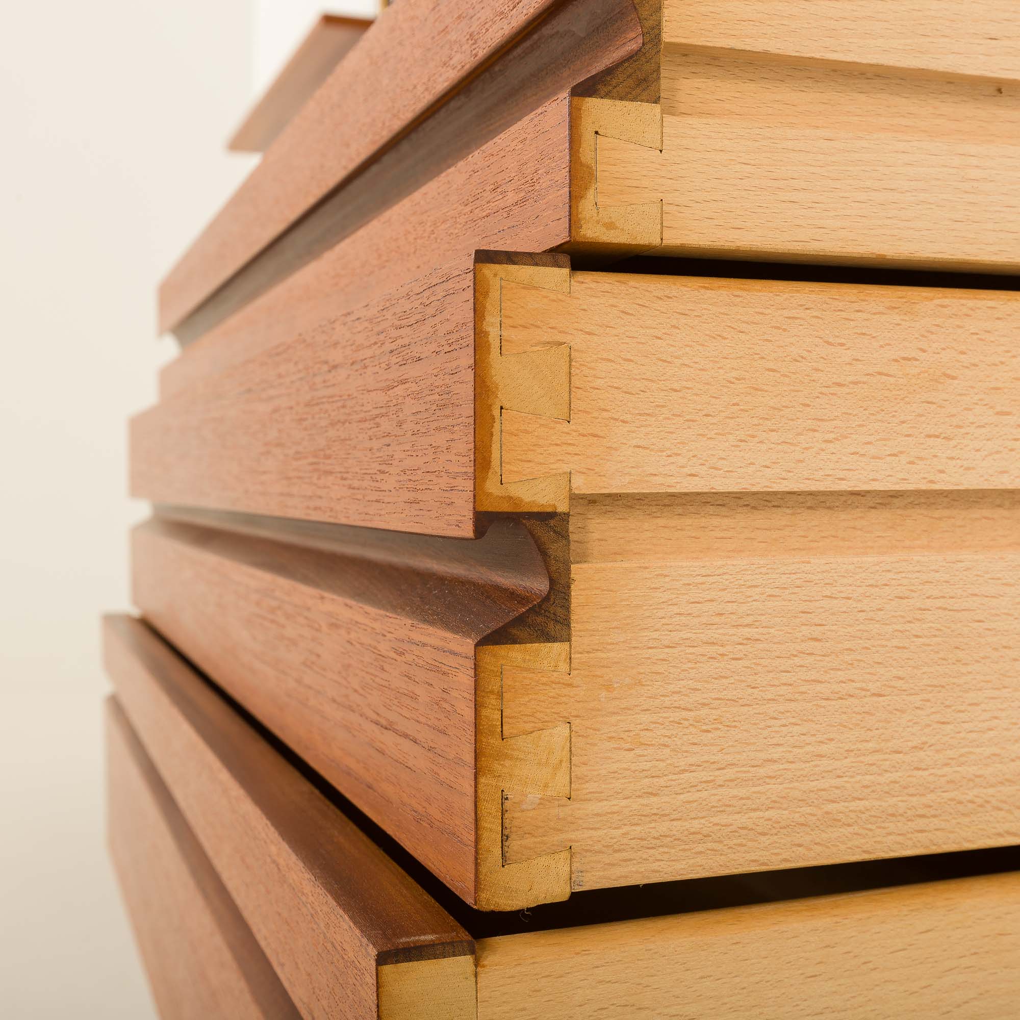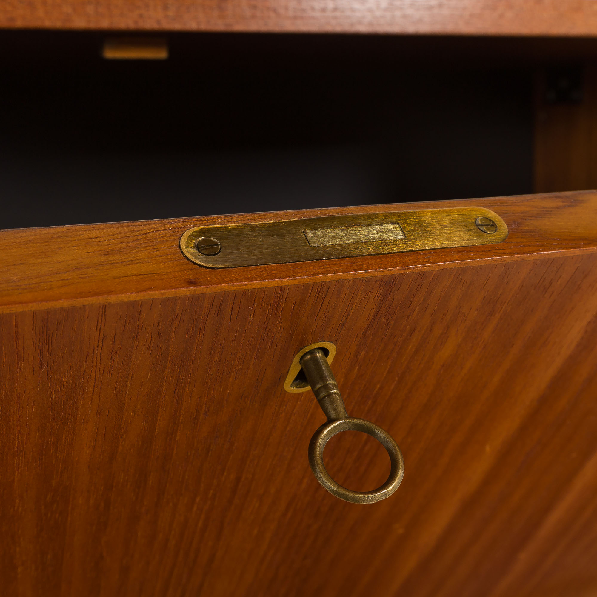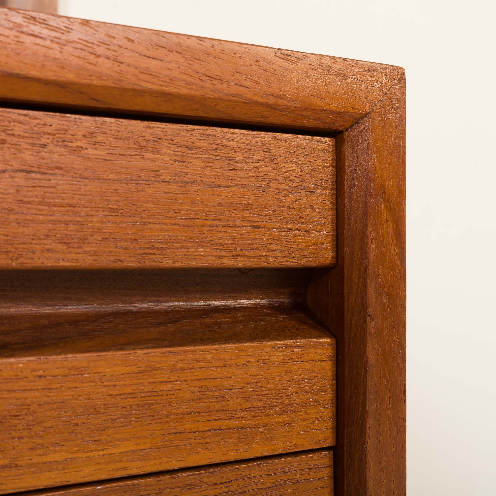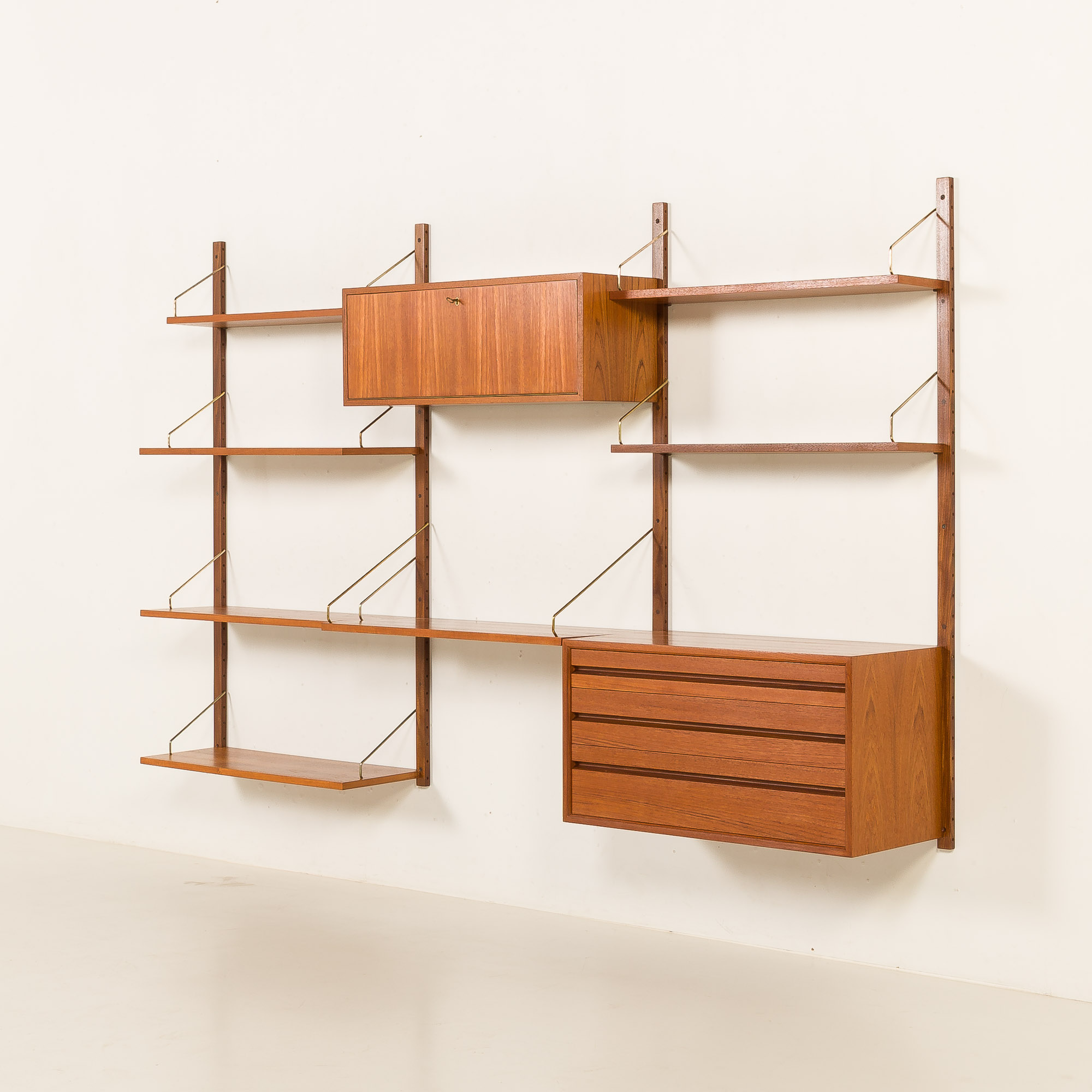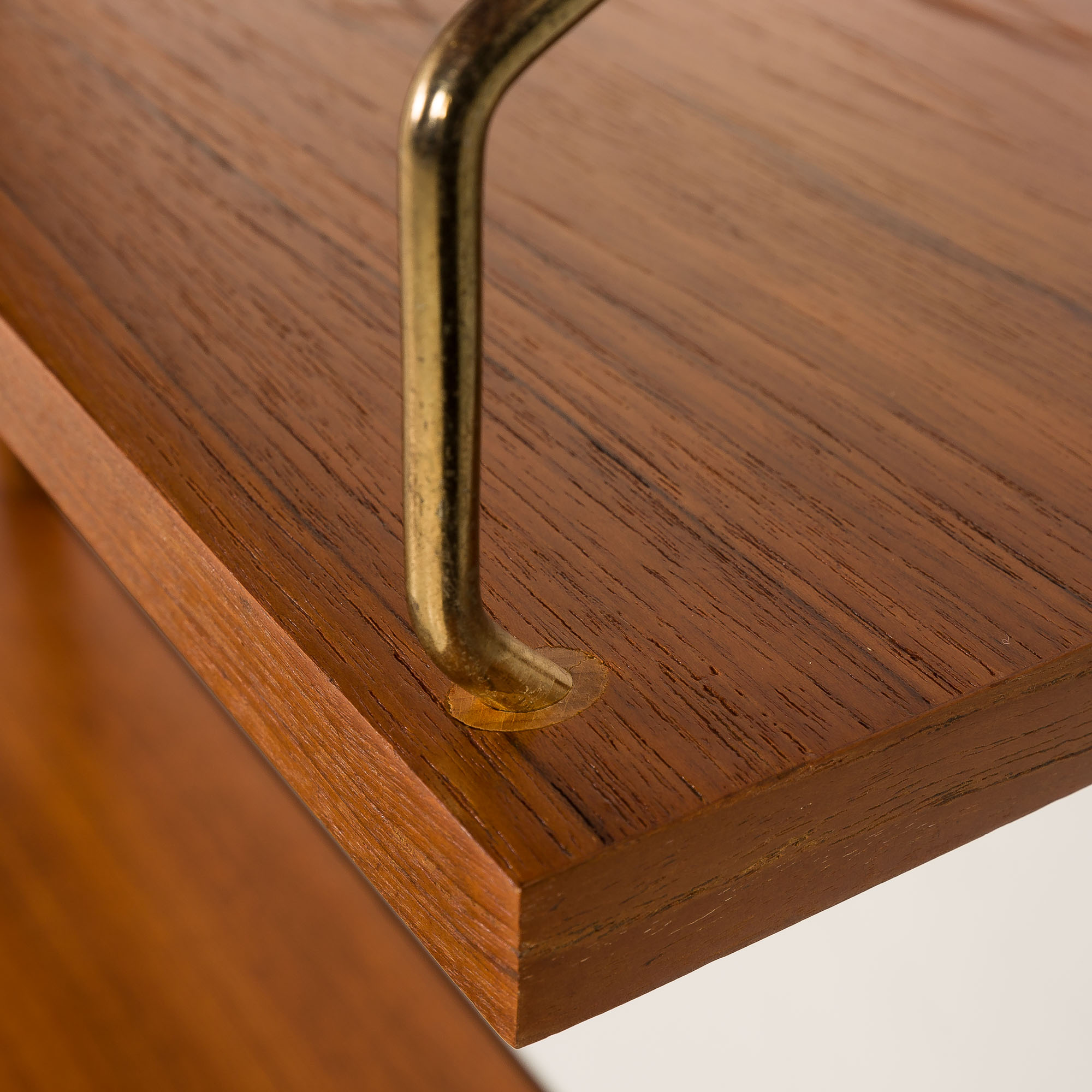 Les façades des tiroirs sont assemblées à la queue d'aronde, une technique exigeante et de plus en plus rare dans la fabrication de meubles modernes. Les poignées sculptées dans le bois massif, joliment intégrées et presque invisibles, ainsi que le profil épuré, semblable à un cadre, qui entoure les tiroirs, sont caractéristiques des créations de Cadovius. La variété des composants offre un mélange polyvalent d'options d'exposition et de stockage. Outre les étagères ouvertes, l'ensemble comprend également un meuble-bar verrouillable à portes abattantes.