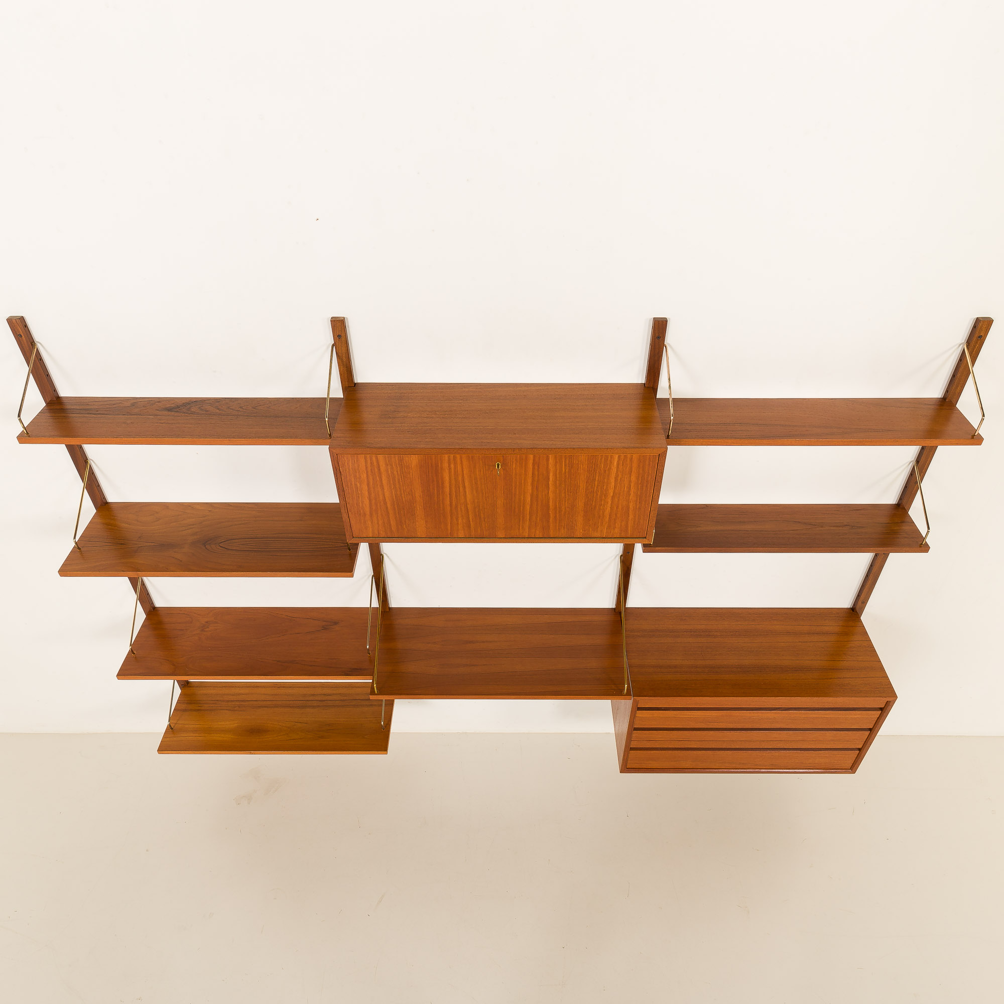 L'unité murale a été rajeunie par notre équipe. Nous avons veillé à ce que tous les tiroirs et toutes les portes fonctionnent parfaitement et à ce que tous les éléments s'emboîtent bien. Le bois a été nettoyé avec des produits professionnels et recouvert de quelques couches d'huile danoise pour le protéger et mettre en valeur le grain du bois. Dans l'ensemble, le meuble est dans un état vintage fantastique et ne présente que des signes mineurs d'utilisation.