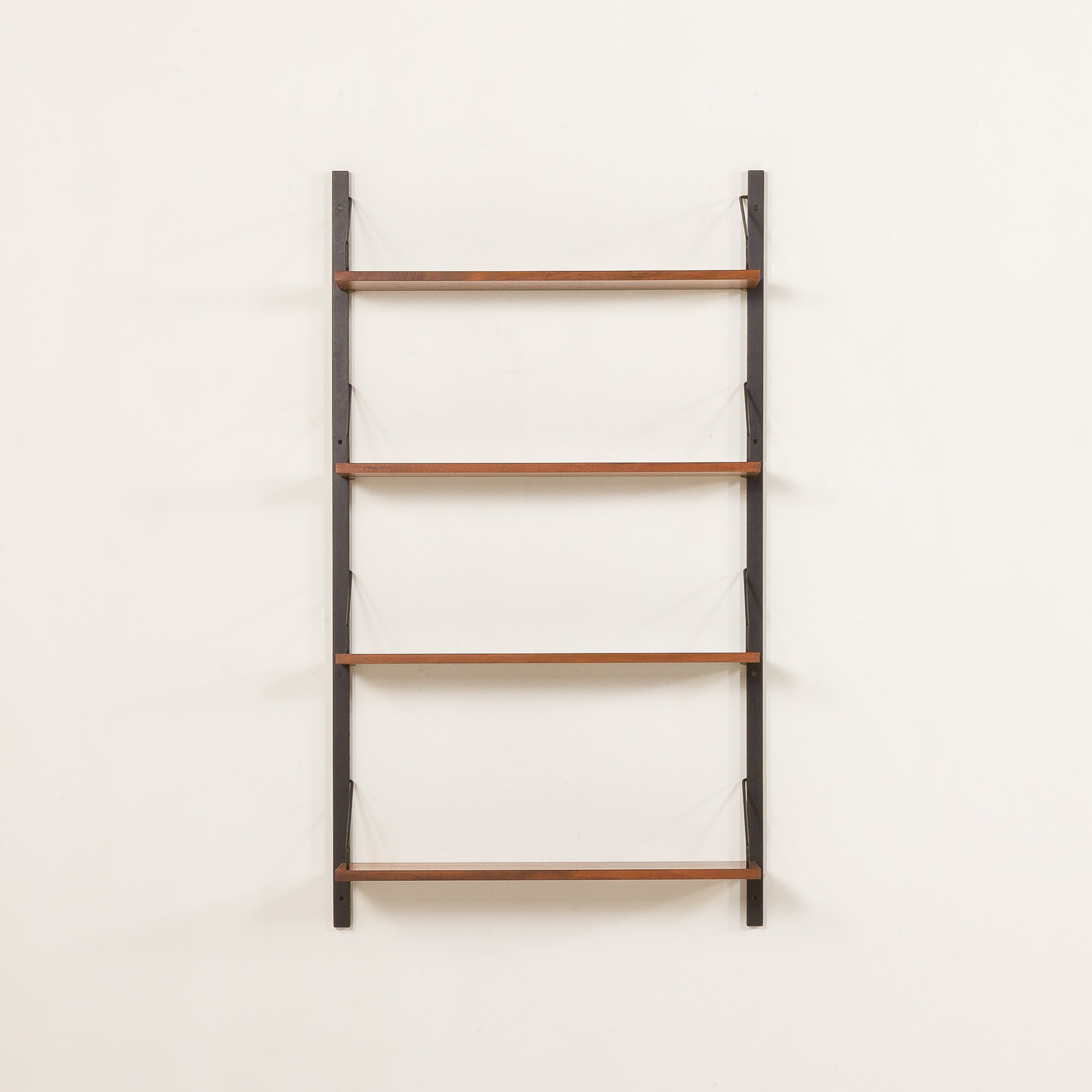 Vintage Danish set of four walnut shelves, designed by Poul Cadovius in the 1960s for Cado. It’s hanging on solid wood, black-varnished rails with black metal hardware. That’s to create a minimalist composition to expose books and decorations. It is a modular wall unit with shelves of adjustable height. Beautiful walnut veneer with rich grain will enhance any bedroom or living room.