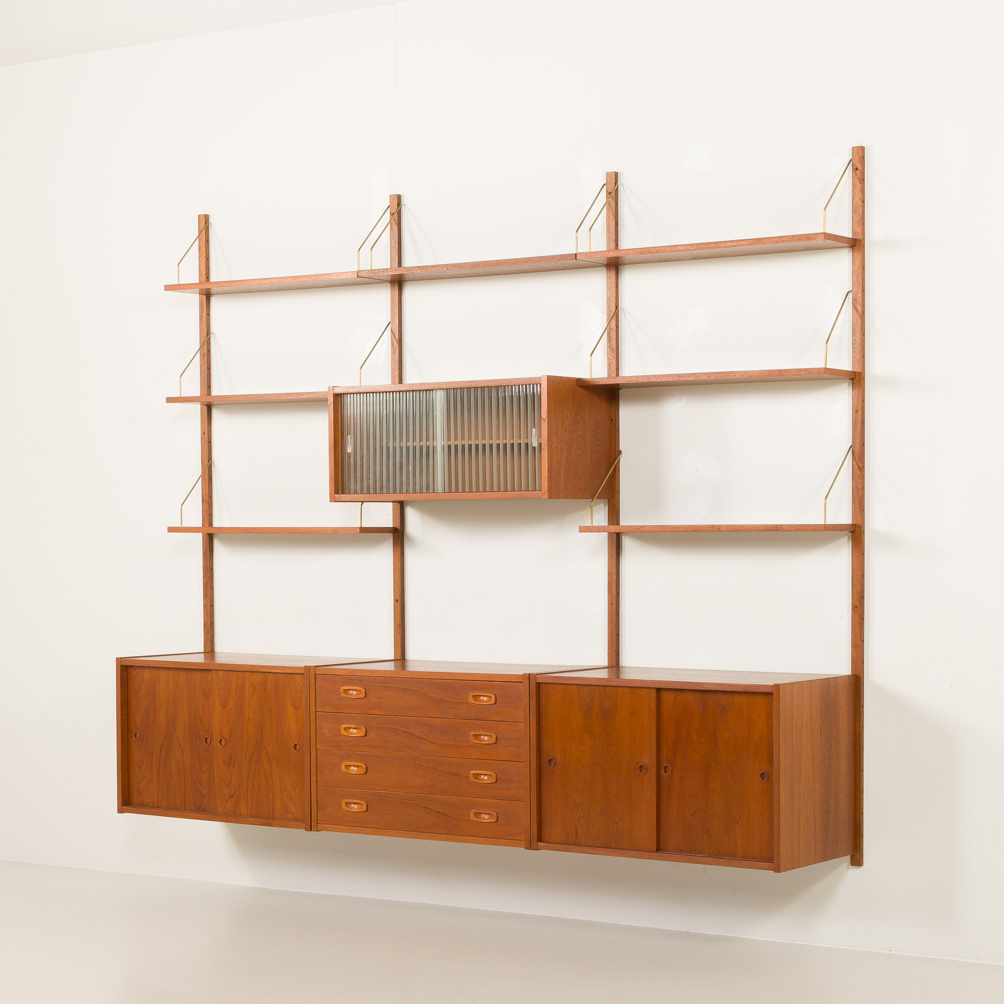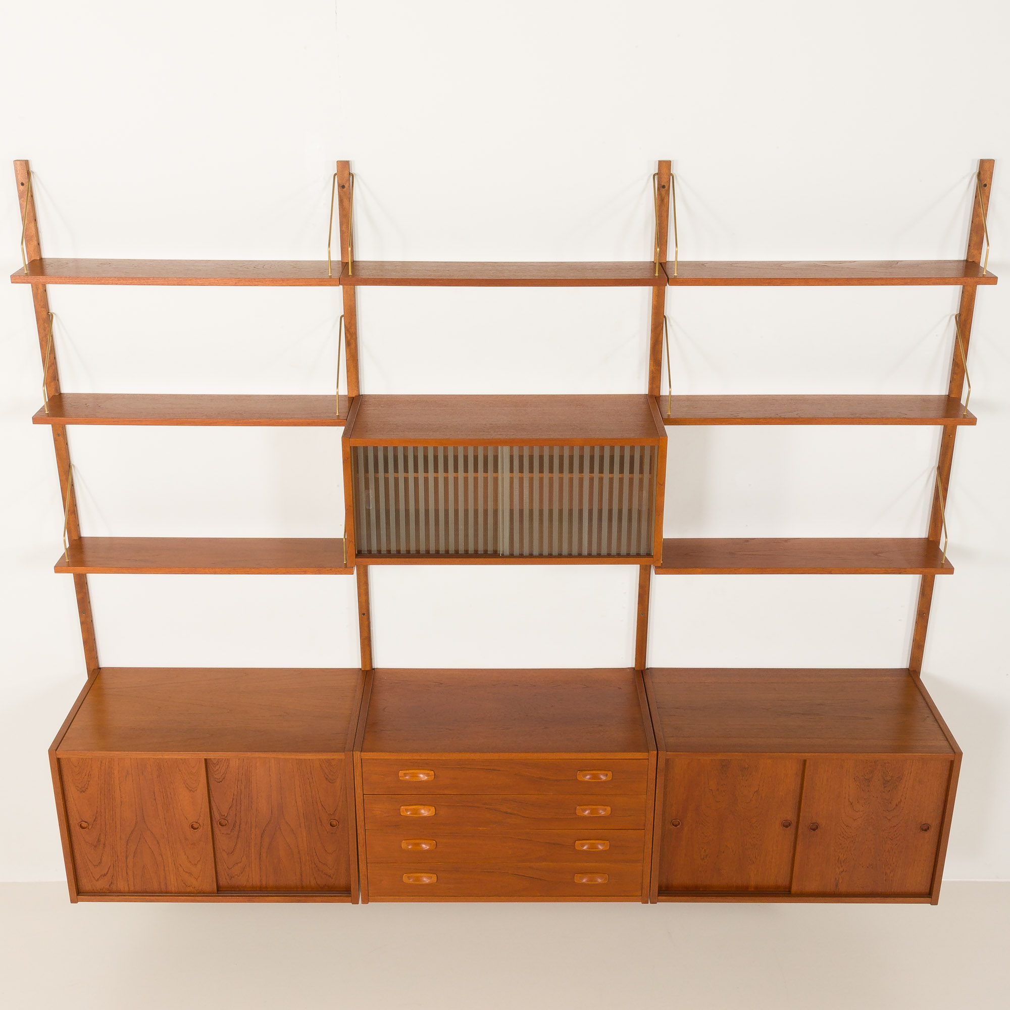 Preben Sorensen PS System three bay teak wall unit, Randers, Denmark 1960s