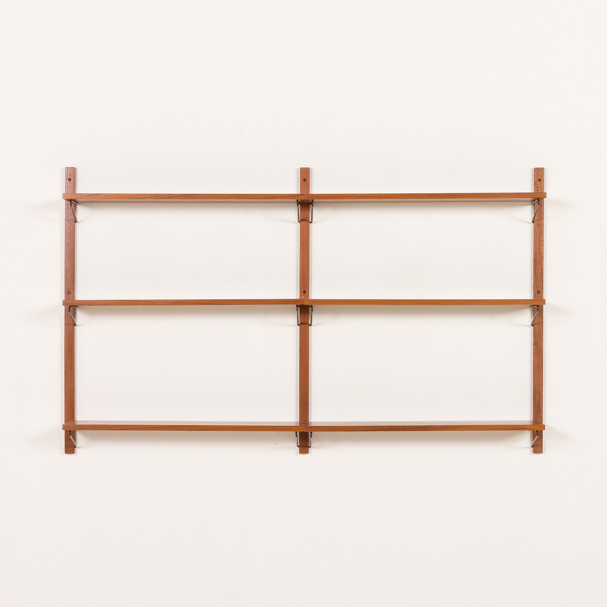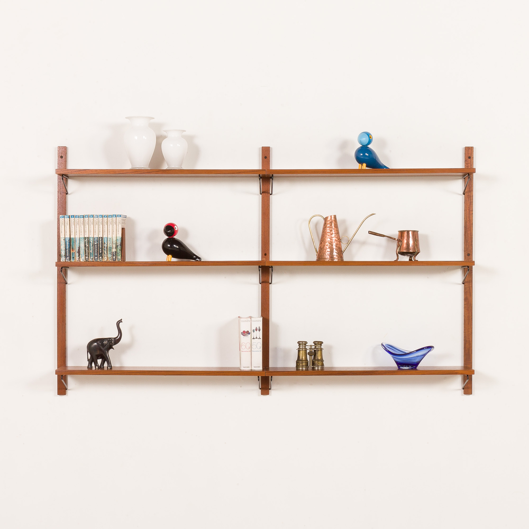The piece features six teak shelves and vertical rails crafted from solid wood. The warm teak tone with black steel brackets creates a distinctive visual balance, reflecting the craftsmanship of Danish design. The open structure and lightweight form make it ideal for displaying books, ceramics, or decorative objects while maintaining an airy, understated aesthetic. Perfect for a living room, office, or hallway, it embodies mid-century functionality.