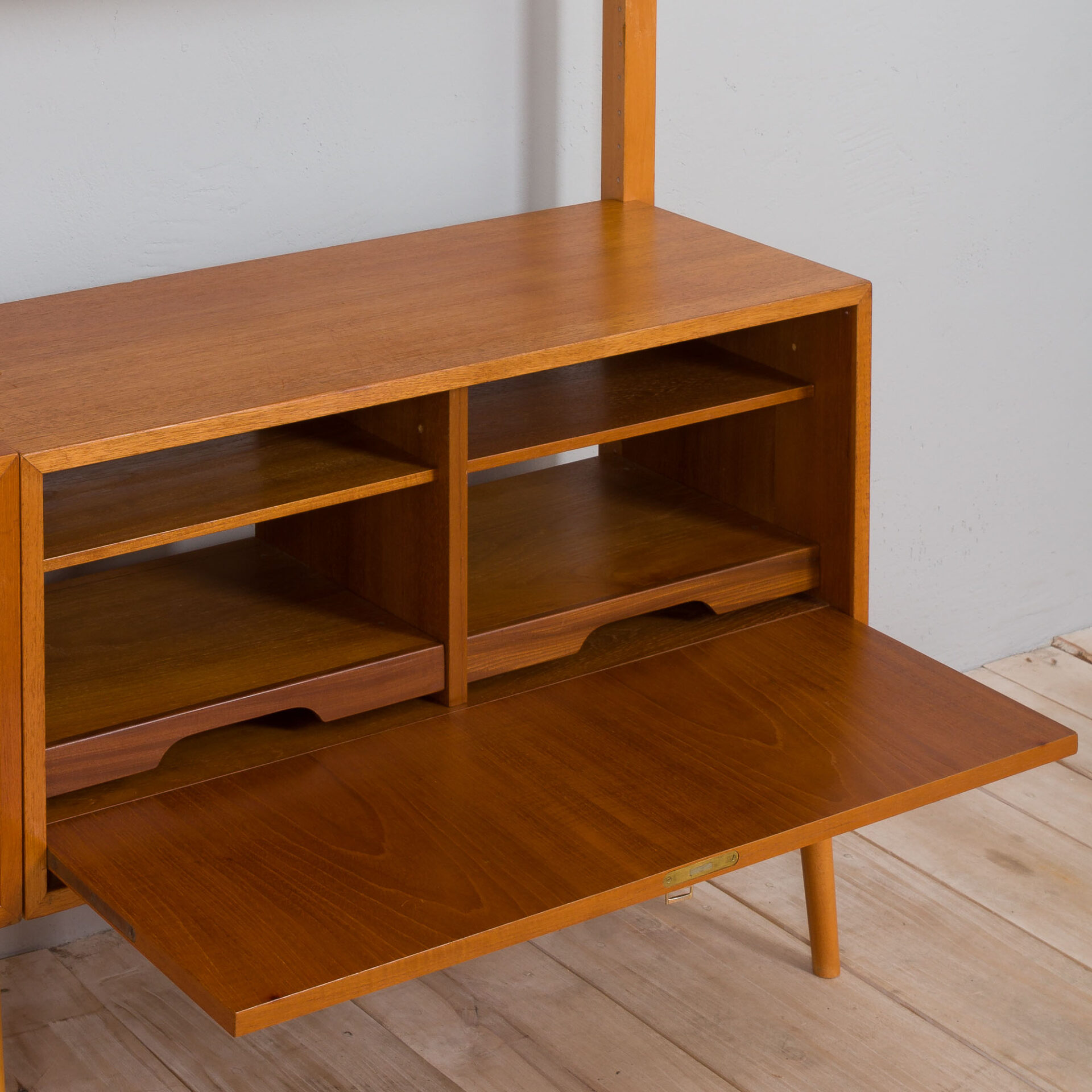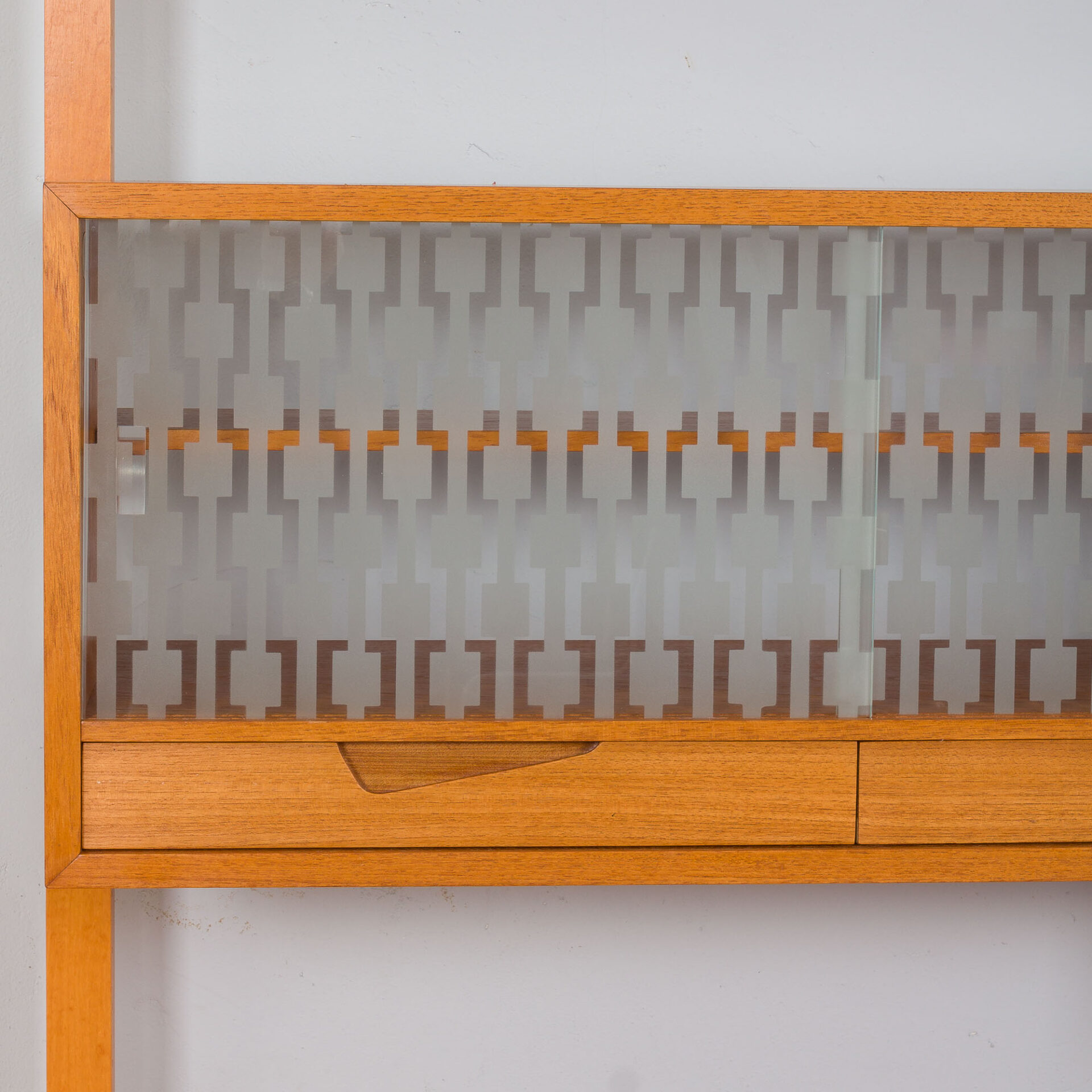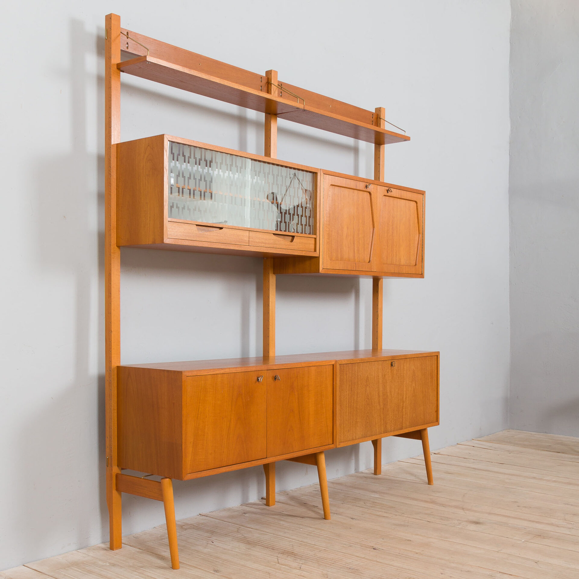Unité murale scandinave du milieu du siècle, fabriquée en Norvège dans les années 60. Il a été conçu par Kjell Riise et fabriqué par Rival Brodrene Jatogs en Norvège. L'unité se compose de :