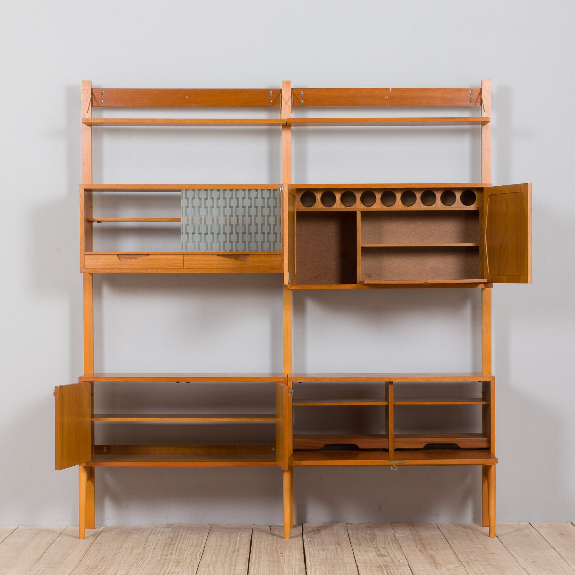 Unité murale libre scandinave à 2 baies en teck avec 3 armoires, un meuble bar caché et 2 étagères.
