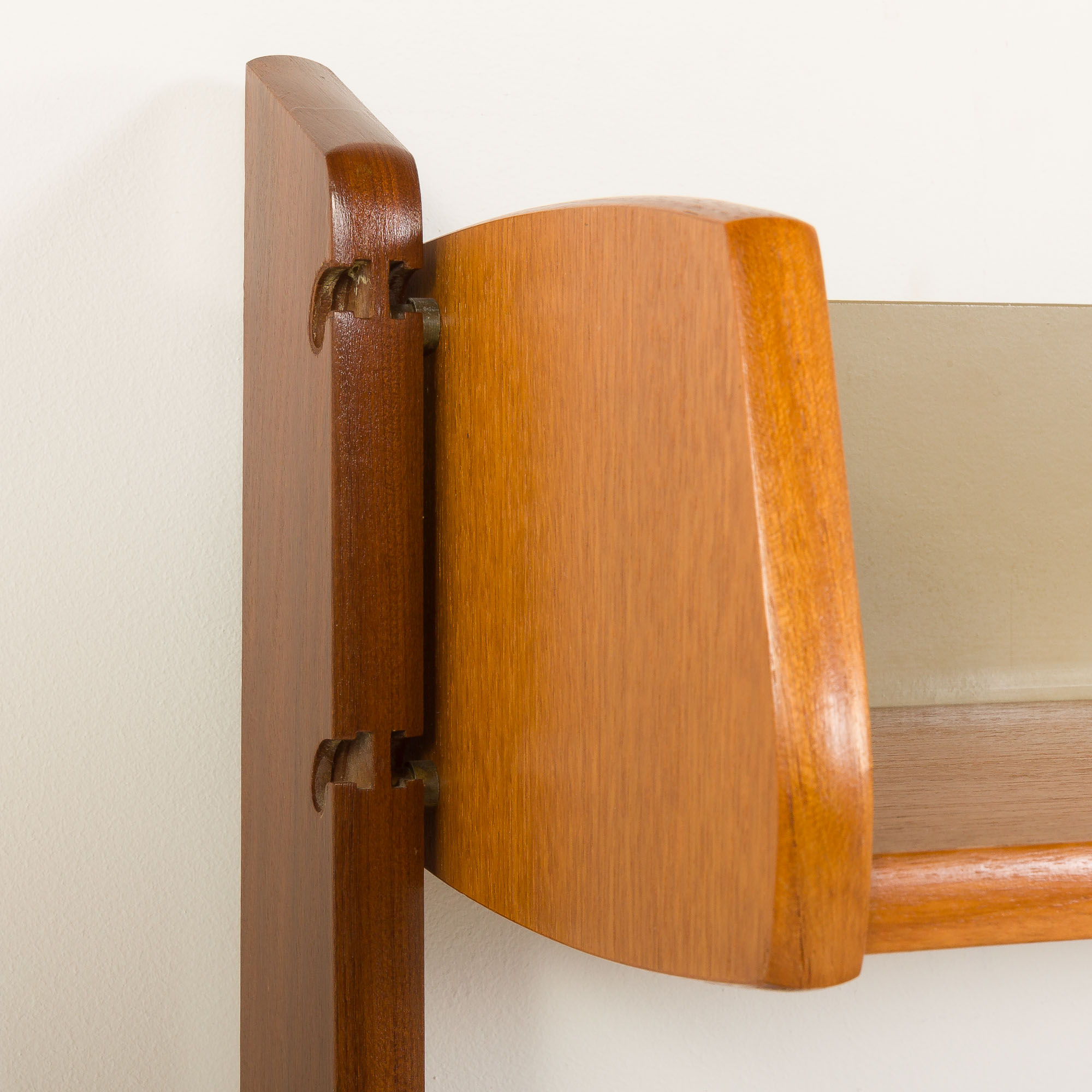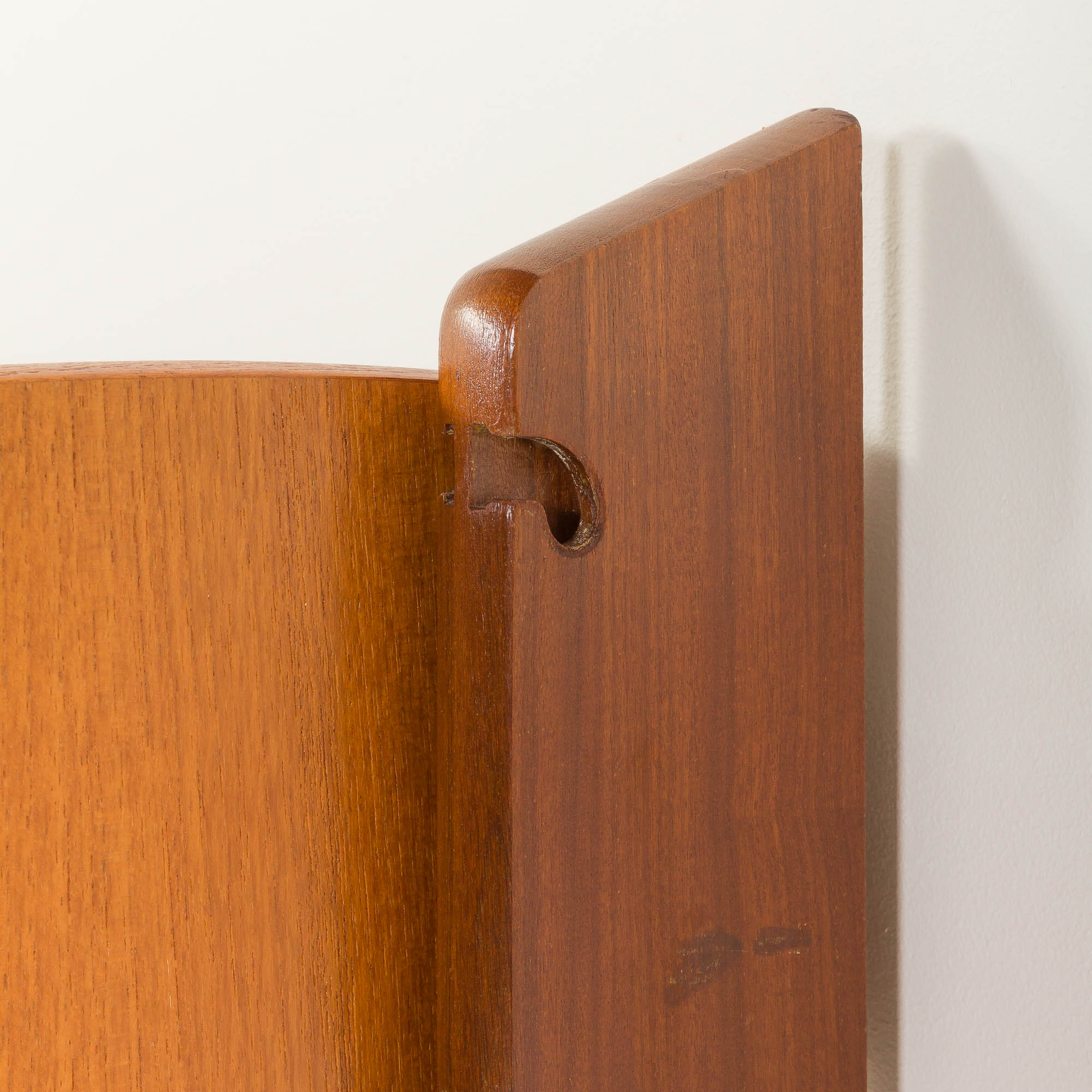 This small Scandinavian free-standing wall unit in teak comes from Norway from the 1960s. It features a practical sliding door cabinet and two shelves, including a decorative one with sides. It is a completely modular shelving system – “Ergo”, designed by John Texmon and Einar Blindheim for Blindheim Mobelfabrikk. Slightly curved cabinets make a warm impression, and sculptural rails create an elegant and grand-looking statement. This piece is perfect for a kids’ room, bedroom, or living room.