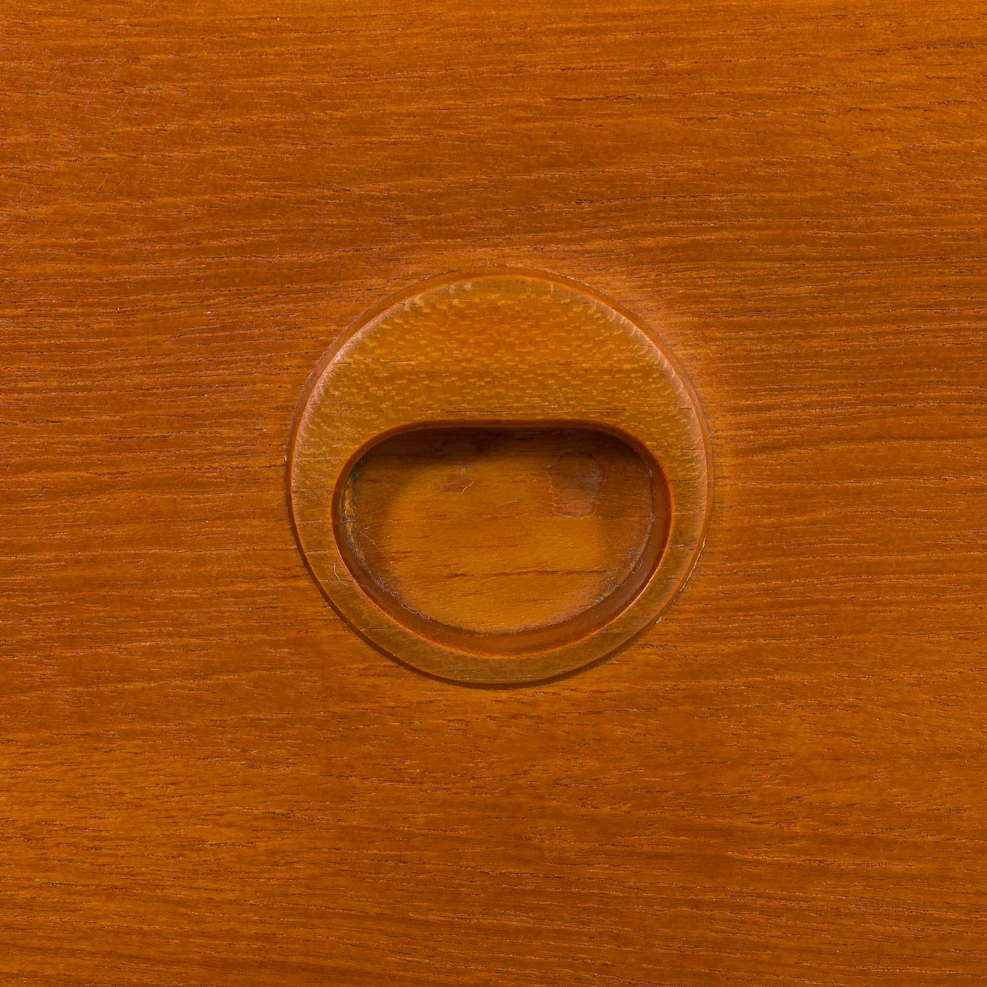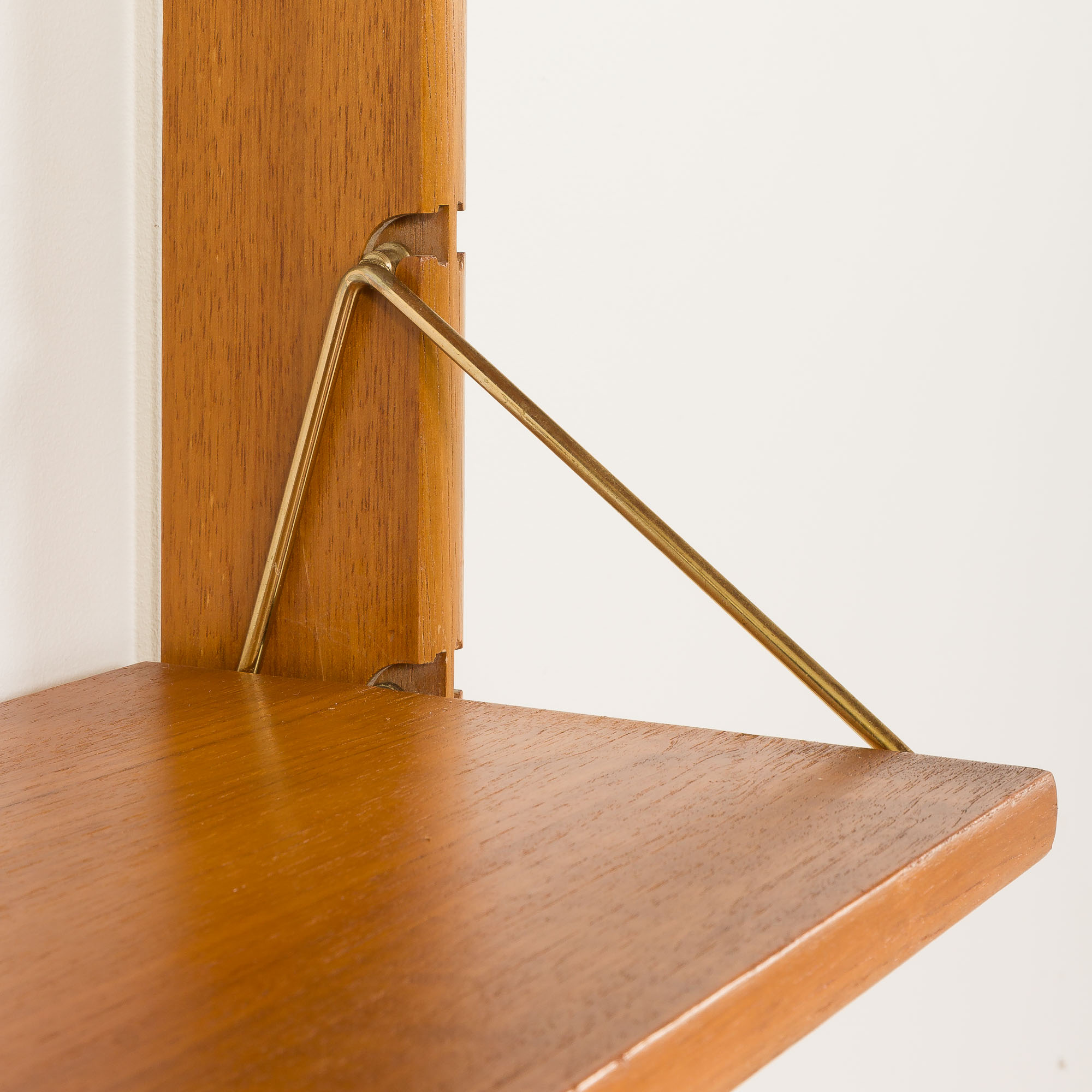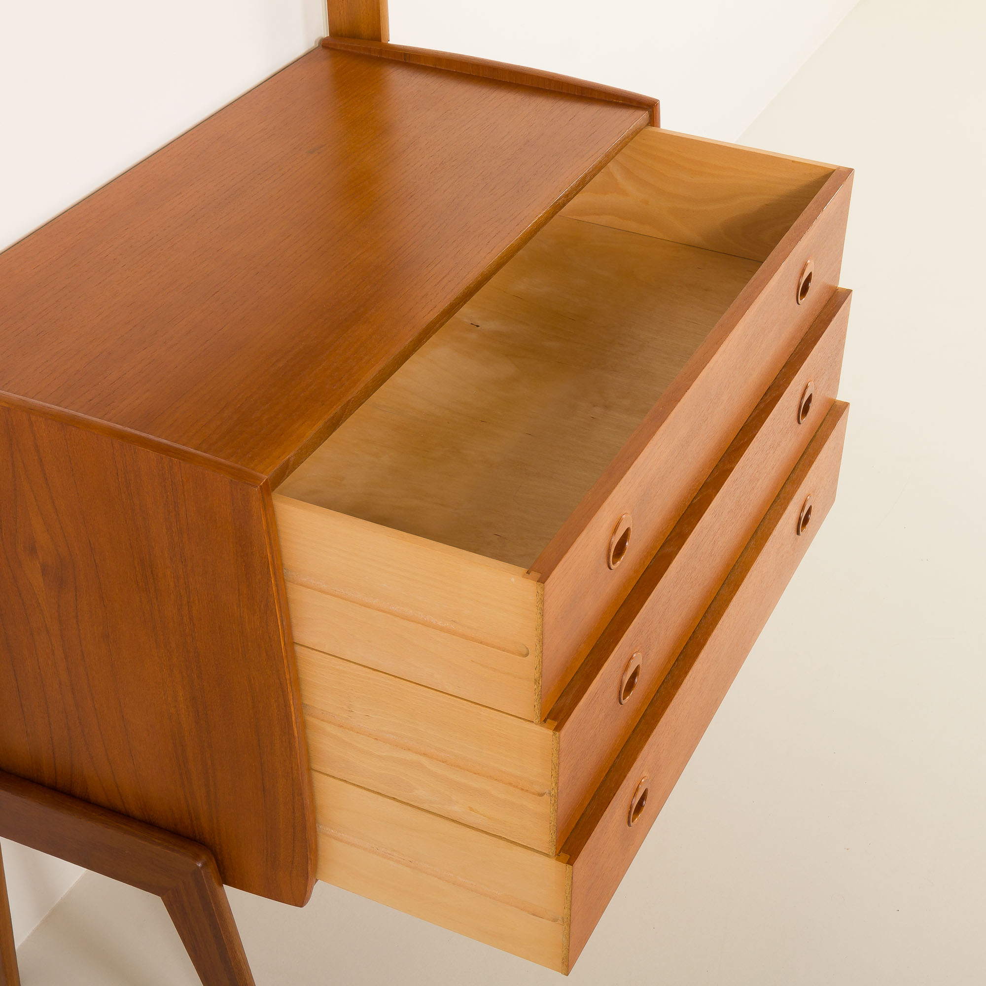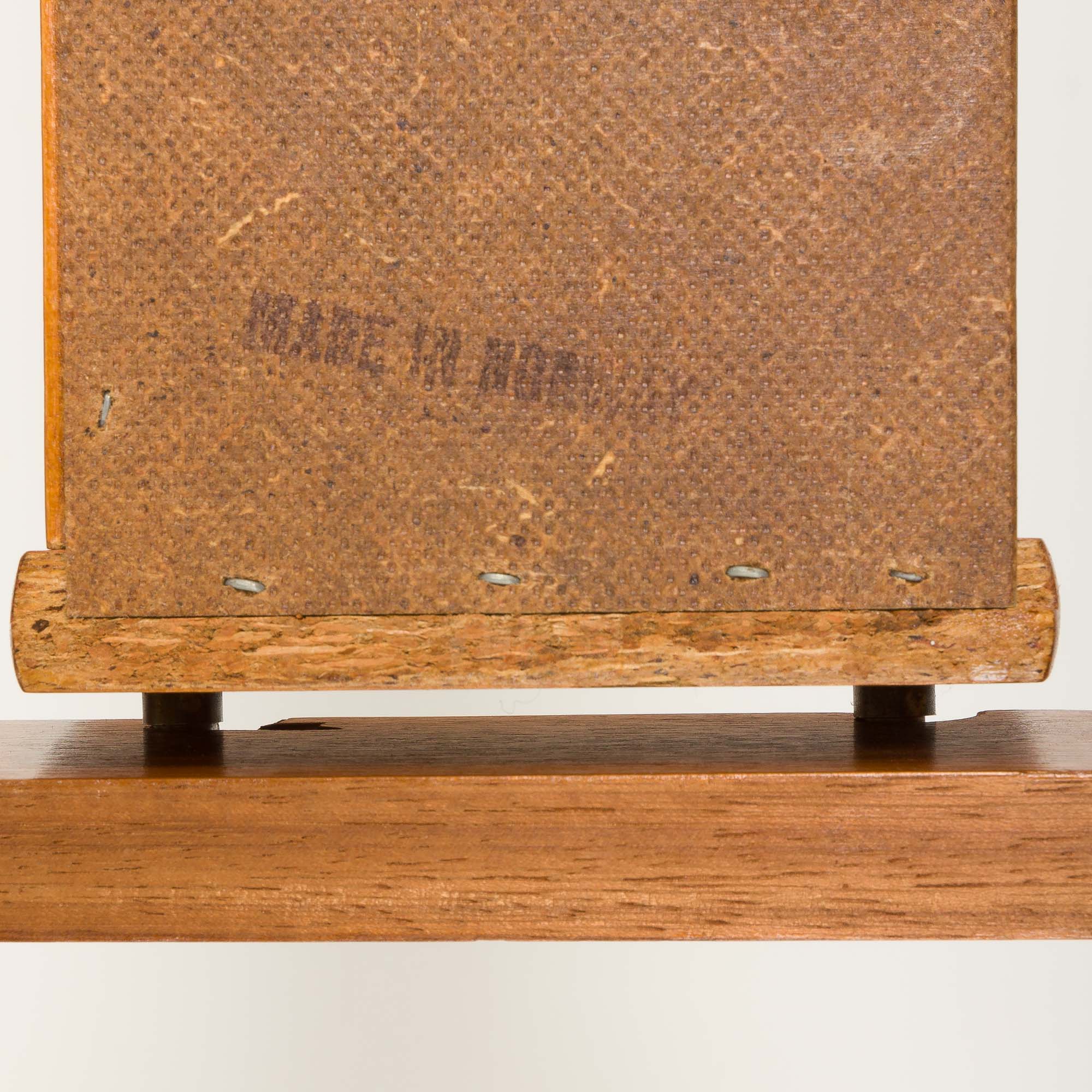 The wall unit has been checked by our team. It is in fantastic vintage condition and has undergone only minor restoration. The “Made in Norway” stamp on the back of the dresser and one of the shelves confirms the authenticity of the piece. The drawers, doors, and mounting mechanism function properly and smoothly. The wood has been refreshed using professional compounds.