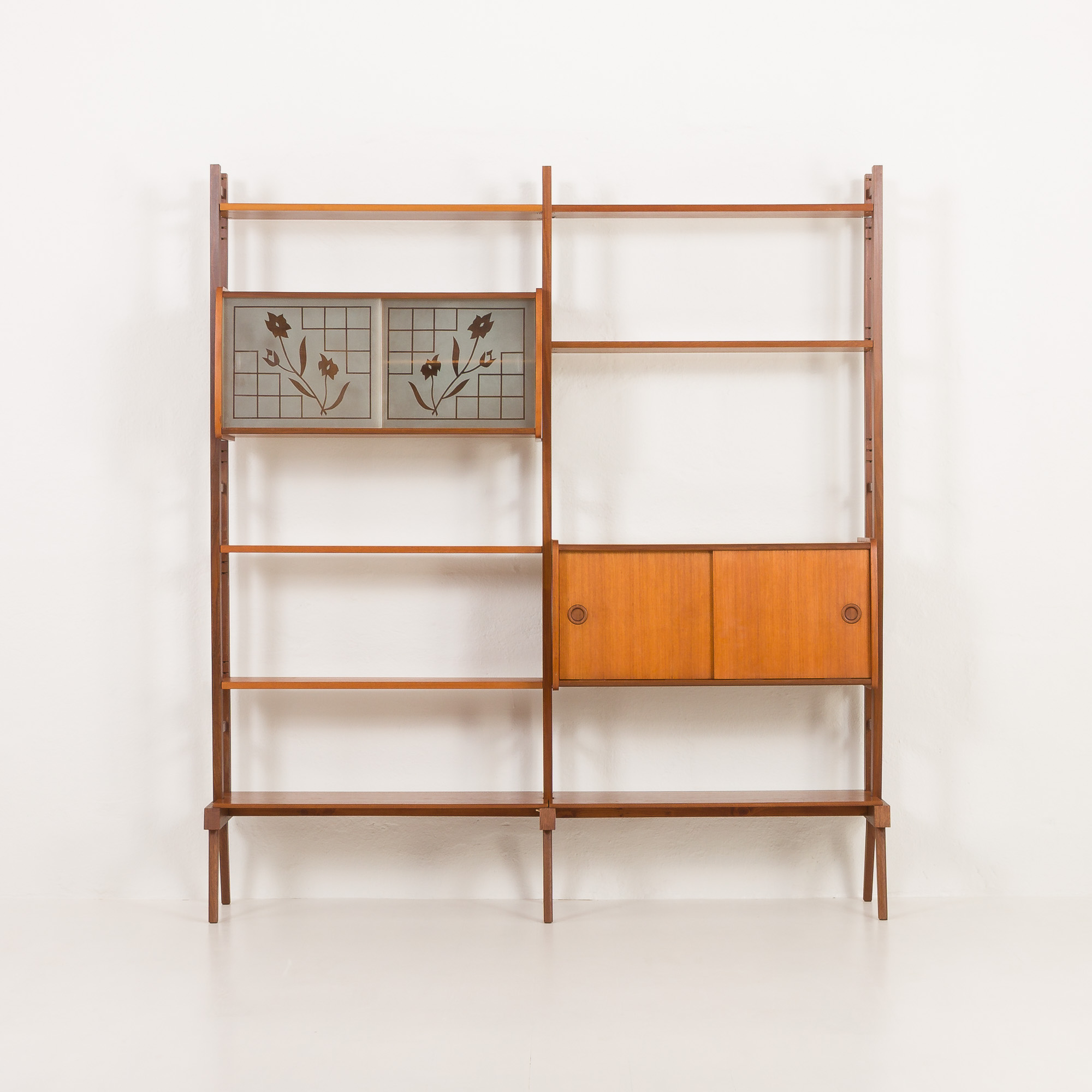 This wall unit features one spacious storage cabinet divided into two parts, five adjustable shelves, and two exceptionally deep bottom shelves for larger or heavier items. Additionally, it includes a vitrine with original glass doors that impart a warm vintage touch to the entire piece. The perfectly balanced design offers a versatile mix of display and storage options, making it ideal for living rooms or offices where aesthetics and organization are crucial.