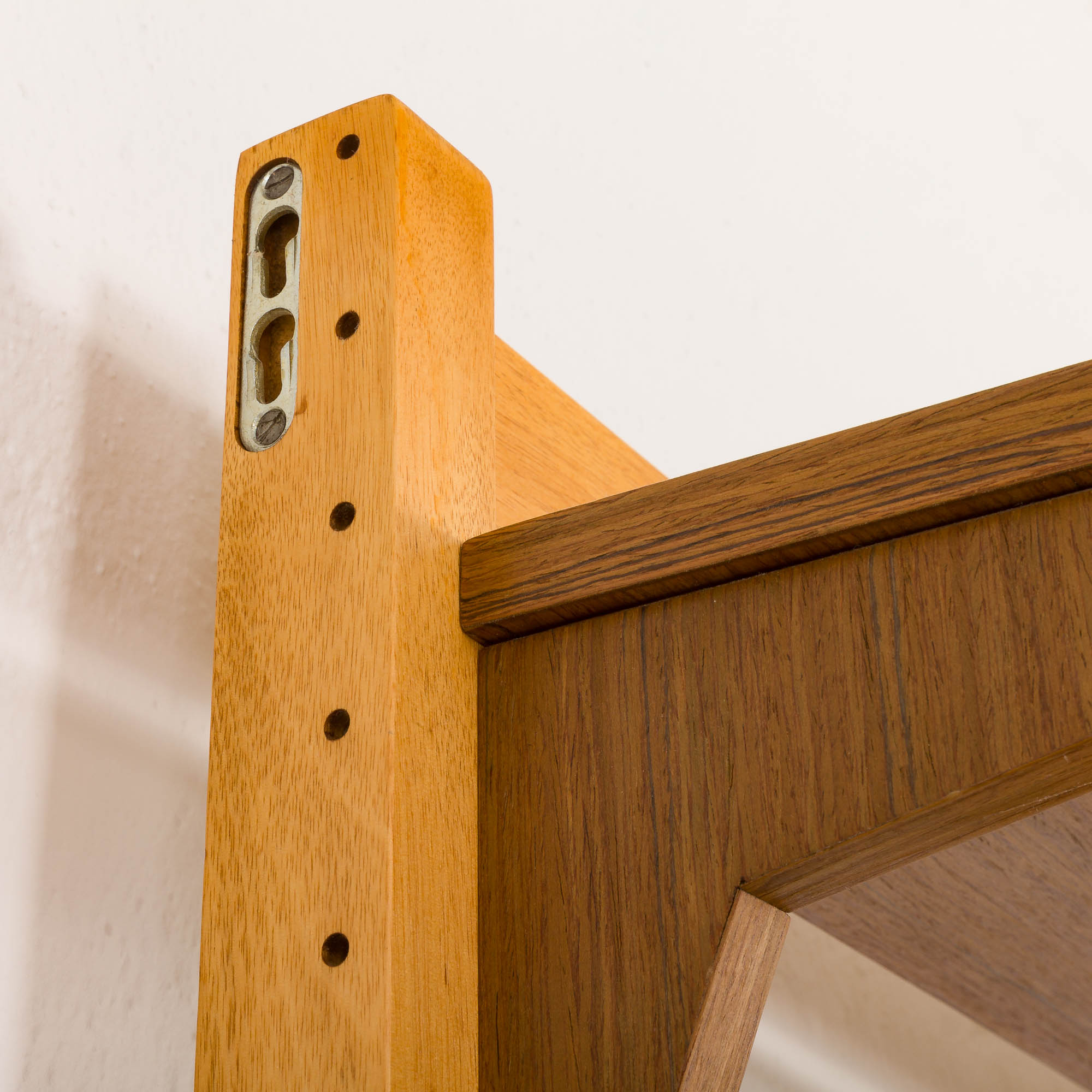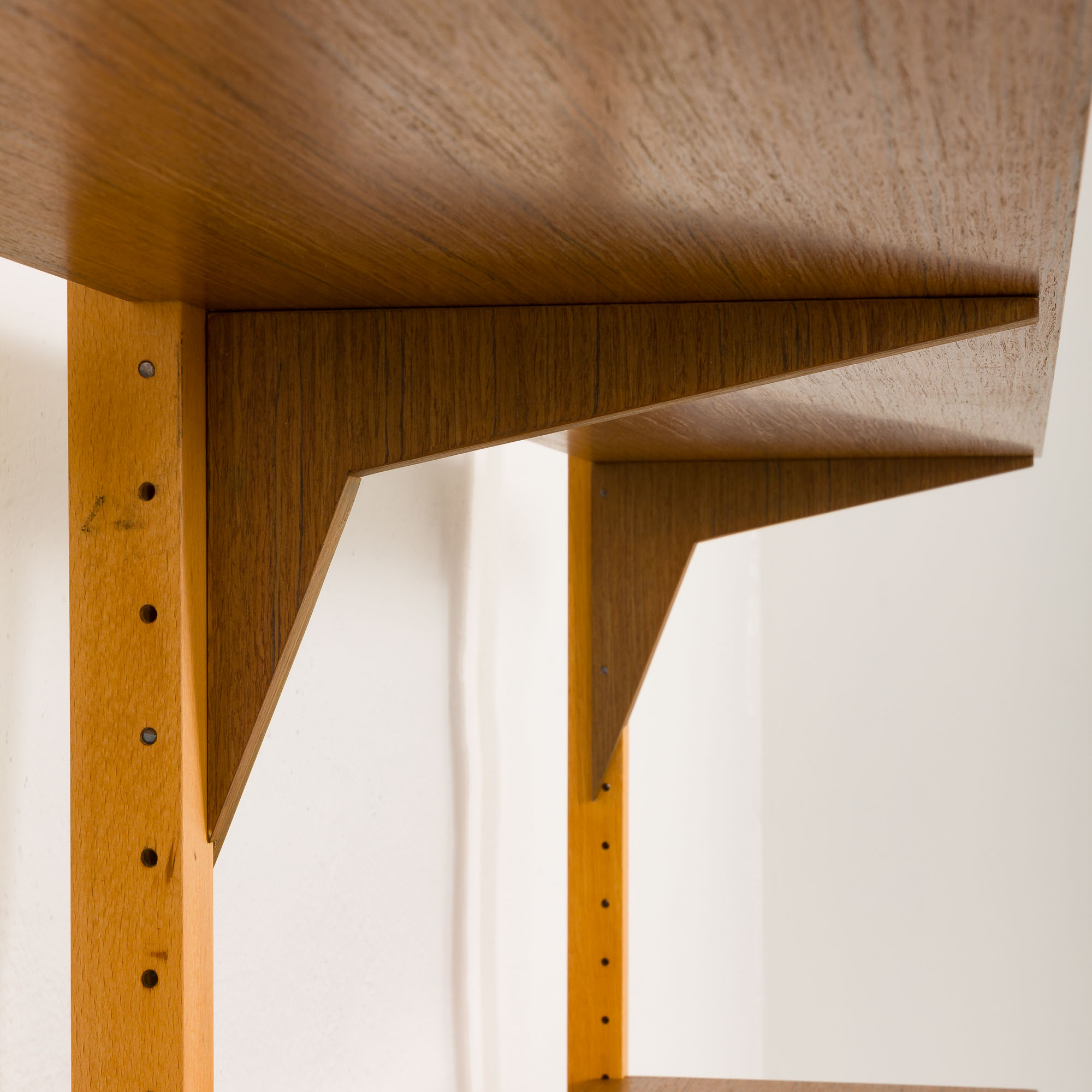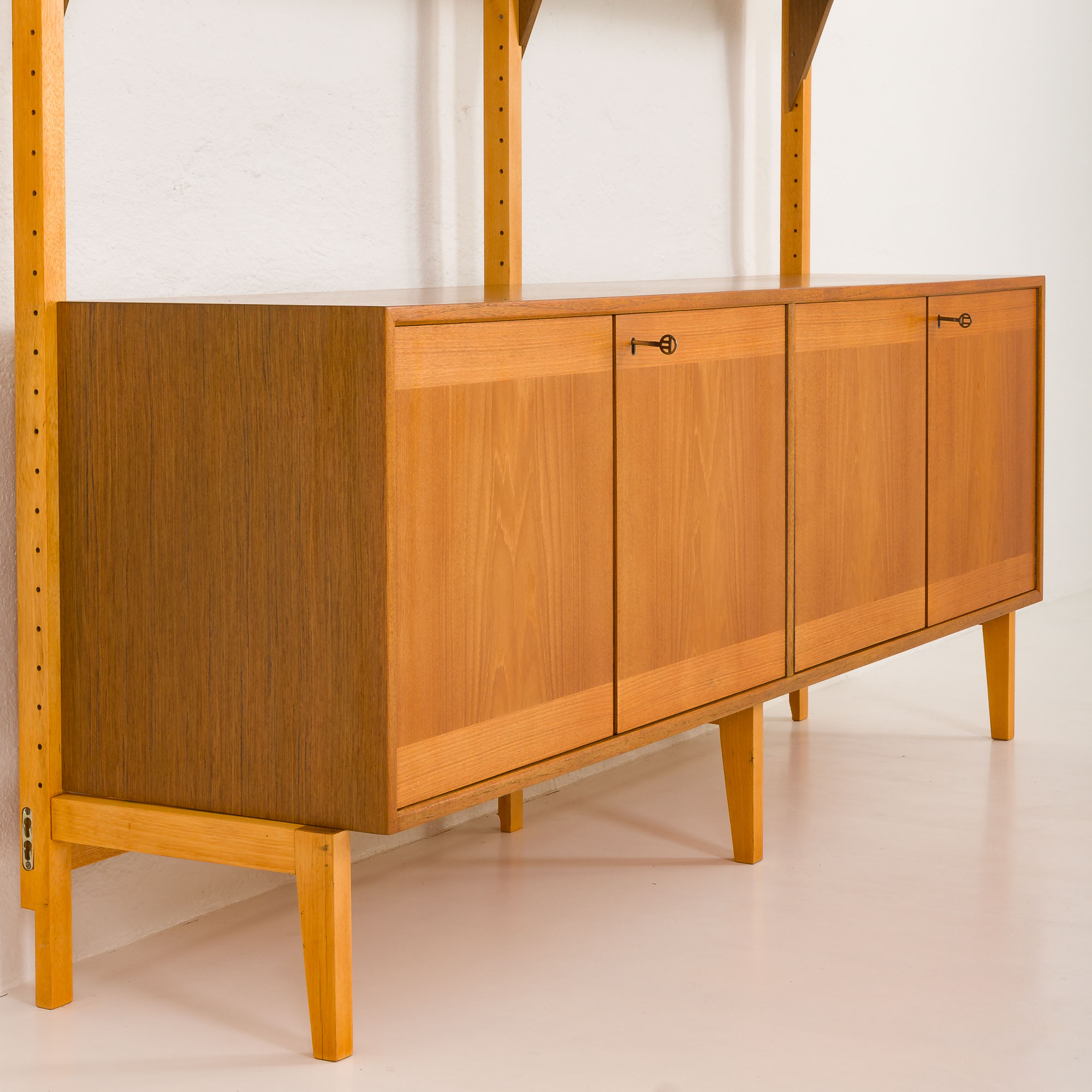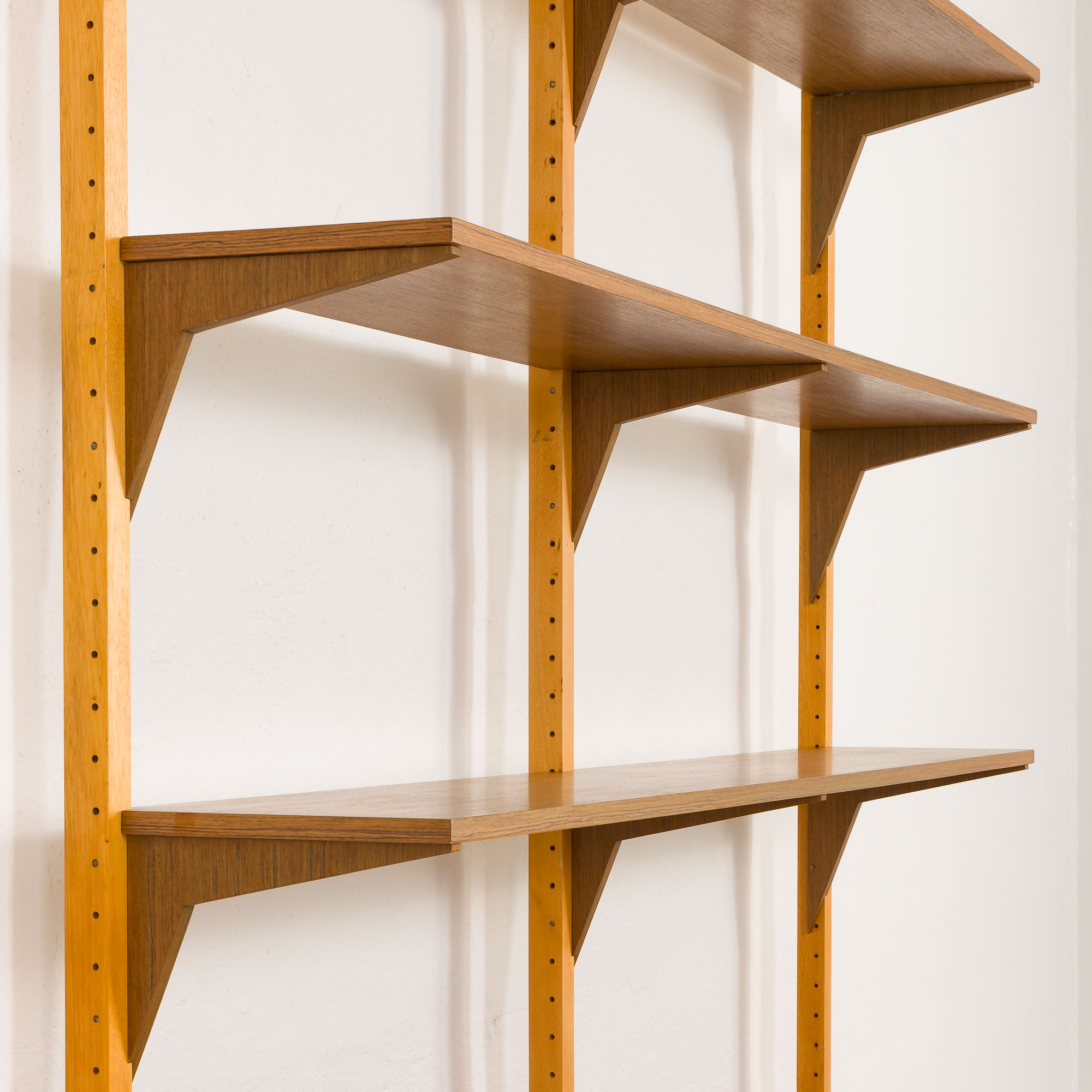 Visually appealing and extremely functional, this teak wall system was designed and produced in the 1970s in Scandinavia, most likely in Norway. Crafted from warm-hued teak wood, it showcases a beautiful wood grain pattern. The use of high-quality teak wood ensures the durability and longevity of the piece. The differently laid teak veneer on the cabinet fronts adds an interesting and more diverse look. The minimalist vertical wooden supports and three long shelves create a perfect contrast to the heavy bottom, providing visual balance. The unique shelf mounting system, hidden within the wooden structure, makes the junction points of the components completely invisible.