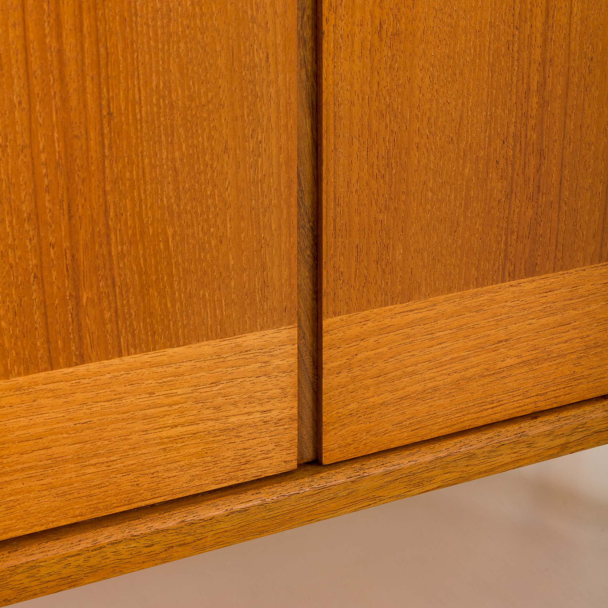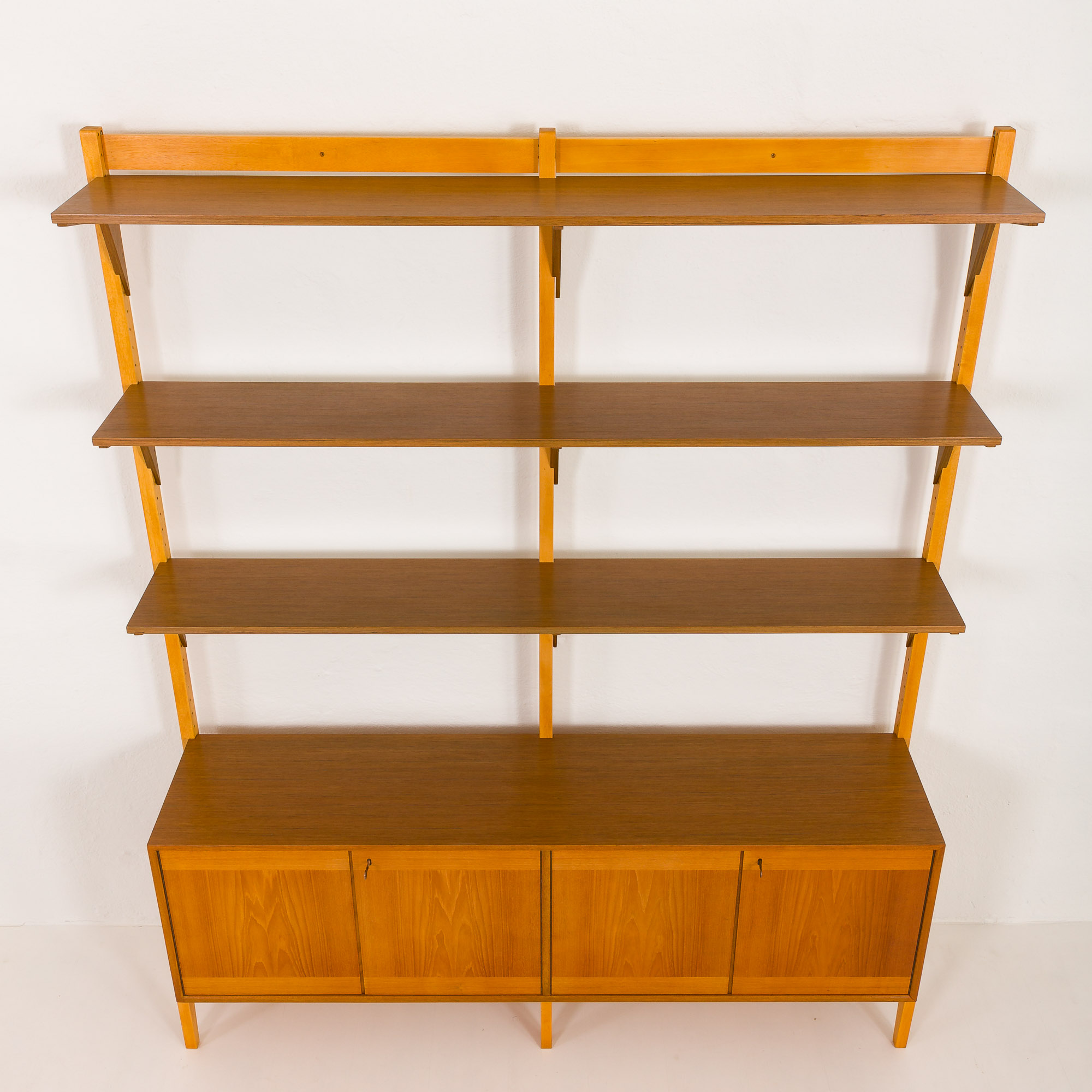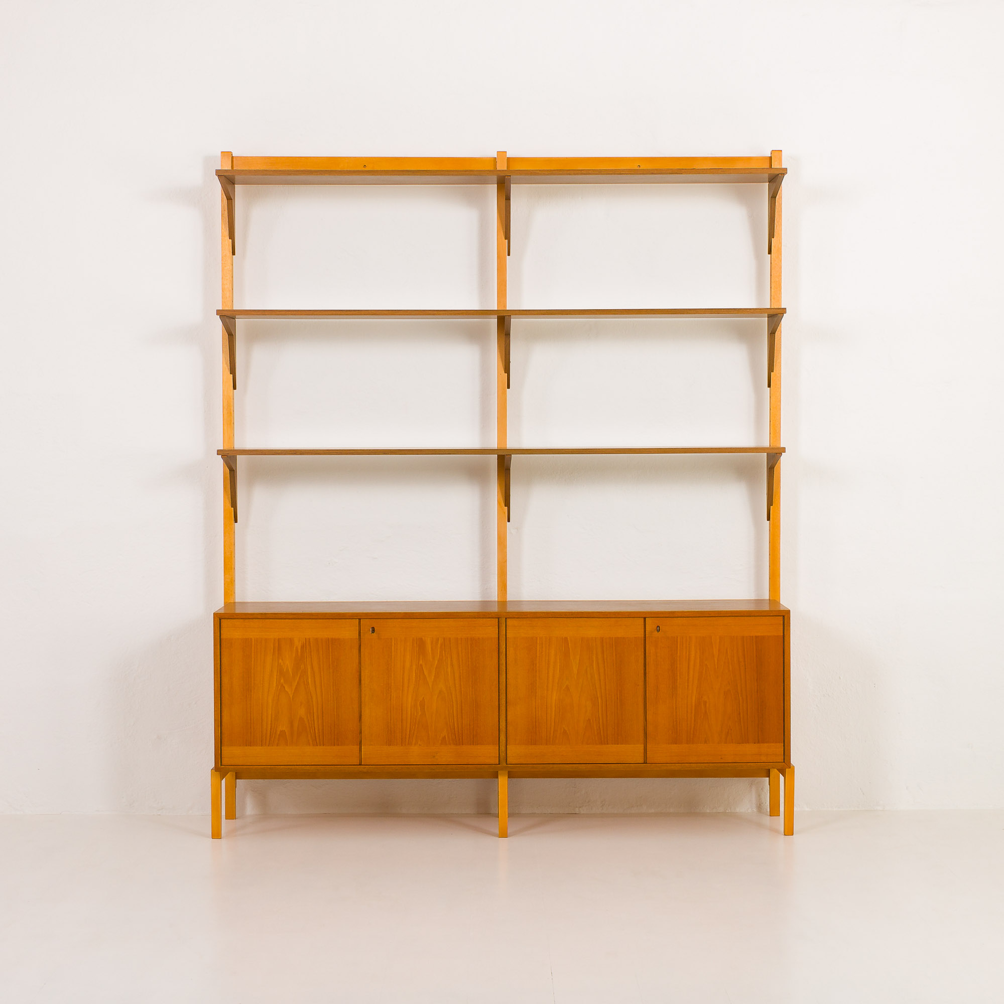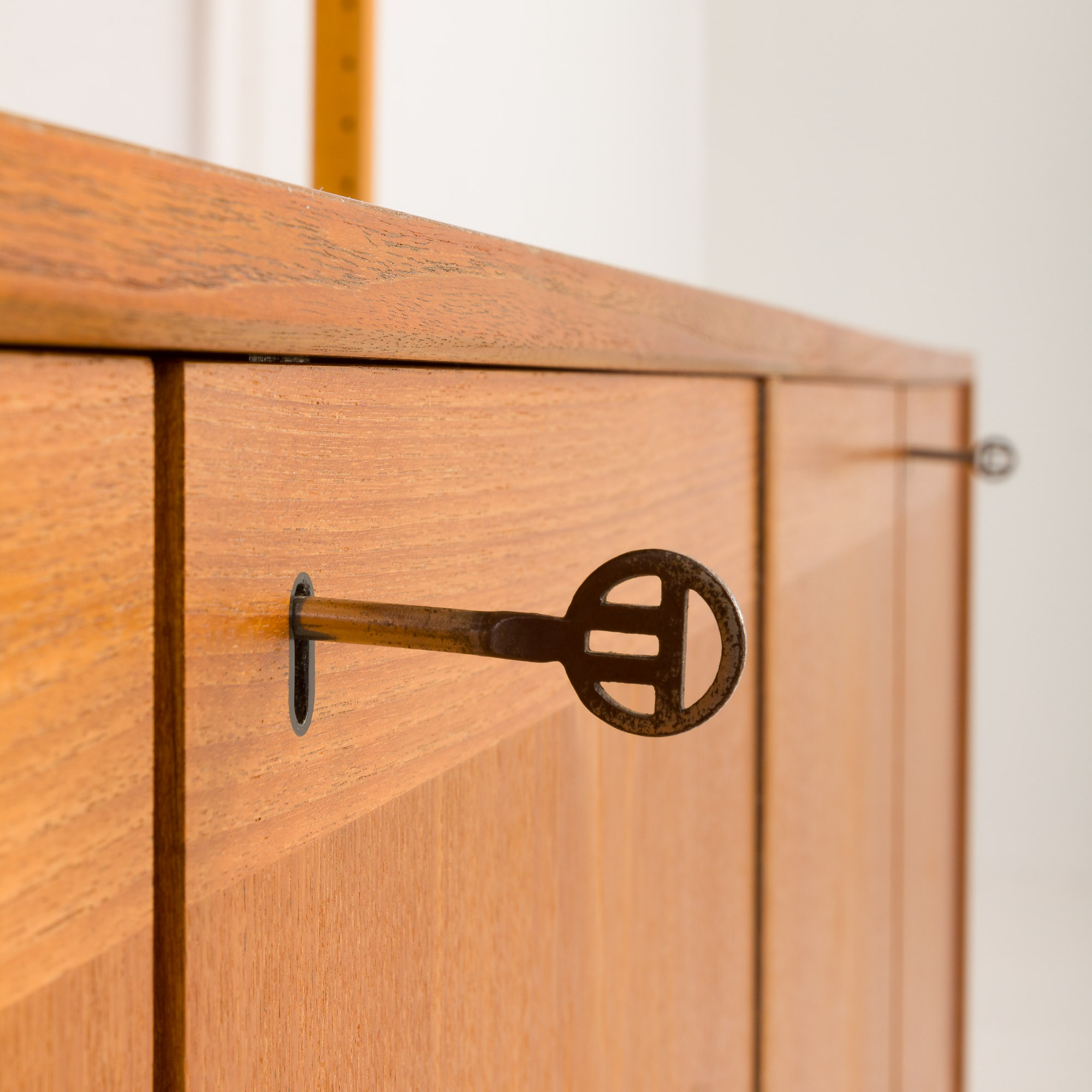 Visually appealing and extremely functional, this teak wall system was designed and produced in the 1970s in Scandinavia, most likely in Norway. Crafted from warm-hued teak wood, it showcases a beautiful wood grain pattern. The use of high-quality teak wood ensures the durability and longevity of the piece. The differently laid teak veneer on the cabinet fronts adds an interesting and more diverse look. The minimalist vertical wooden supports and three long shelves create a perfect contrast to the heavy bottom, providing visual balance. The unique shelf mounting system, hidden within the wooden structure, makes the junction points of the components completely invisible.
