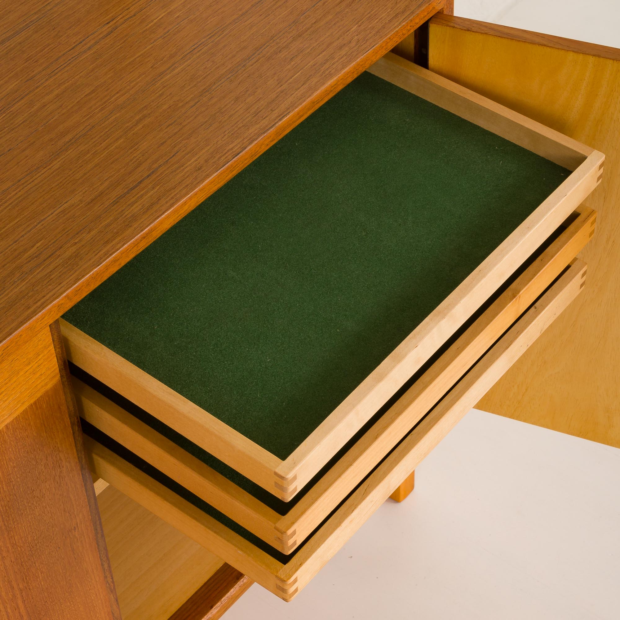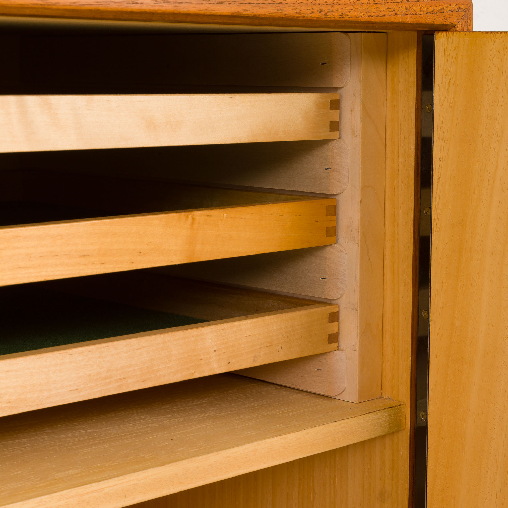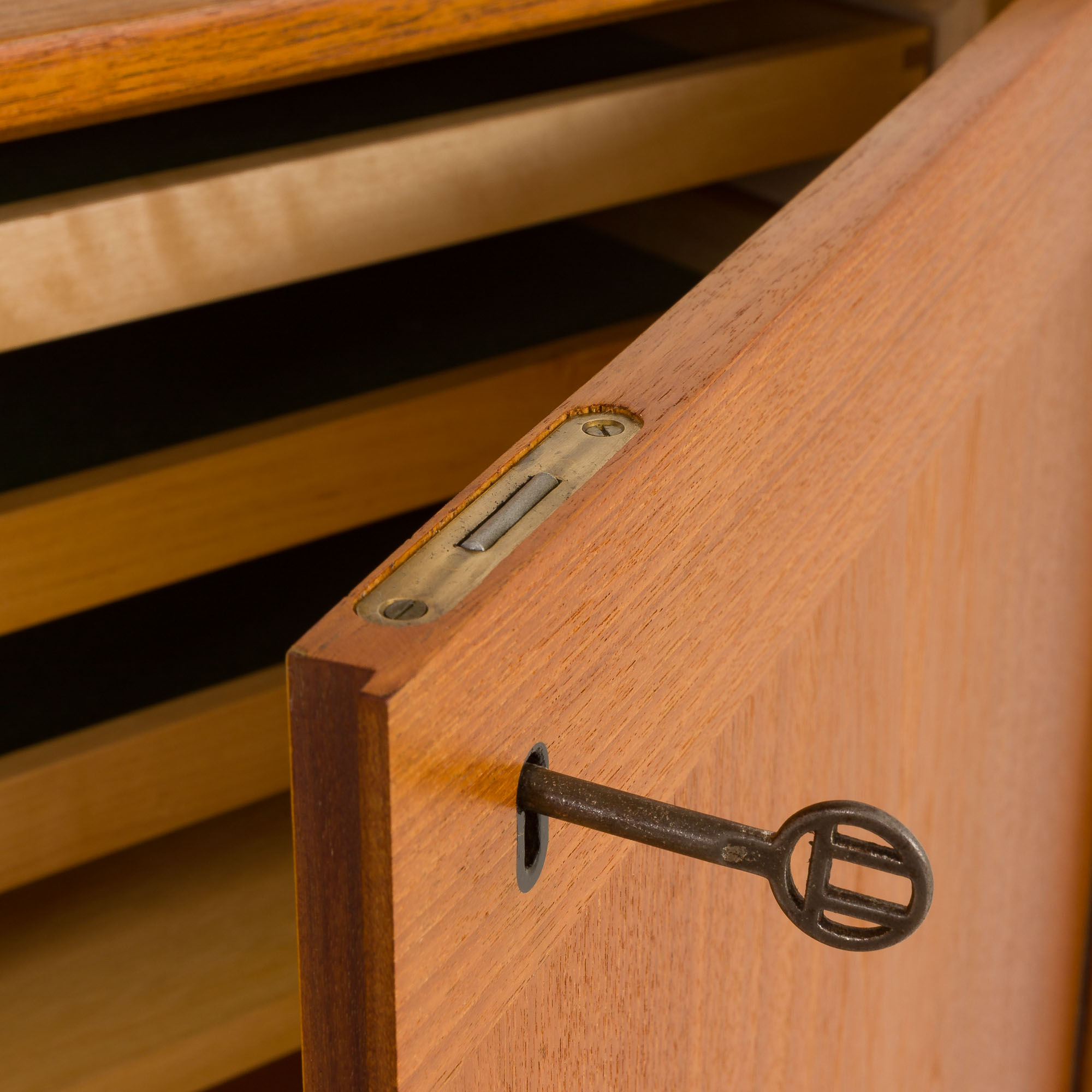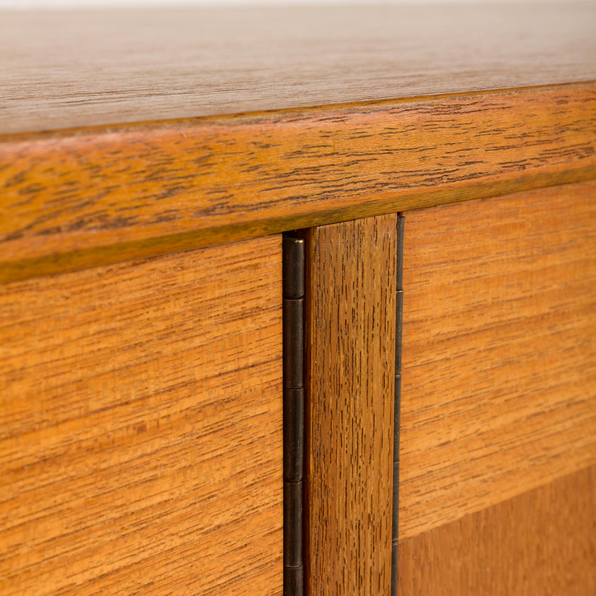The cabinet remains in excellent original condition with minimal signs of use consistent with its age. The original shelves were damaged, so we replaced them with new ones crafted by our professional carpenters. After this renovation, the wall unit regained full functionality while maintaining a consistent look. All components fit together seamlessly, and the wood has been cleaned and protected with professional compounds to enhance the natural beauty of the wood grain.