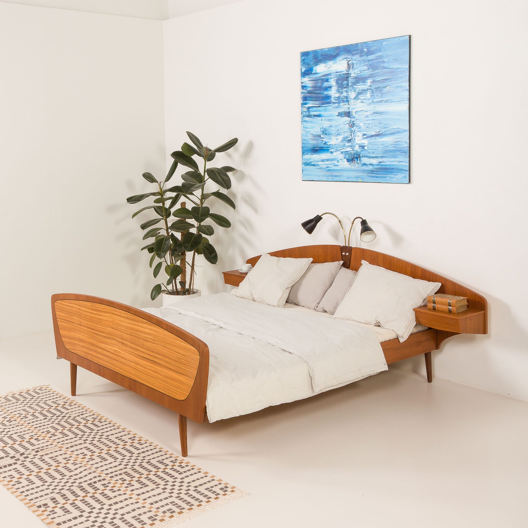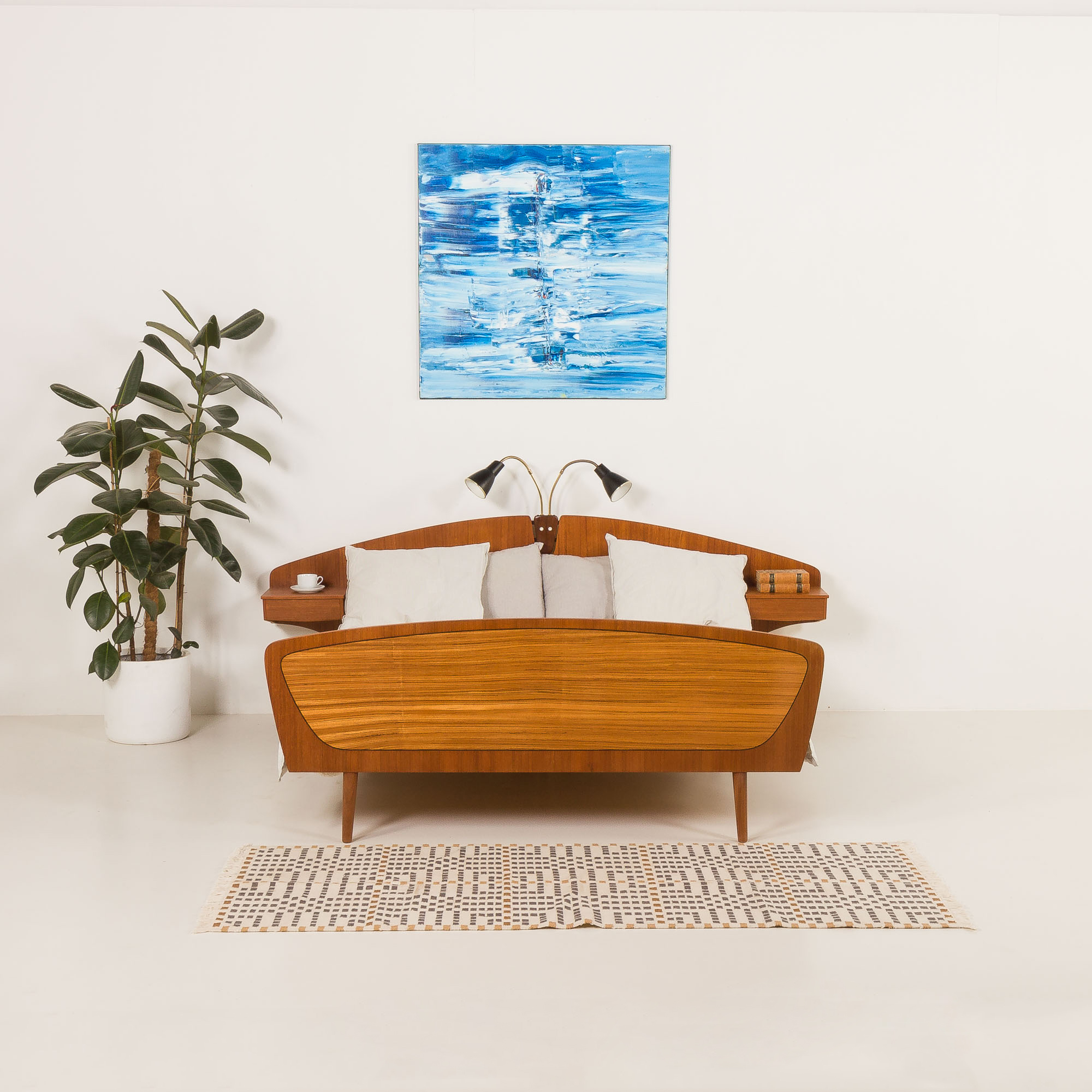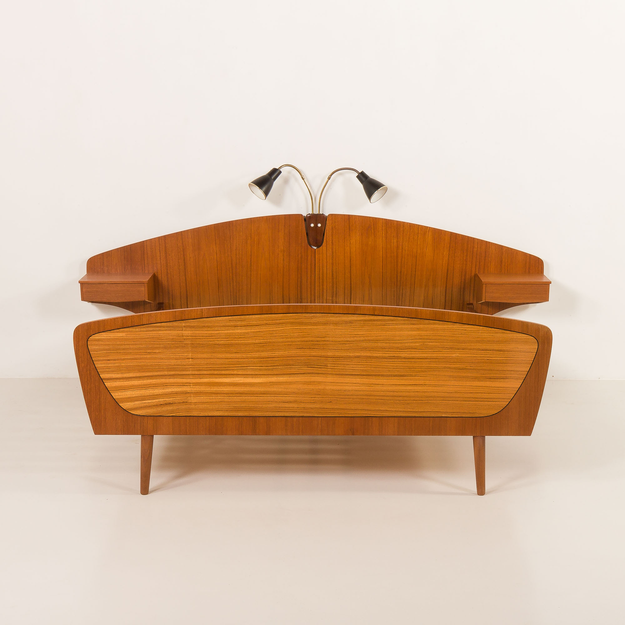 The bed has rounded silhouette with a teak veneered frame showcasing the warm tones and rich grain. Integrated floating bedside tables, each equipped with a single drawer, offer convenient storage without compromising the bed’s clean lines. A distinctive feature of this bed is the round teak headboard and footboard, emphasizing the natural beauty of the wood while ensuring durability, and functional original night lamp with two separate all-direction- adjustable shades. Perfect for reading.
