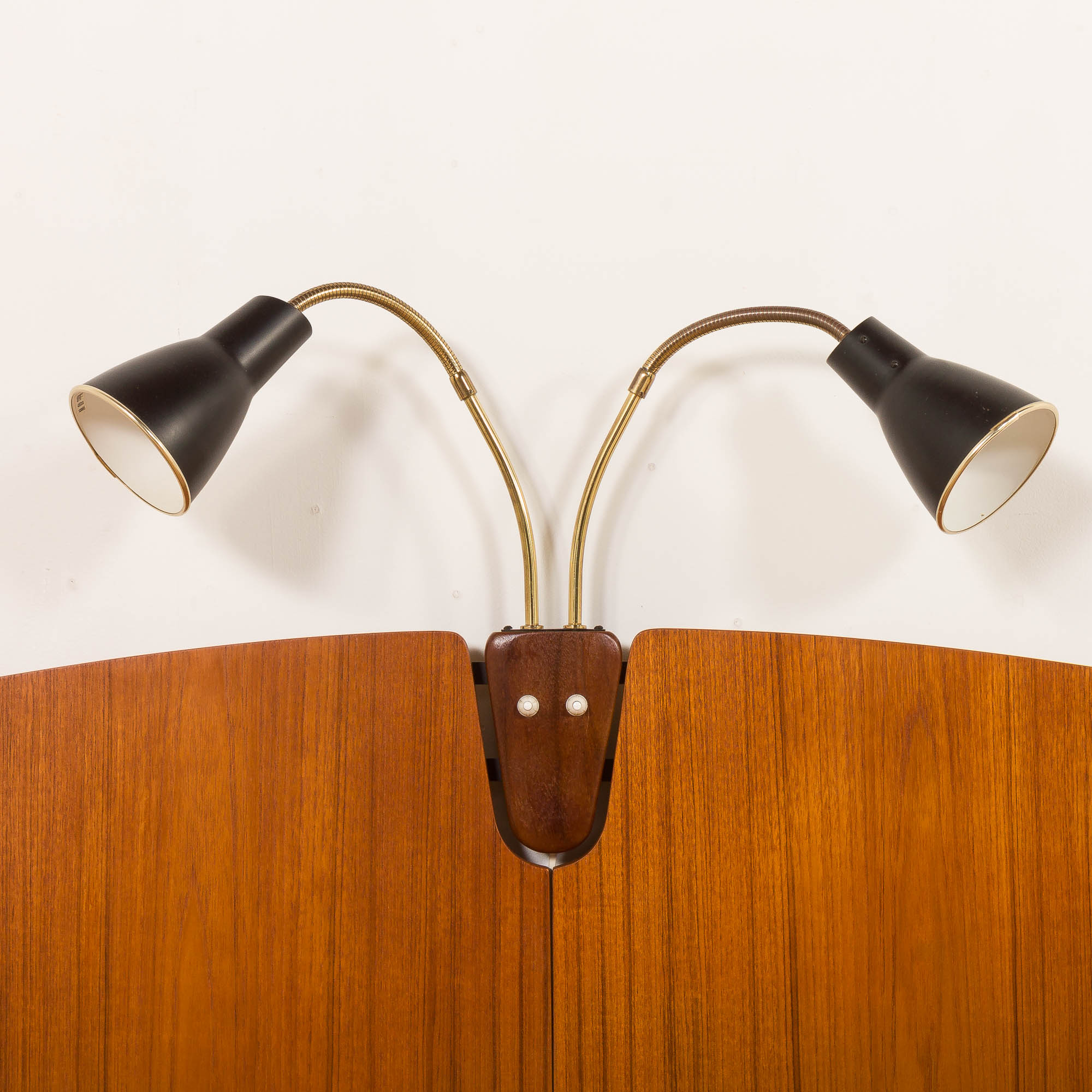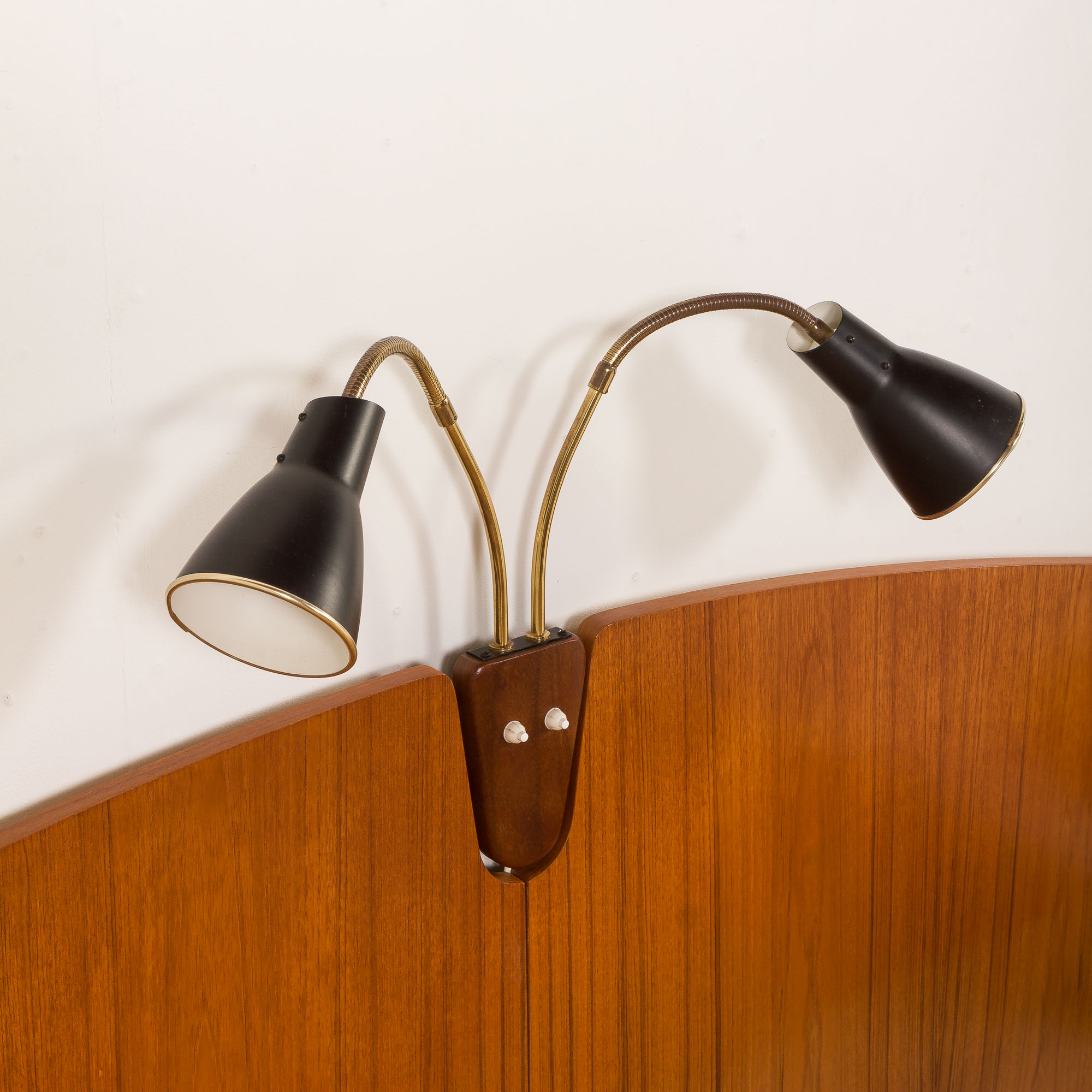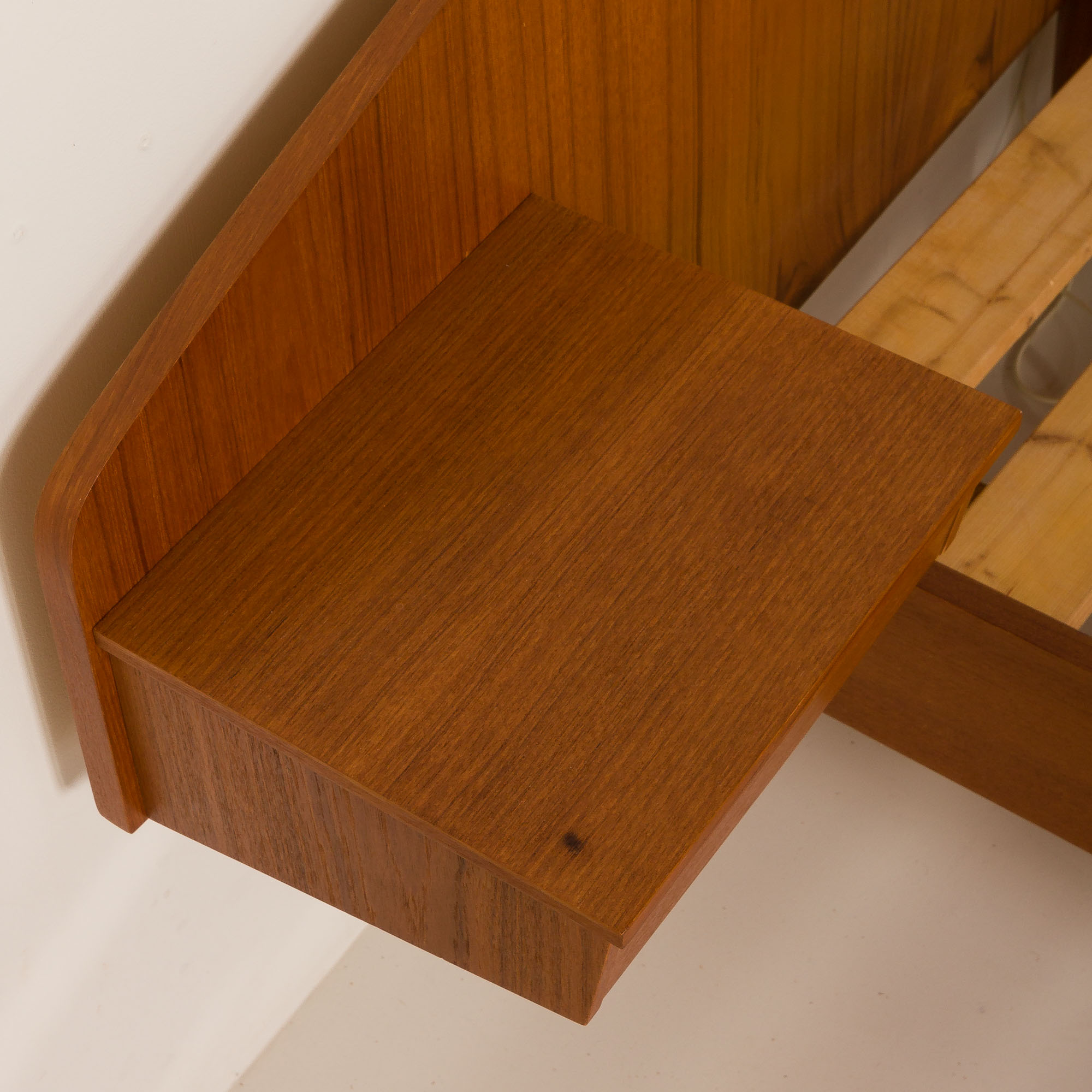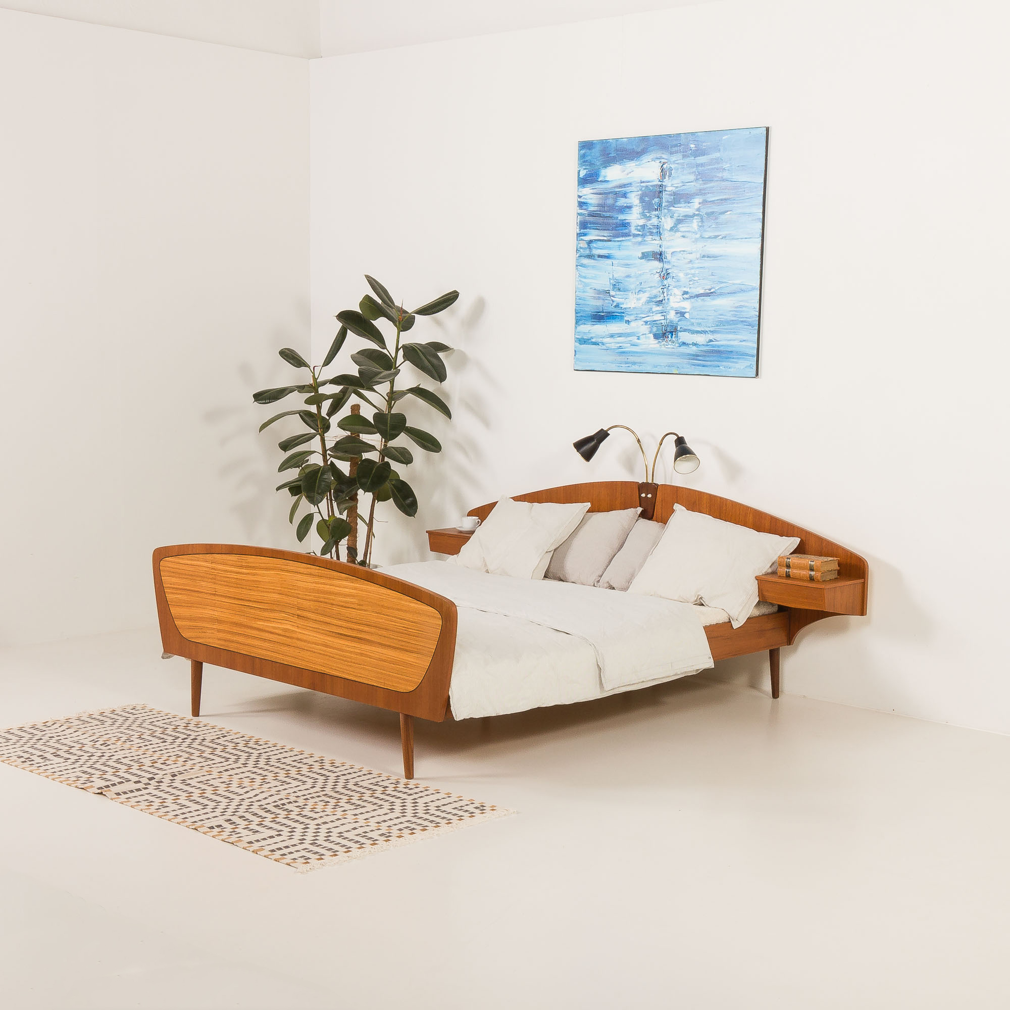 The bed has rounded silhouette with a teak veneered frame showcasing the warm tones and rich grain. Integrated floating bedside tables, each equipped with a single drawer, offer convenient storage without compromising the bed’s clean lines. A distinctive feature of this bed is the round teak headboard and footboard, emphasizing the natural beauty of the wood while ensuring durability, and functional original night lamp with two separate all-direction- adjustable shades. Perfect for reading.