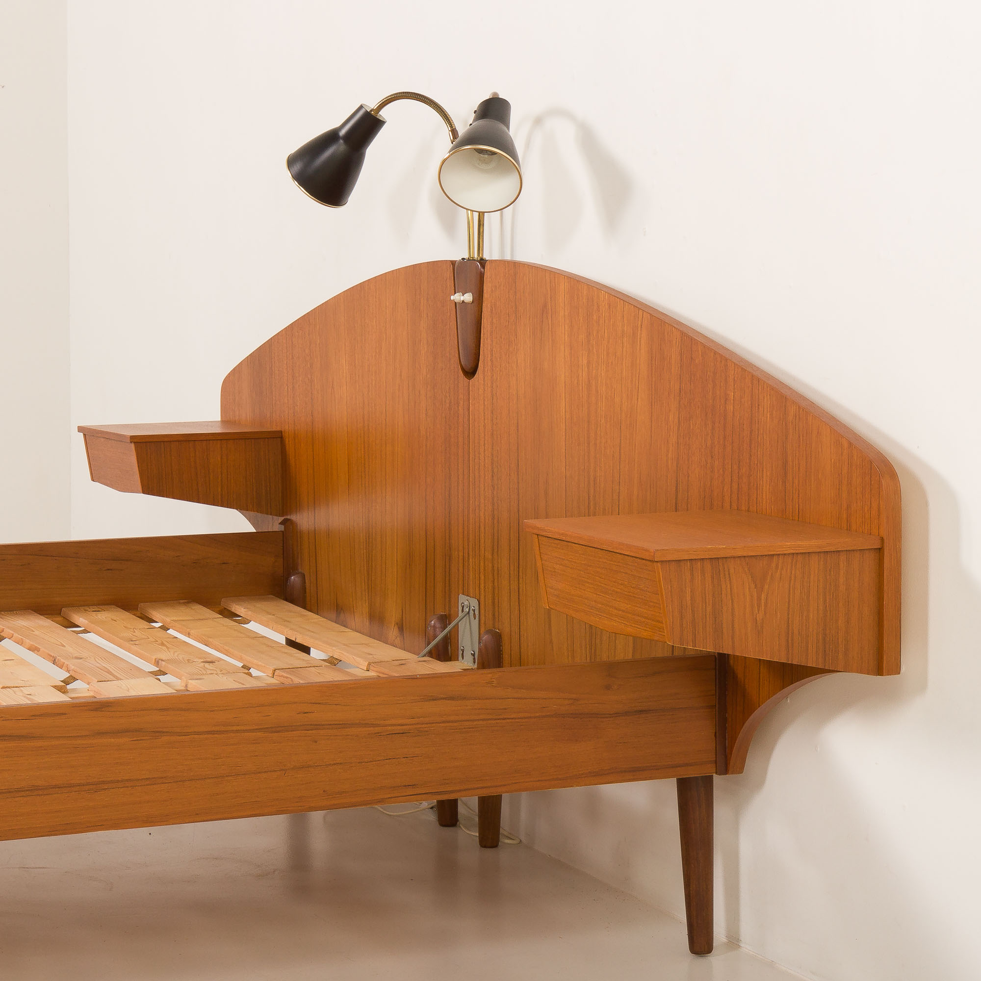 This very rare and elegant Scandinavian mid century queen size bed features organic lines two nightstands and a central two arms lamp. It was made in Norway some time in the 1950s.