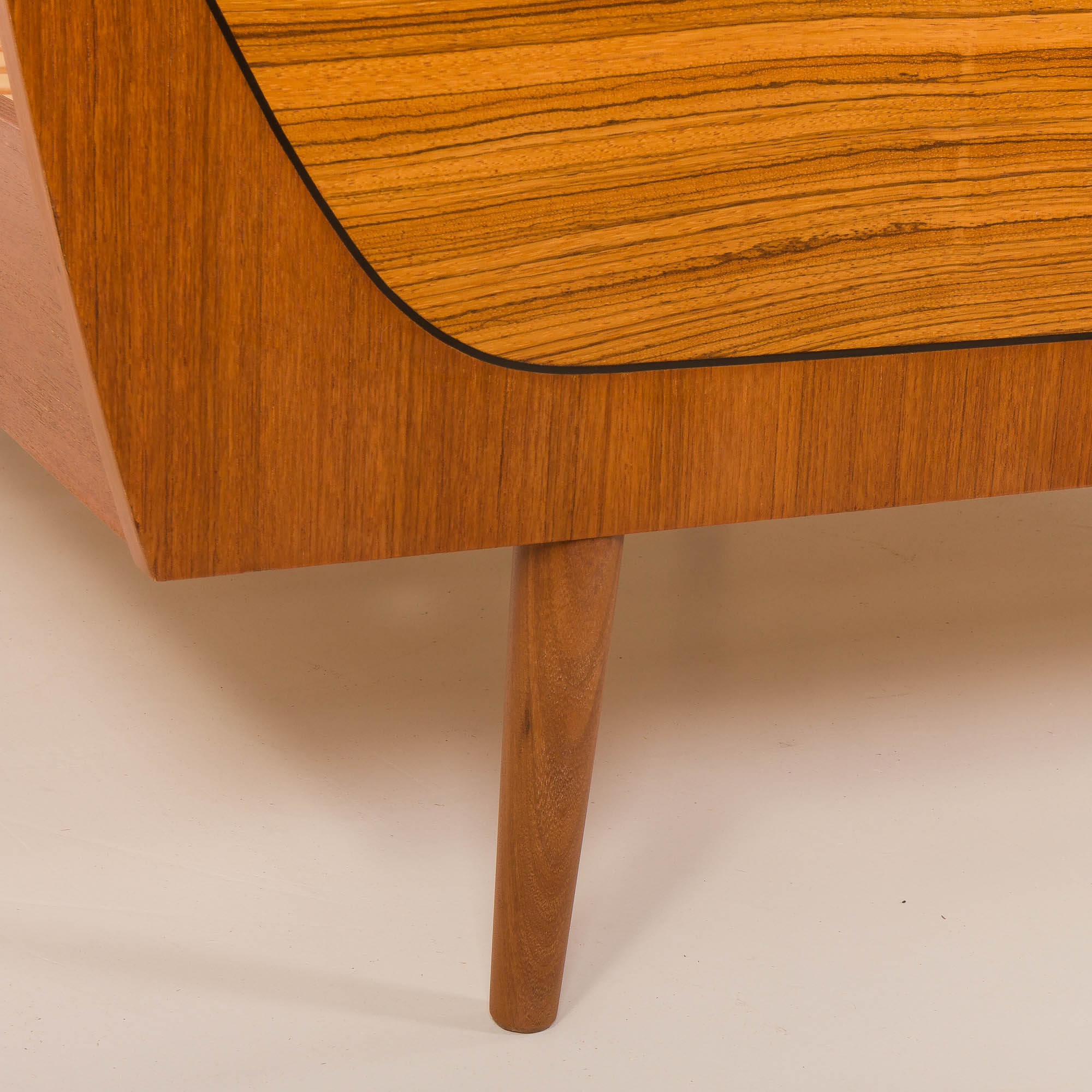 The wood was sanded and treated with professional compounds to reinforce it and enhance its natural beauty, and covered with few layers of Danish oil to preserve it.. We changed a lamp cables. Frame is in excellent condition and will serve for many years to come. One bedside table has a small burn mark on the countertop, it does not compromise the estethics of the piece, just confirms its vintage provinance. Exceptional choice for any stylish and design-focused interior.