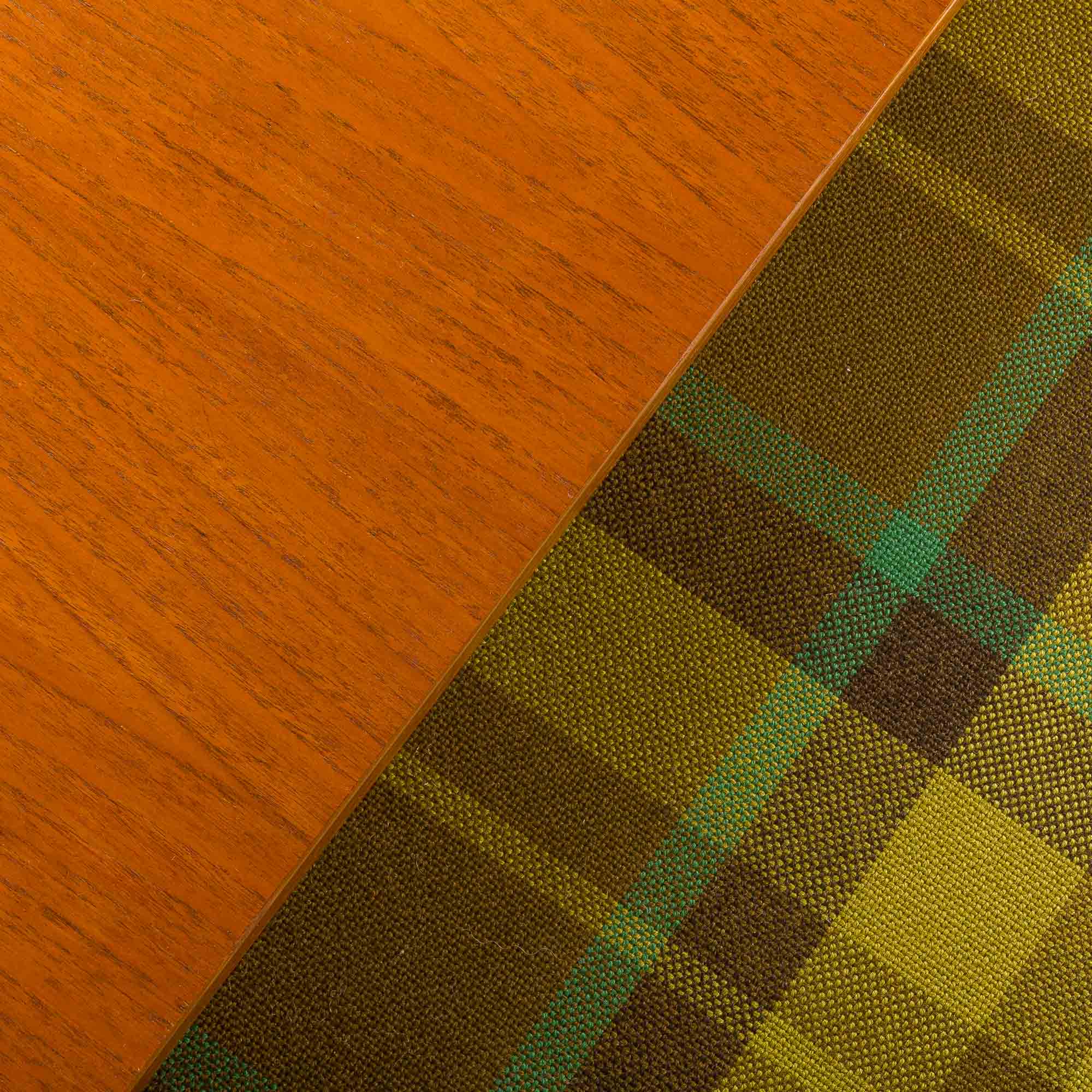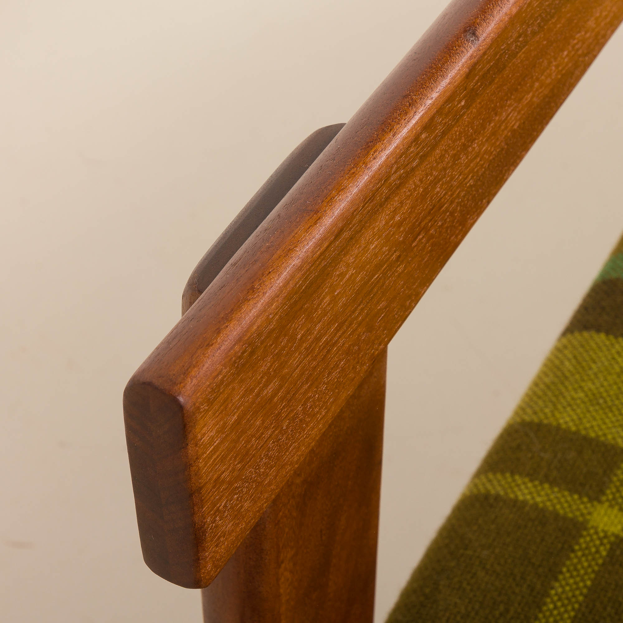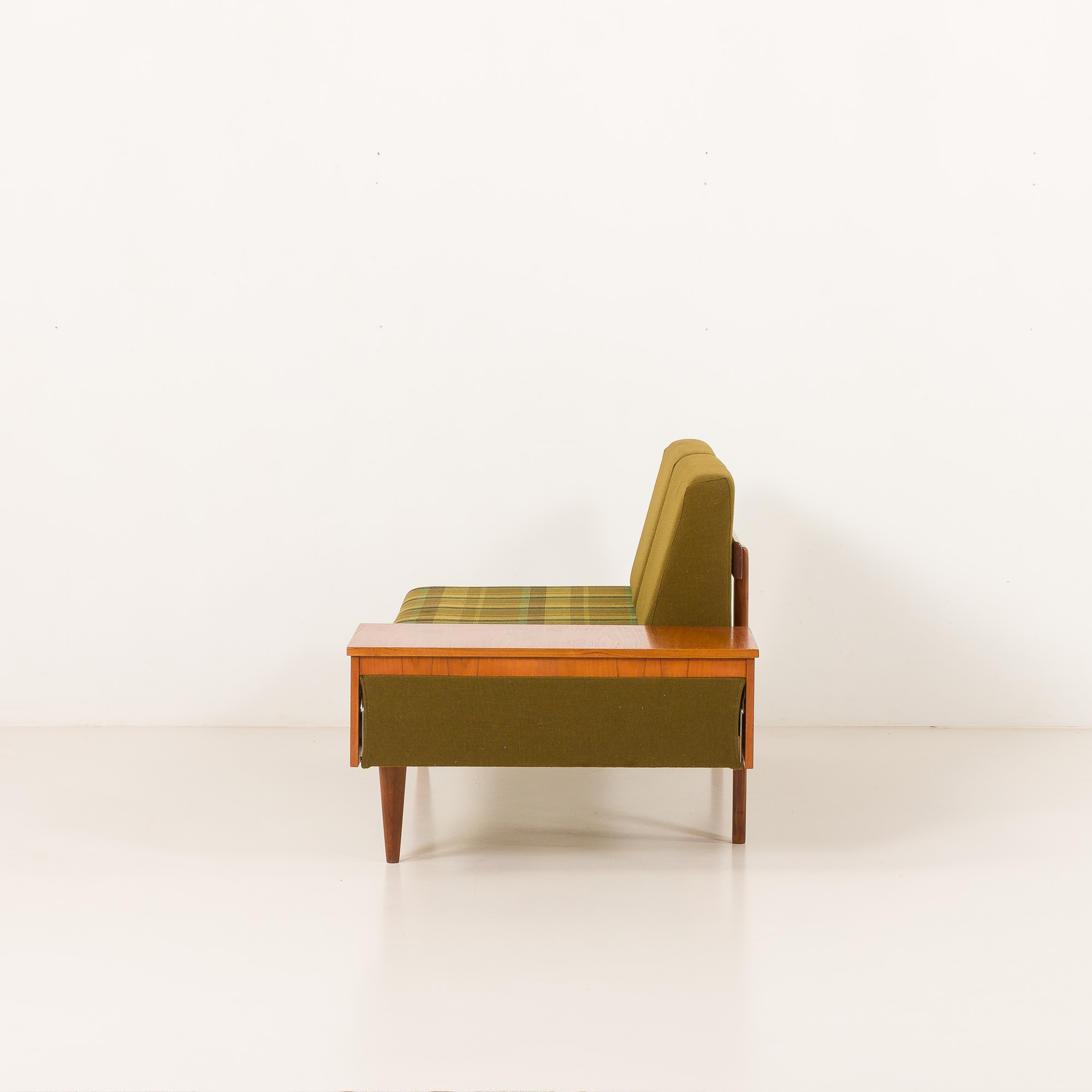 A solid teak frame combined with original, well-preserved, checkered wool upholstery in bottle-green color with lime accents gives a mid-century look. Perfect for any living room, office space, or vintage-style lounge.