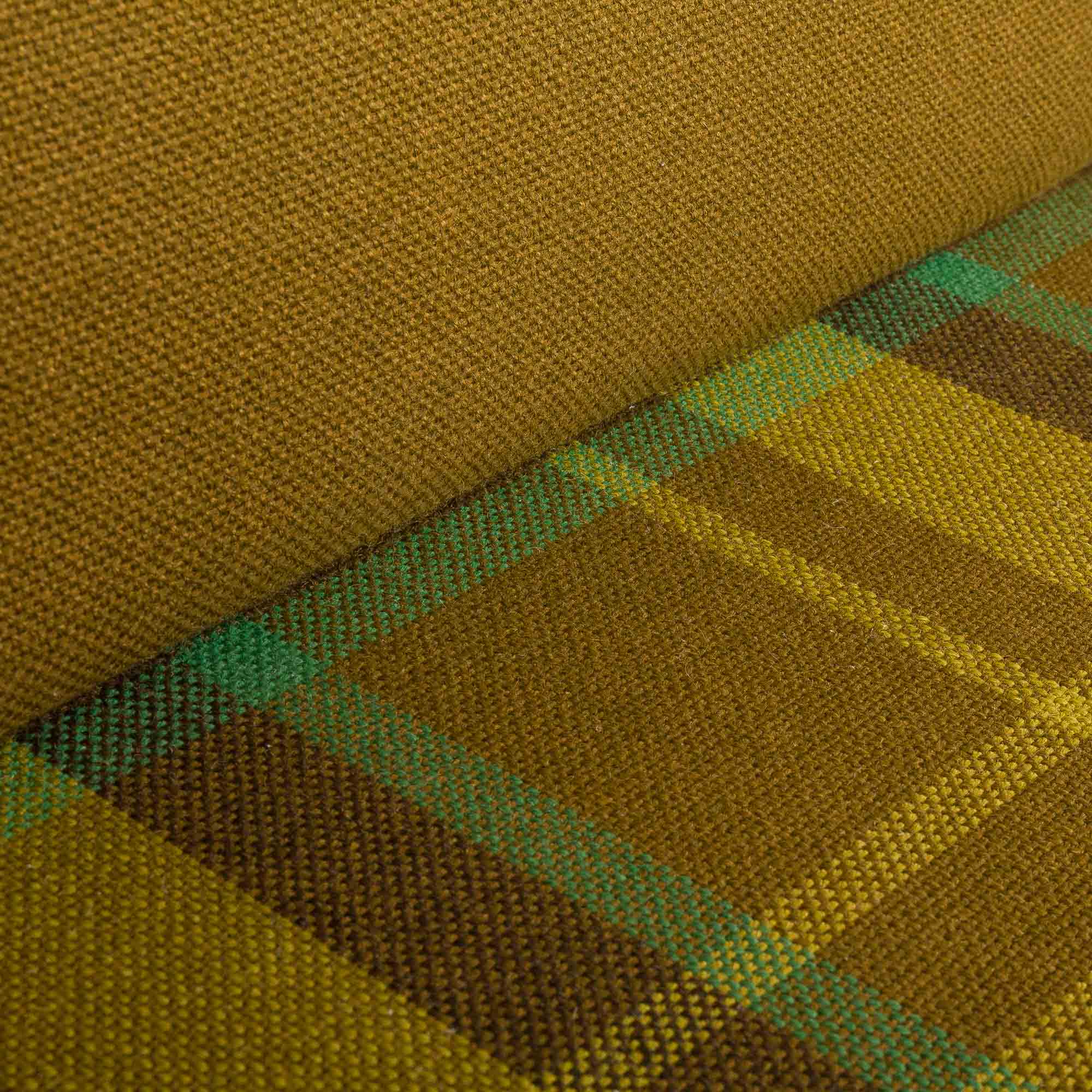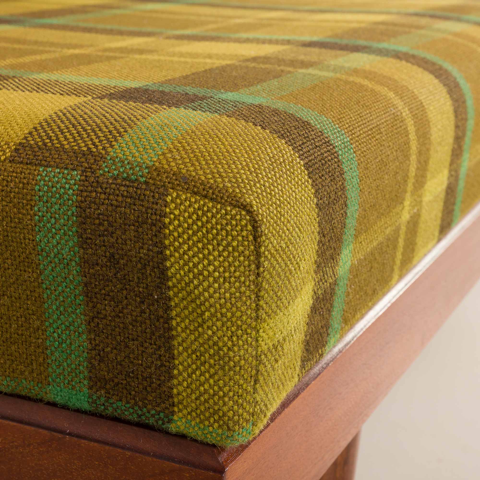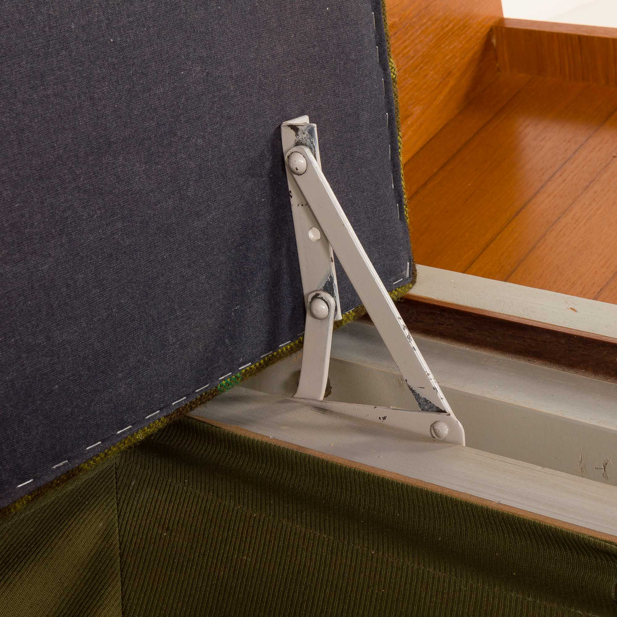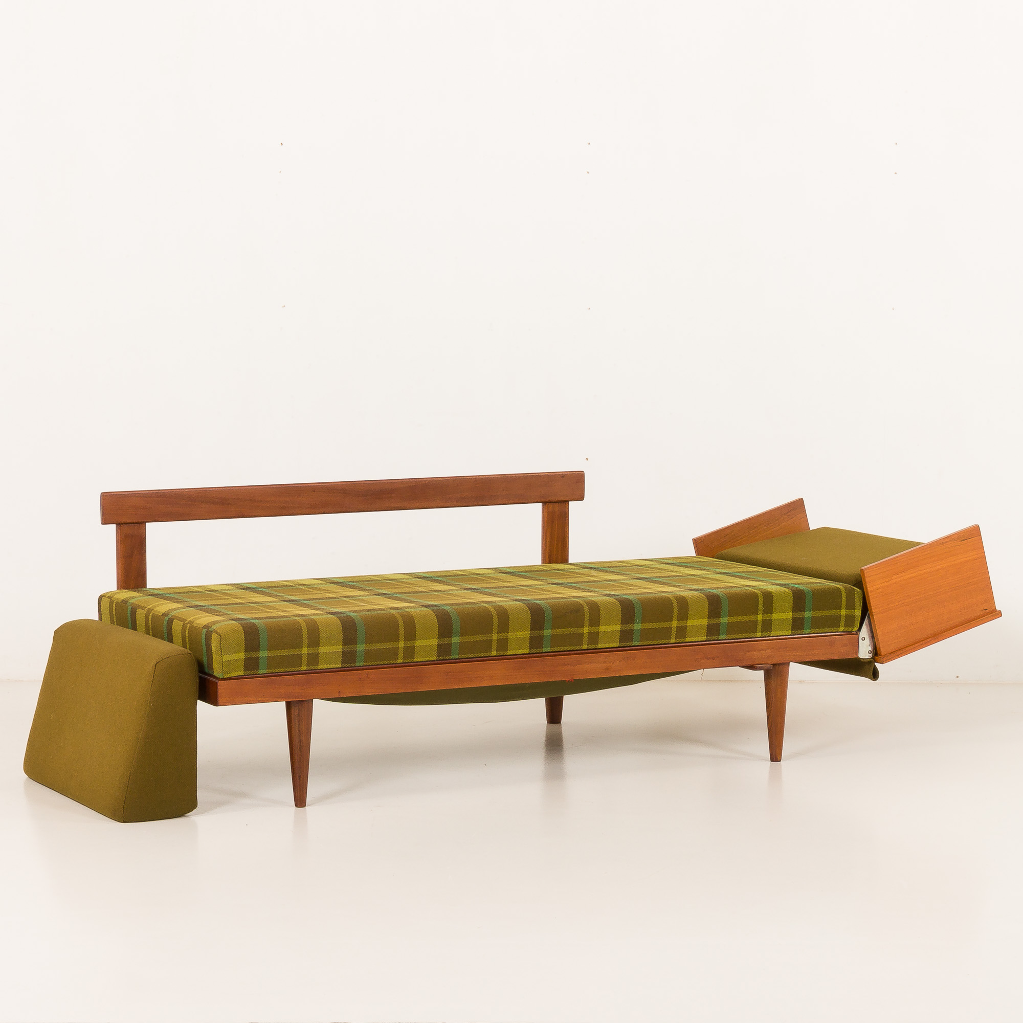 A solid teak frame combined with original, well-preserved, checkered wool upholstery in bottle-green color with lime accents gives a mid-century look. Perfect for any living room, office space, or vintage-style lounge.