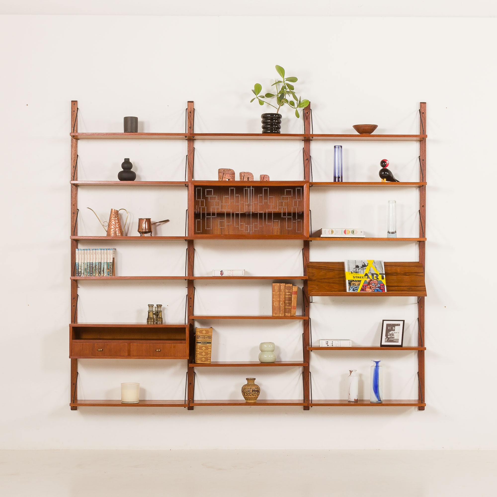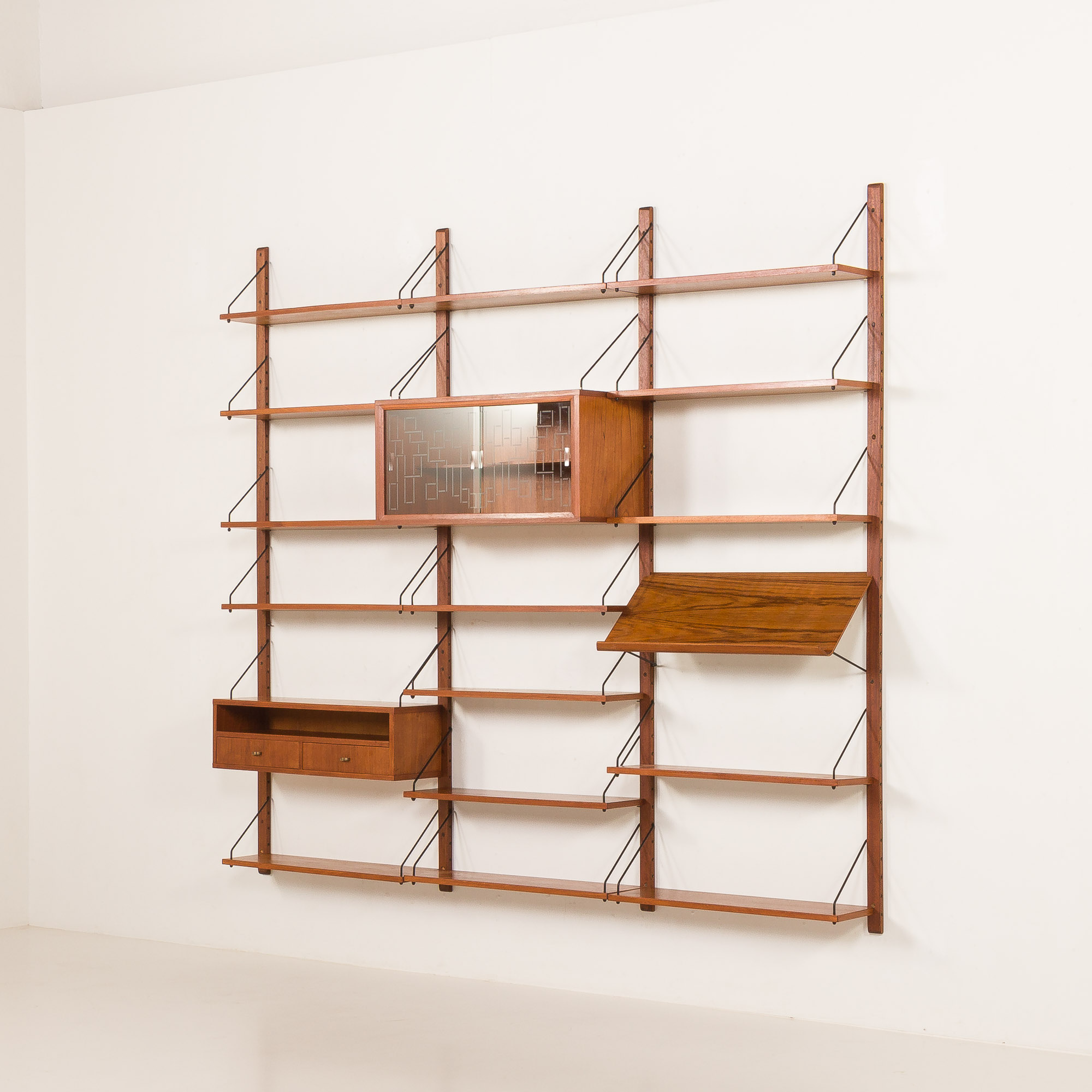 It is an entirely modular shelving system that can be arranged as needed. All components are 75cm wide and can be adjusted in height by using an easy system of slots in the rail.