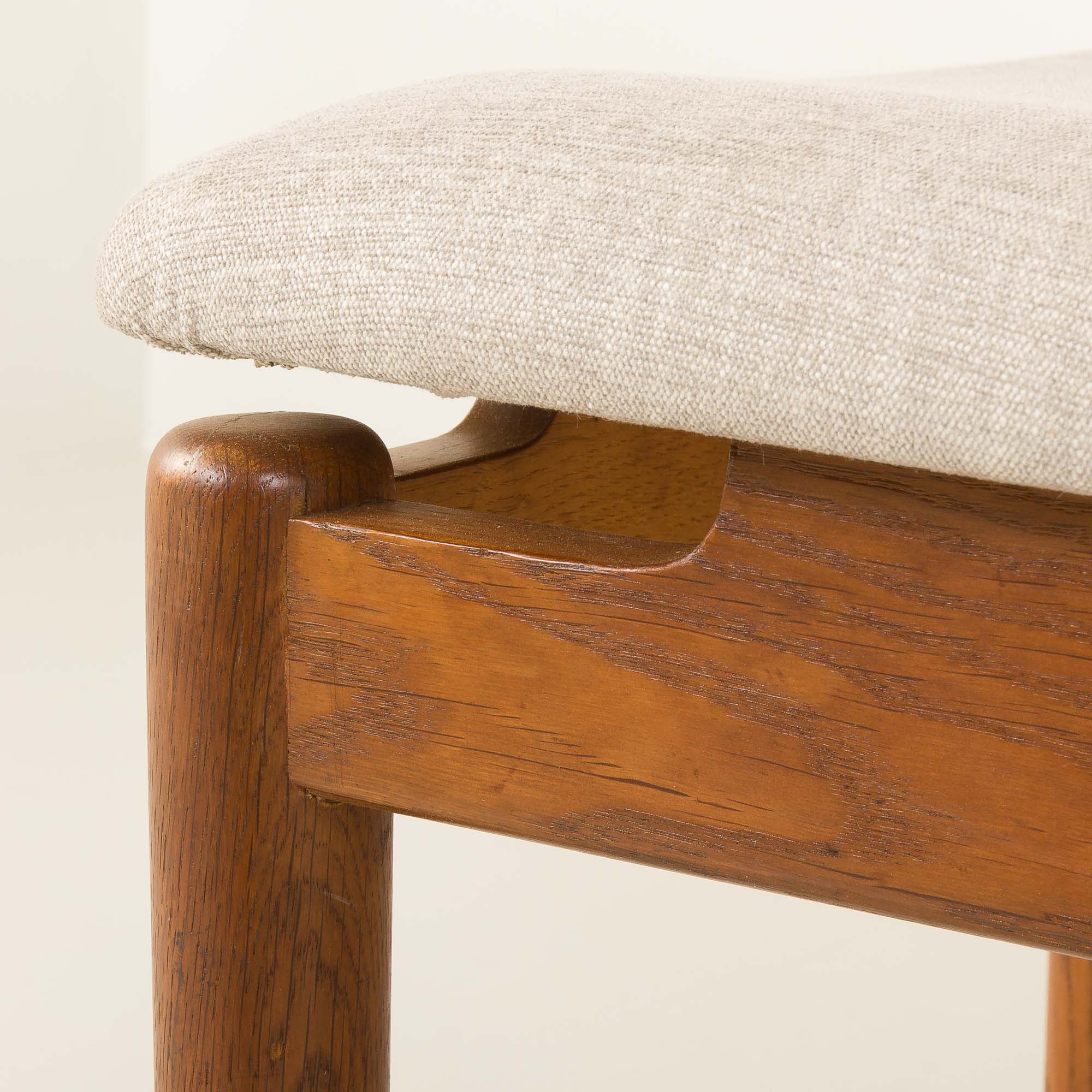 The shape of the backrests speaks for itself: ergonomically bent with an oval shape – offers excellent support and rest for your back. The chairs have been reupholstered in grey natural cotton fabric with a subtle pattern, which beautifully complements the oak frame.