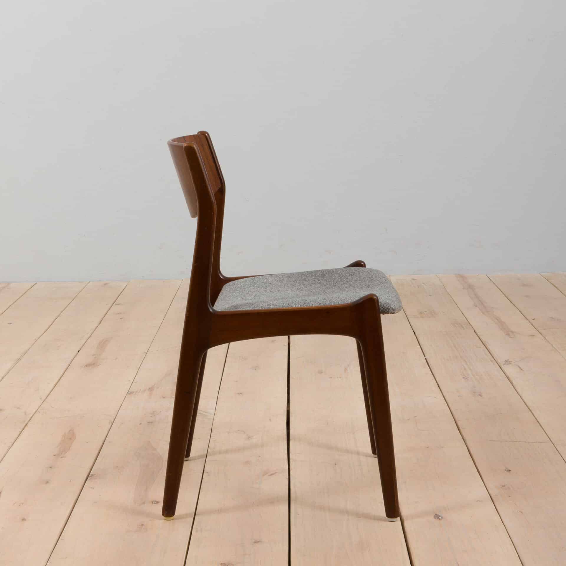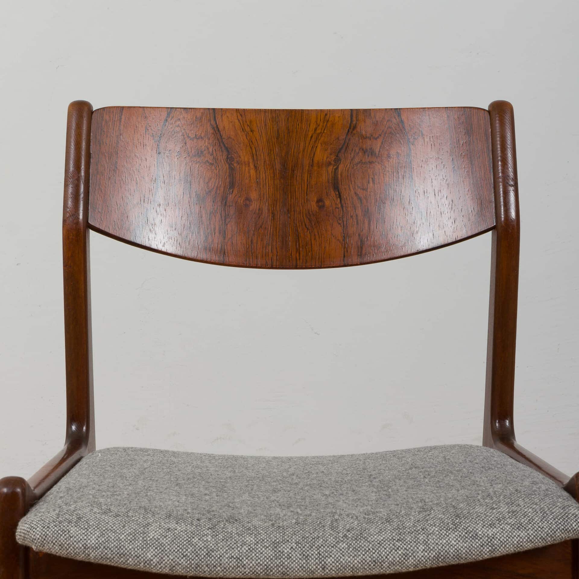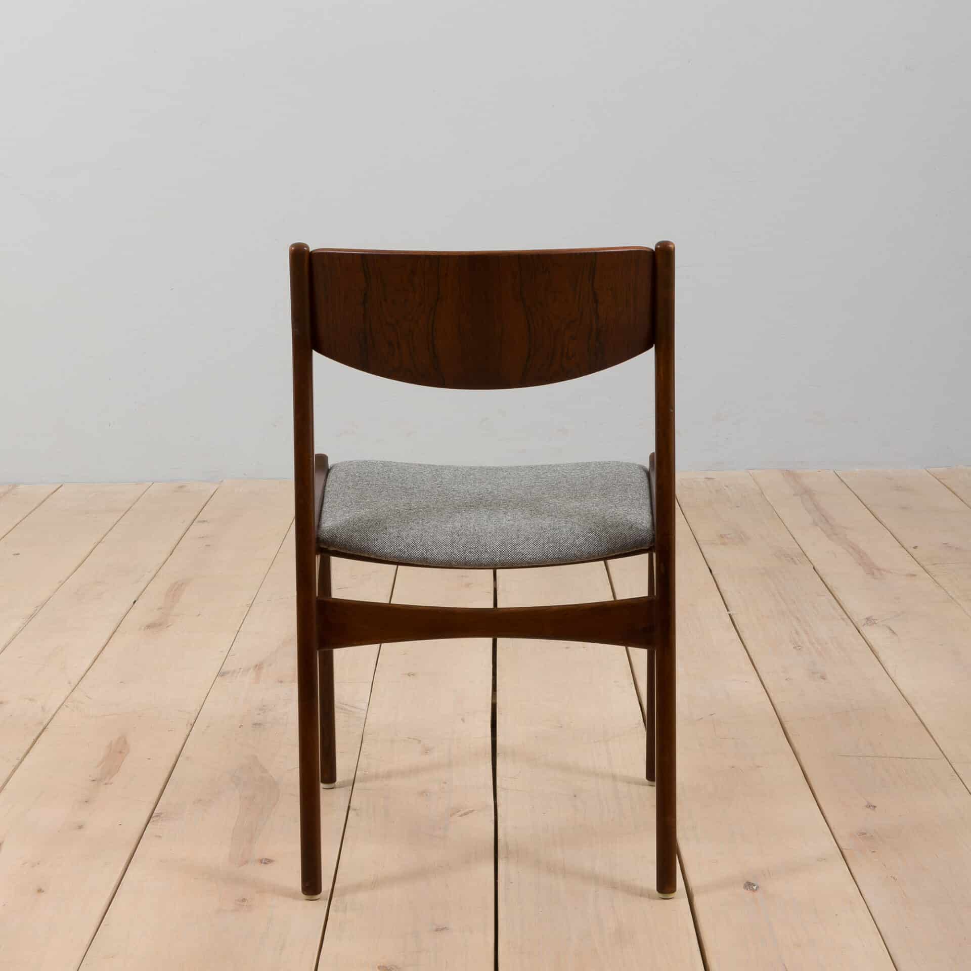 Stuning set of four dining chairs designed by Vilhelm Jorgensen for Farsø Stolefabrik. Manufactures in the north of Denmark in the 1960s. They feature beautiful and comfortable backrests crafted in Brazilian rosewood and new gray natural wool upholstery. Great example of Scandinavian design and carpentry of the mid-century period. Beautiful finishes with light, organic lines, dark rich grain of wood, and light grey seats will enhance any dining area. Very good vintage condition with minor traces of use on the wood.