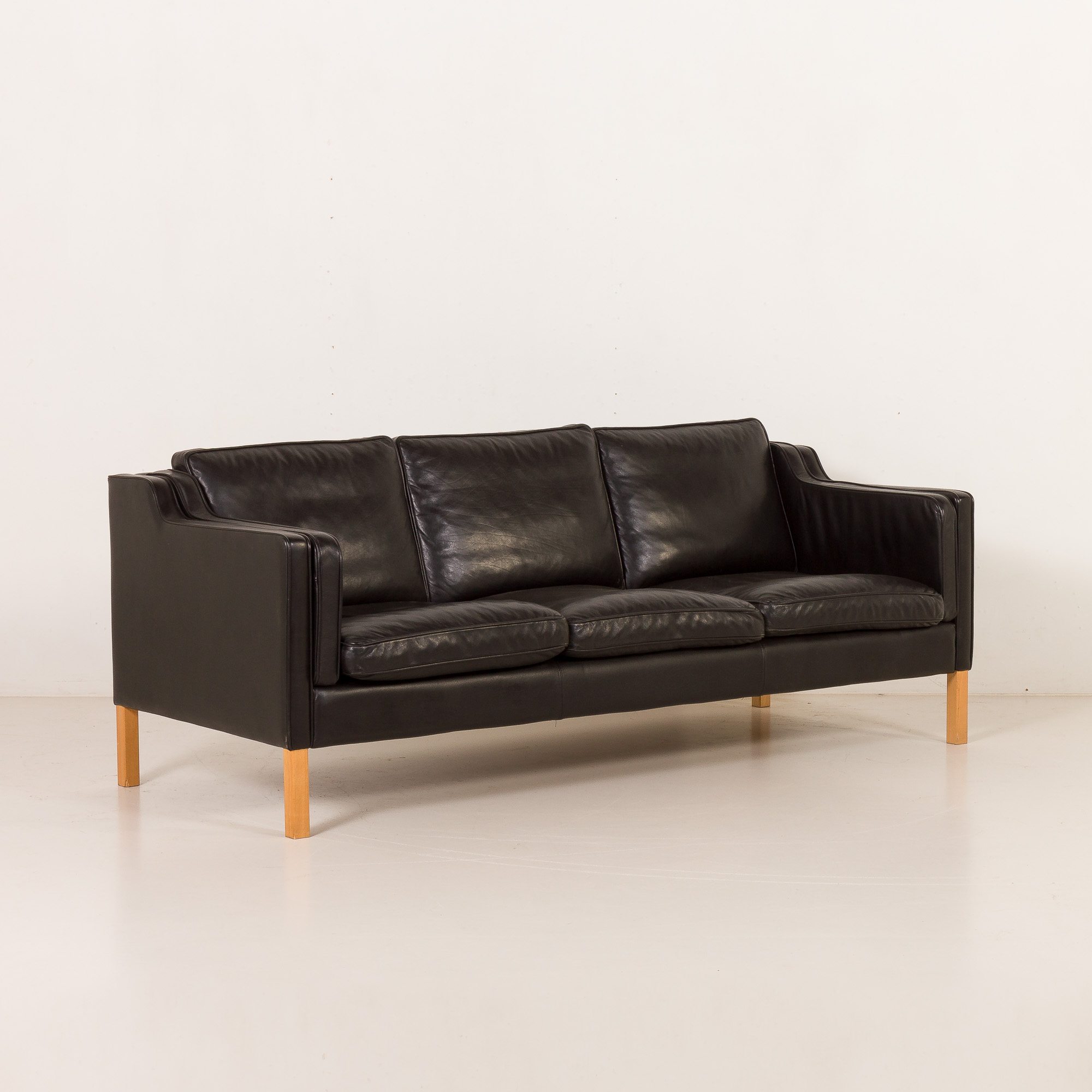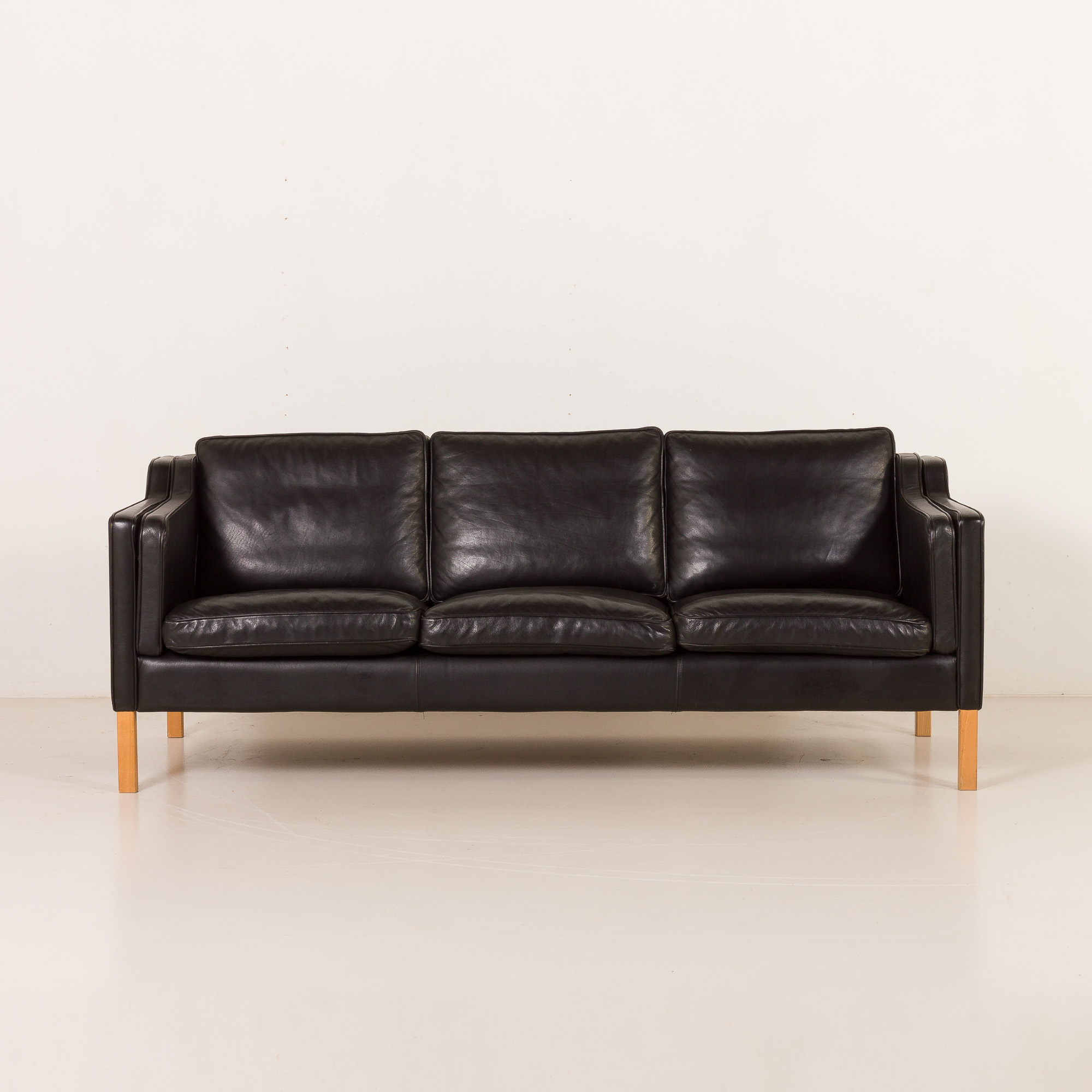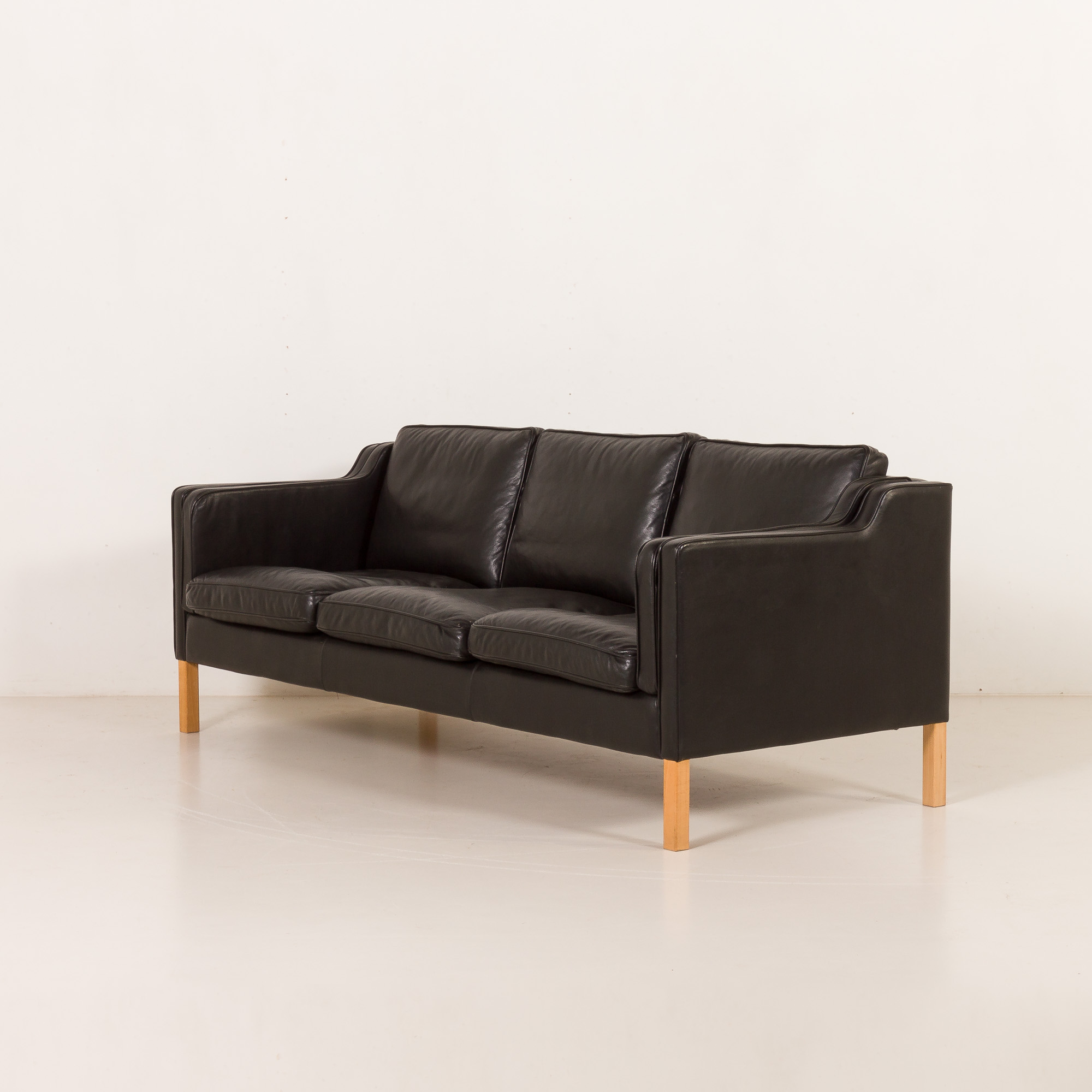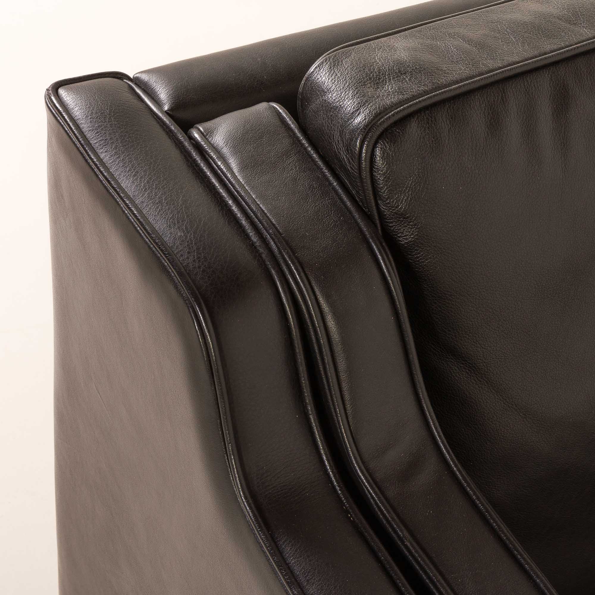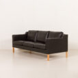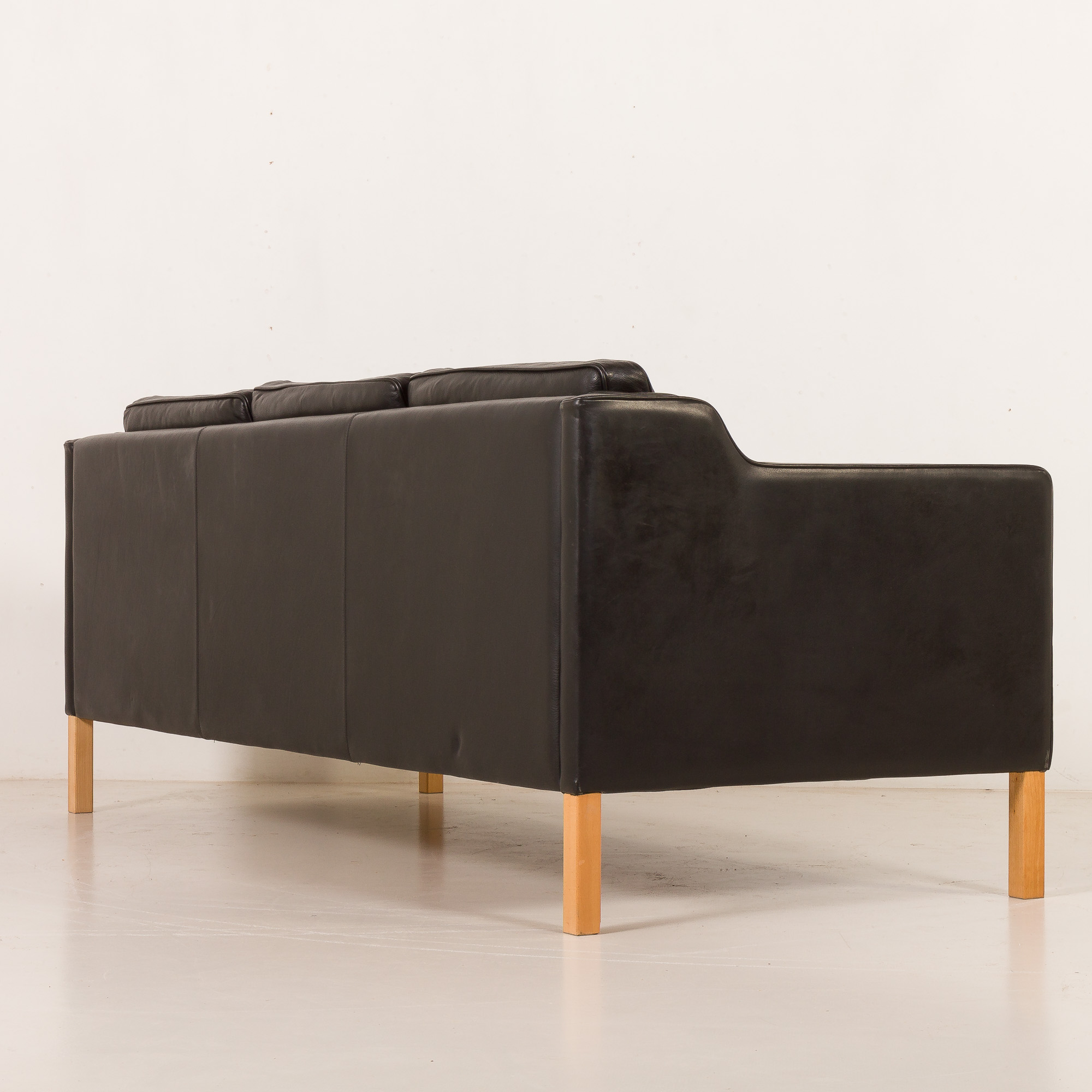 This particualr sofa is upholstered in high-quality black aniline leather, prized for its soft touch, natural grain, and ability to age beautifully over time. The clean, balanced proportions are complemented by solid light oak legs, which add warmth and a subtle contrast to the dark upholstery, emphasizing the sofa’s Scandinavian character. Typical “Stouby” imprint on the liner confirms the origin.