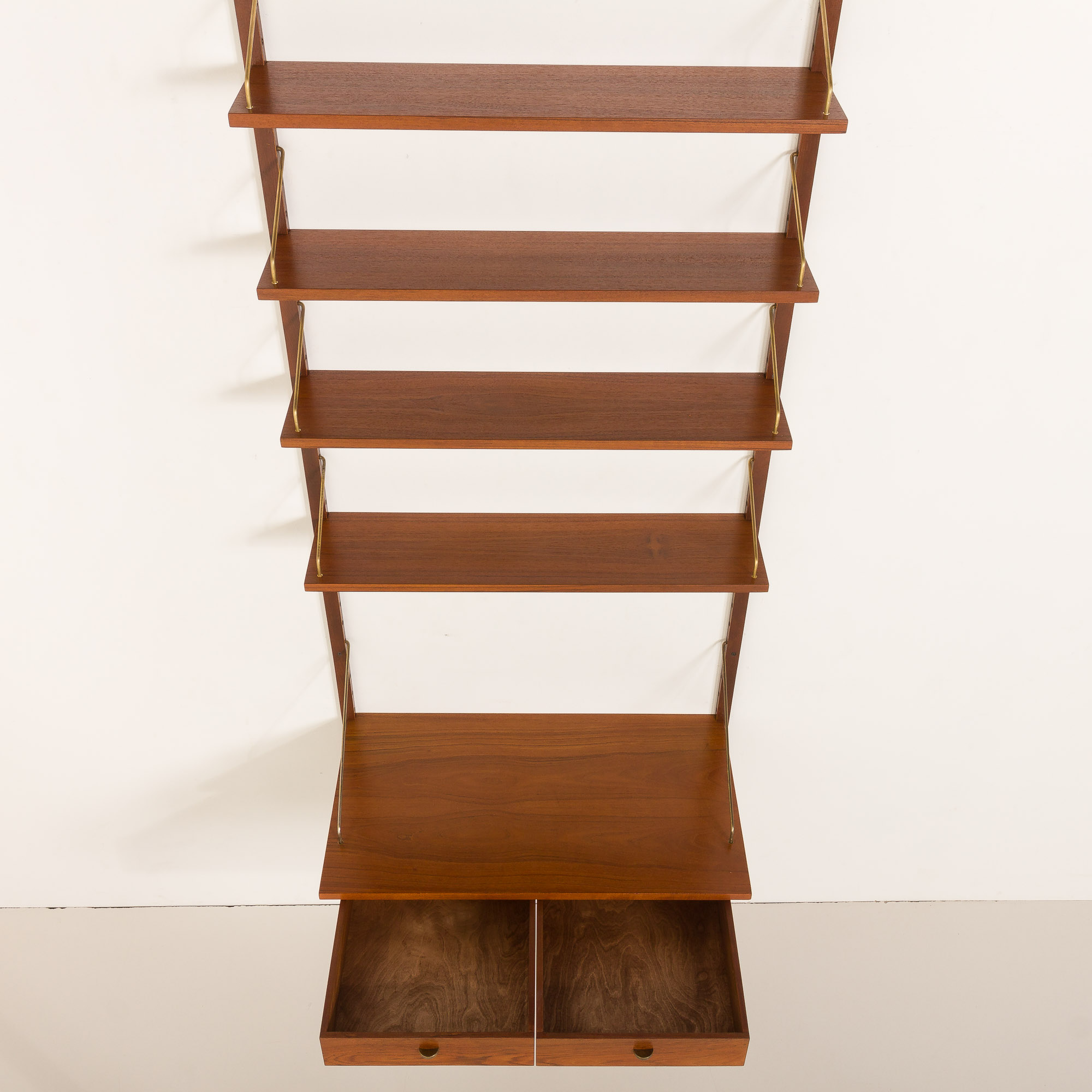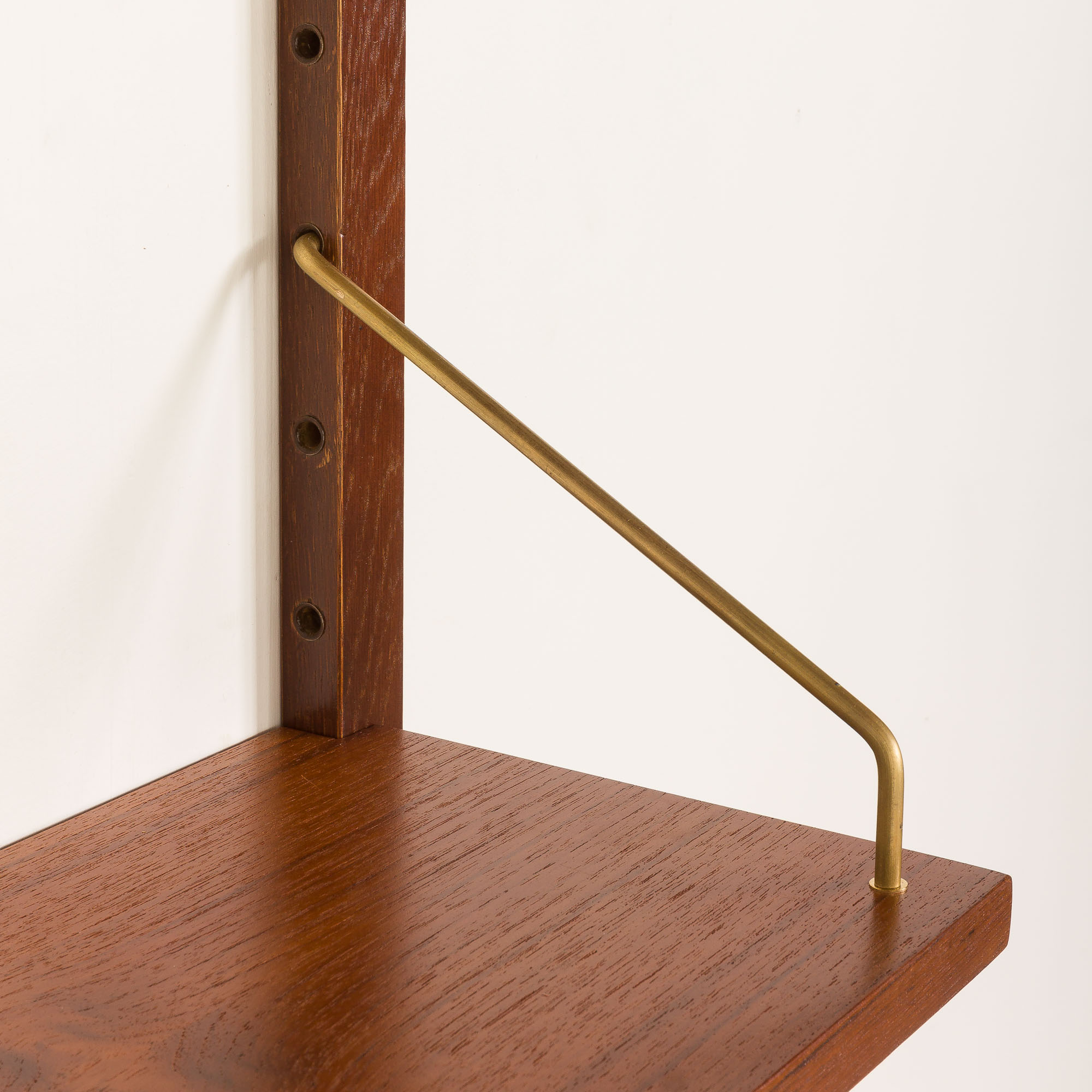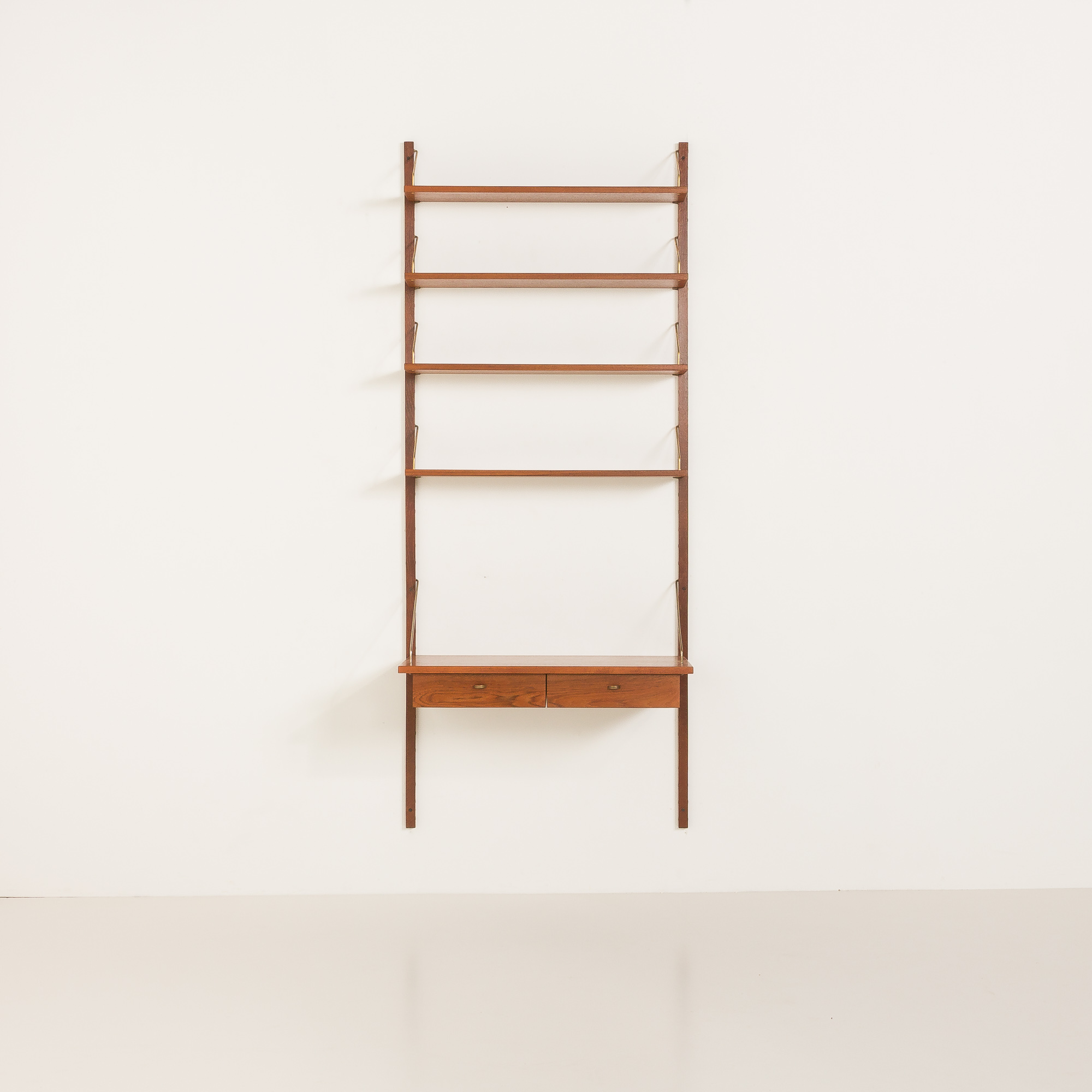 A minimalist teak home office shelving unit inspired by the iconic modular designs of Poul Cadovius from the 1960s. With its compact size and wall-mounted design, it takes up minimal space while offering practical storage solutions.